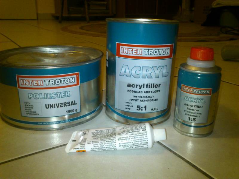 Dasz rade i tymi co masz. Mata tylko na otwory i tylko od wewnatrz ewentualnie w celu wzmocnienia, zalaminowania. Szpachla z włoknem tylko na glebokie doły pow 3-4mm (unikaj bo cieżko sie ją obrabia) a nawet otwory na wylot. Uniwersalna na wierzch do dopieszczenia- na rysy i dołki płytkie ok 3 mm i mniej. Na rysy szpachla natryskowa lub podkład napylany na pare razy.
