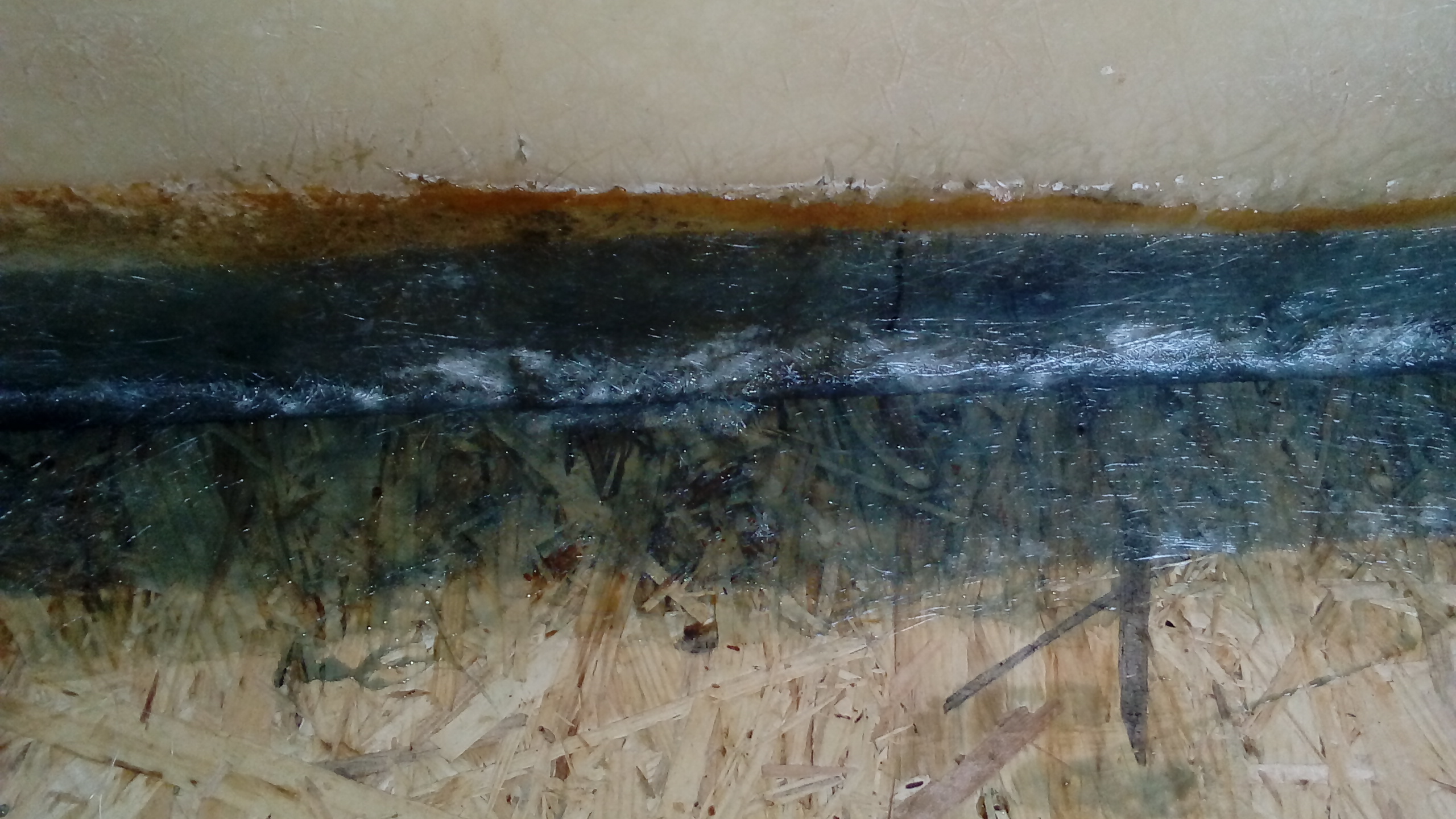 Dzisiaj kolejny etap laminowania. Przy okazji jeszcze zalaminowałem podłogę przy samych drzwiach pasem maty szklanej, gdyż wiem, że to potencjalne miejsce, gdzie lubi się zbierać woda. Rozbierając podłogę, właśnie w tym miejscu była plama. Żeby uniknąć prawdopodobieństwa powtórki, nie dam w to miejsce uszczelki a listwę alu podłogową.