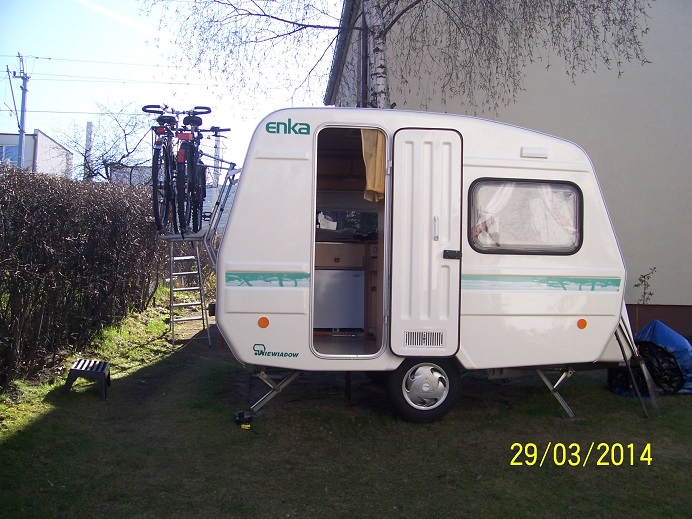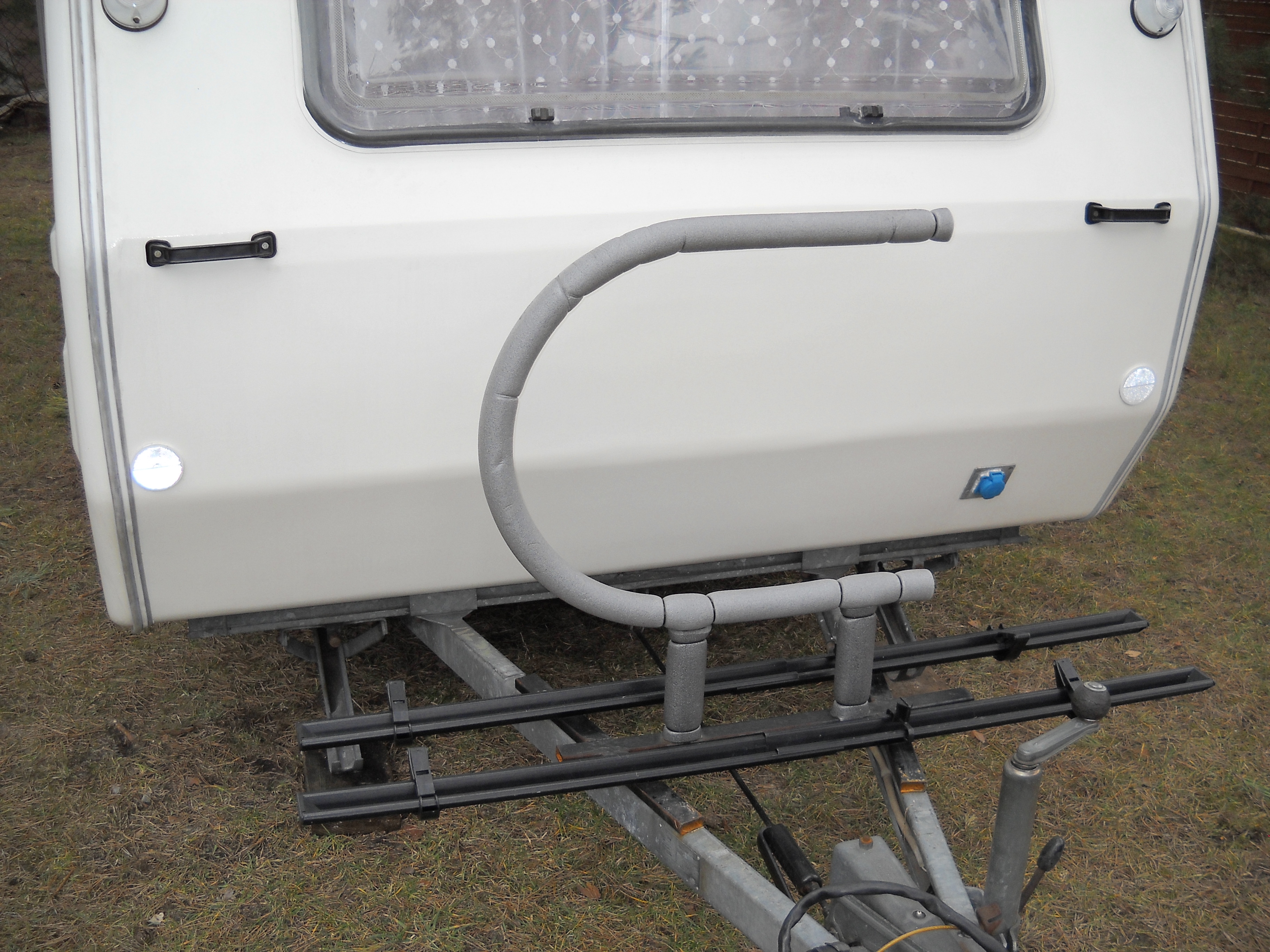 Jak już wczesniej wspomniałem chciałbym "pochwalić" sie pomysłem własnego patentu nie z czystej próżności ale dlatego że do tej pory czerpałem garściami z pomysłów innych osób.Oto bagażnik na rowery mojego pomysłu.Zalety-niski koszt wytworzenia ponieważ rynienki na rowery zostały zakupione na giedzie i pochodzą z używanych dachowych bagażników r owerowych (ok.30 zł ) kilka kształtowników i kawałek rury oraz peszel z pianki do instalacji CO ( 2zł.)Bagażnik jest bardzo stabilny ,montuje sie go w miejsce pojemnika na butle. Nawet otworów nie trzeba wiercić .Ramię ma taki kształt celowo ,ponieważ rowery można wkładać bez jego odchylania (mechanizm taki sprawia że ramię nie jest już takie sztywne) pedały i korby roweru się już o nic nie zaczepiają.Rowery mogą stać bardzo blisko siebie łatwo je wtedy mocować np.za pomoca opasek zaciskowych , nie obcieraja się o siebie i o ramię (pianka) łatwo jest kontrolować sytuację podczas jazdy bo wszystko widać w lusterku wstecznym.Można go stosować zamiennie z pojemnikiem na butle.Wady-oczywiście brak pojemnika, ale ja mam pojemne kombi wieć część bagażu mogę tam zmieścić, a butle montuje we wnetrzu przyczepy w szafce pod kuchenką.Skoro w domu można tak montować to czemu w przyczepie by nie.Wystarczy taka 2,5kg o ile ktoś nie ma trumy bo pewnie wtedy to za mało.Pozdrawiam może pomysł sie komuś spodoba.Zdjecia i opis można zamieścić w dziale zrób to sam ale to juz decyzja moderatora.