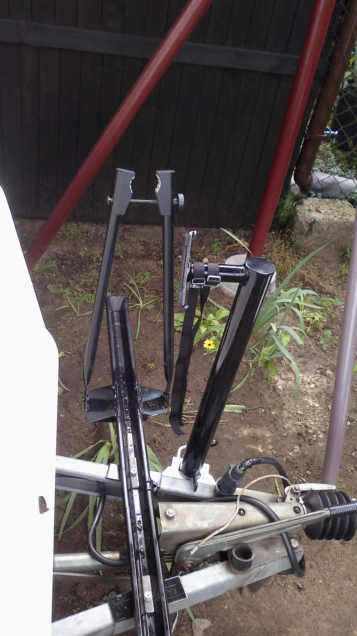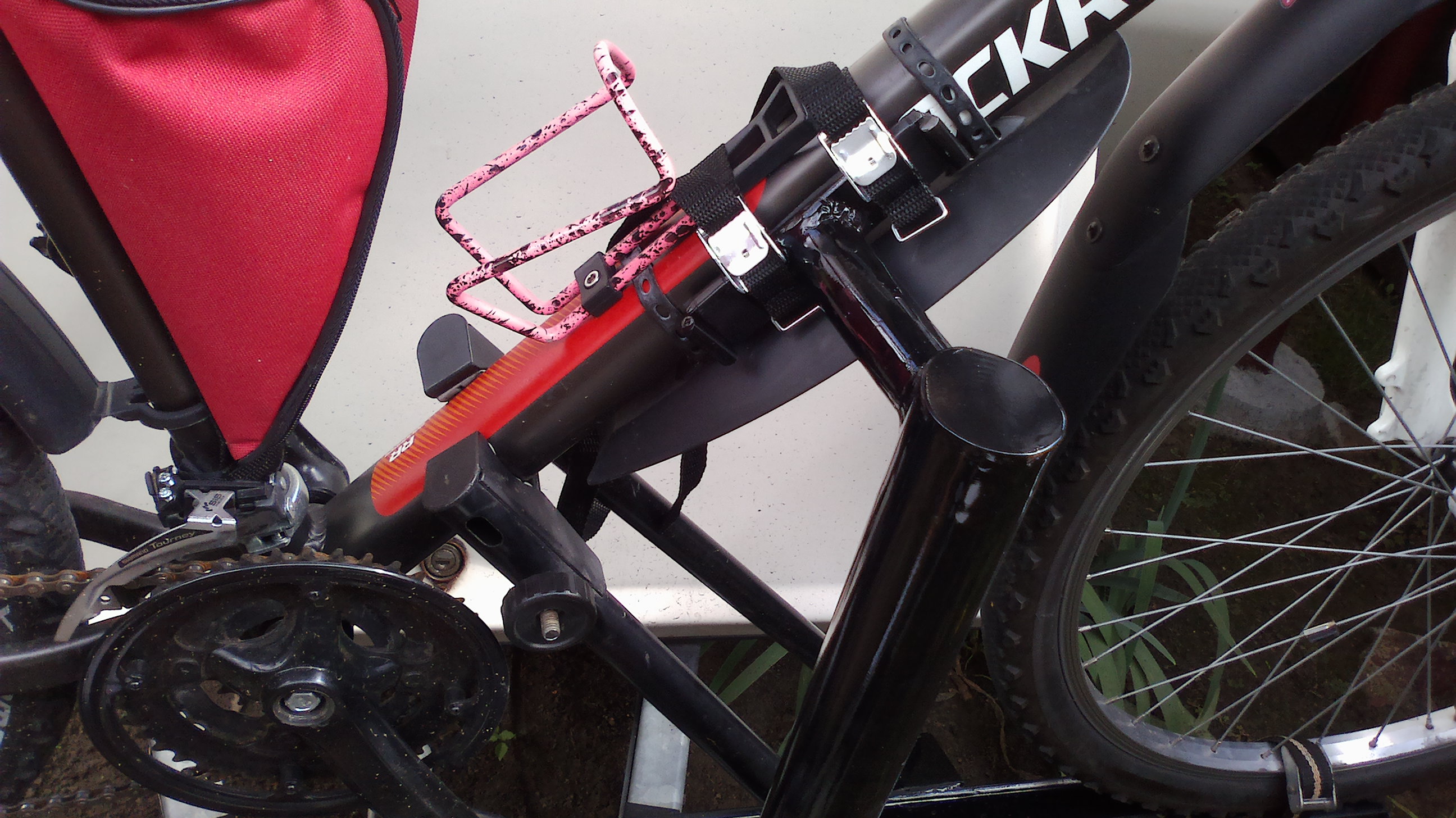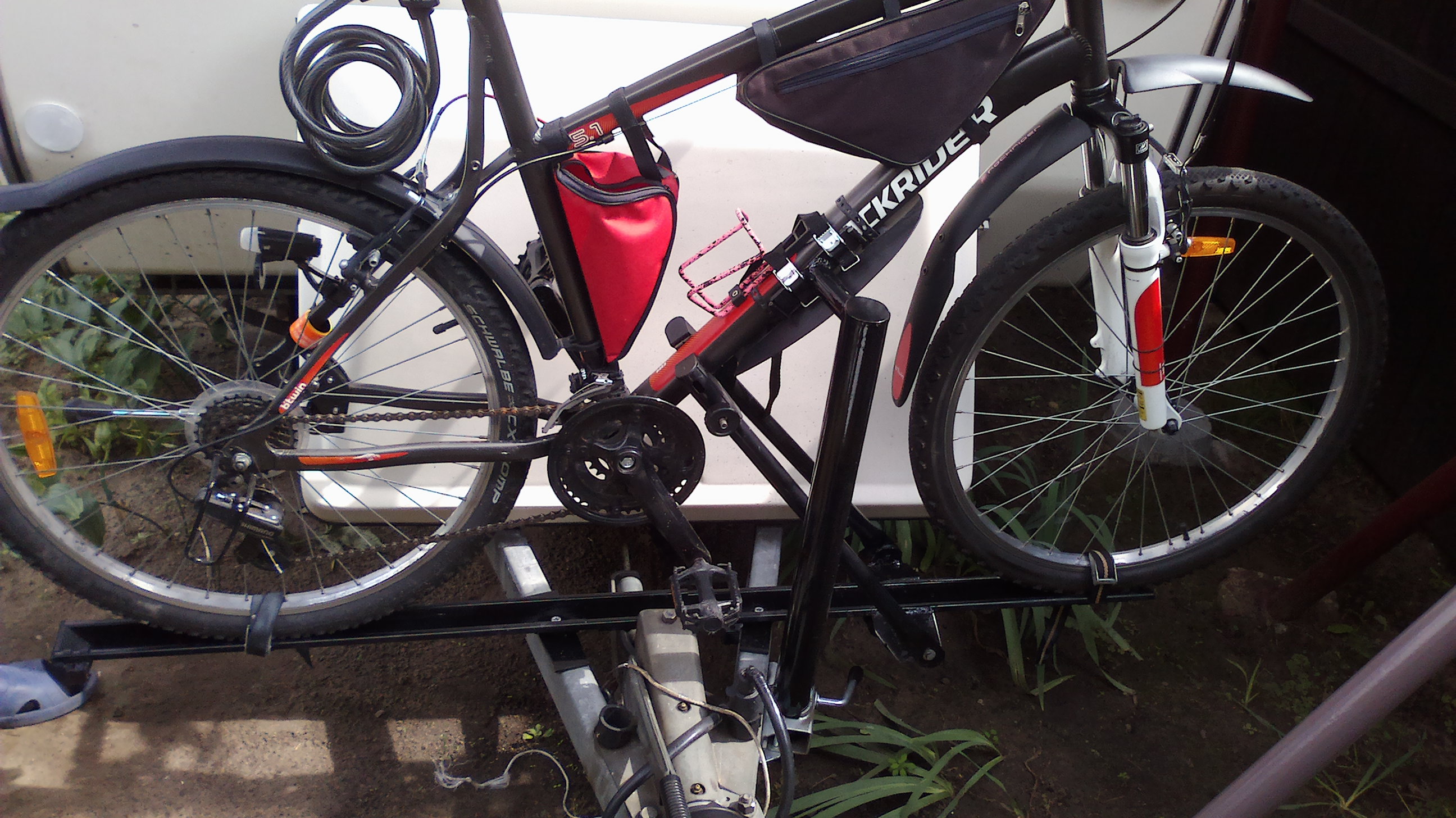 Nie wiem czy ktoś wpadł na ten pomysł ale ja tak . Mocowanie roweru do rury w miejscu koła manewrowego . Bardzo stabilne rozwiązanie . A koło i tak w czasie jazdy wyciągam .