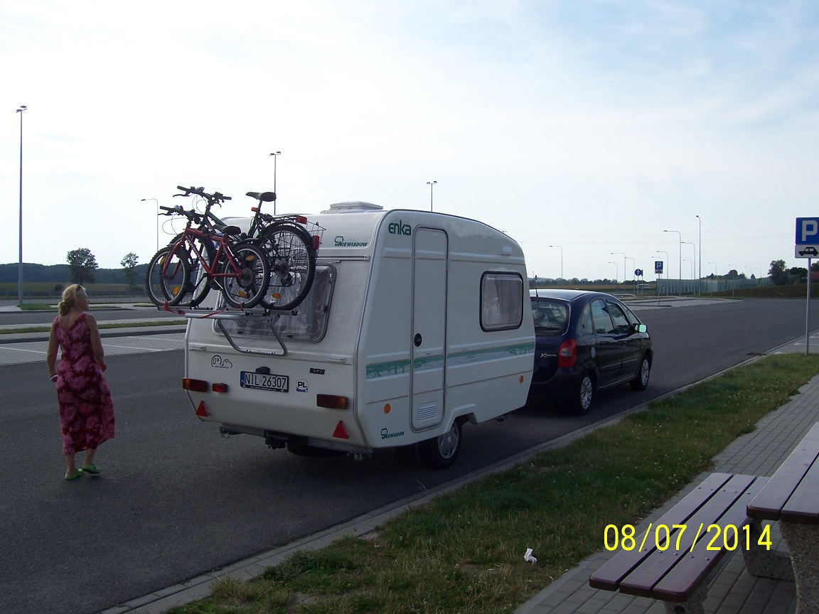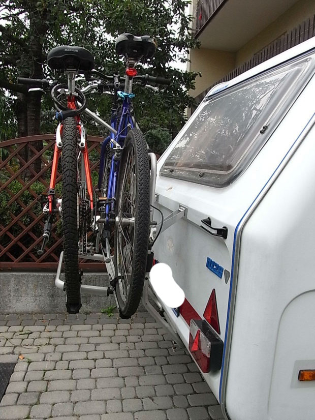 wożę rowery na dachu ale myślę nad przełożeniem nad kufer. Tyl przyczepy odpada jest lodówka zlew woda i przedsionek jak z tylu wyląduje to na haku mi przyczepę podbija