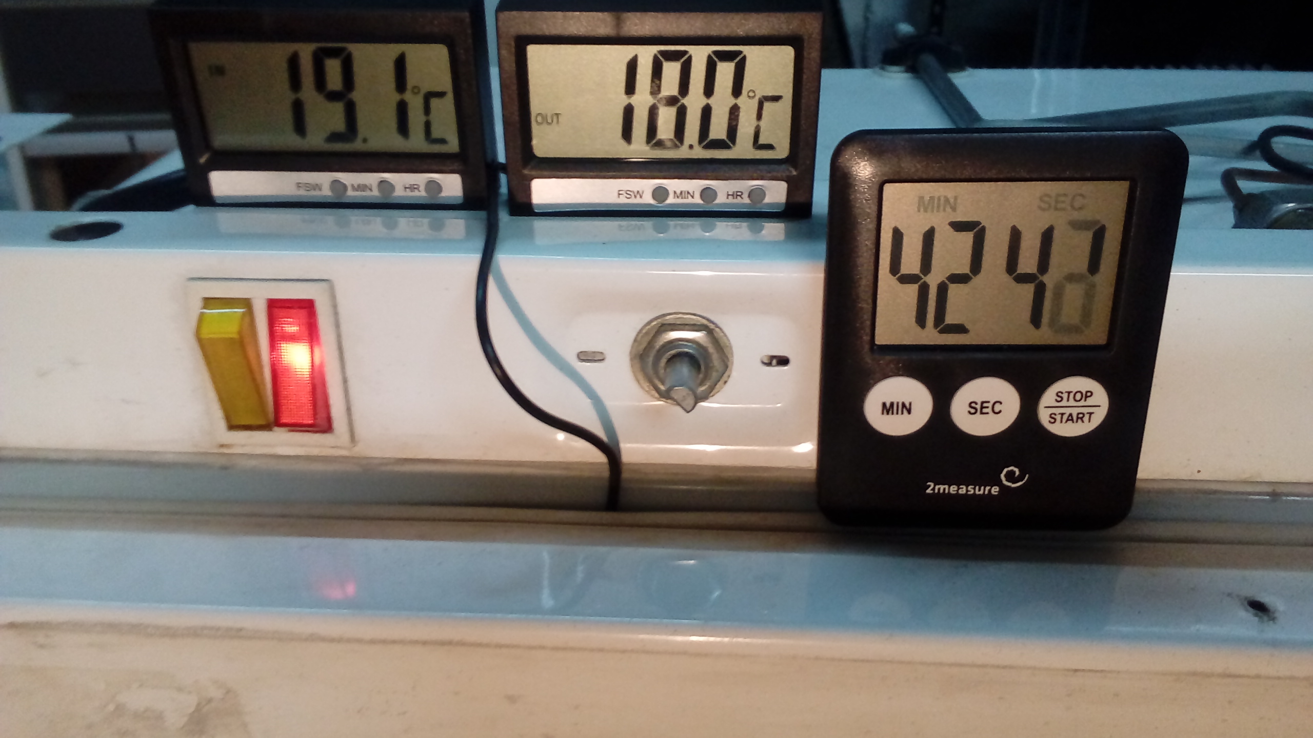 Termometr z lewej strony pokazuje nam temperaturę wewnątrz pomieszczenia IN 20,0 stopnia. Termometr z prawej strony OUT pokazuje nam temperaturę wewnątrz lodówki 18,5 stopnia. Obok tego mamy kolejne urządzenie, którym jest stoper i jego wskazania 00,00