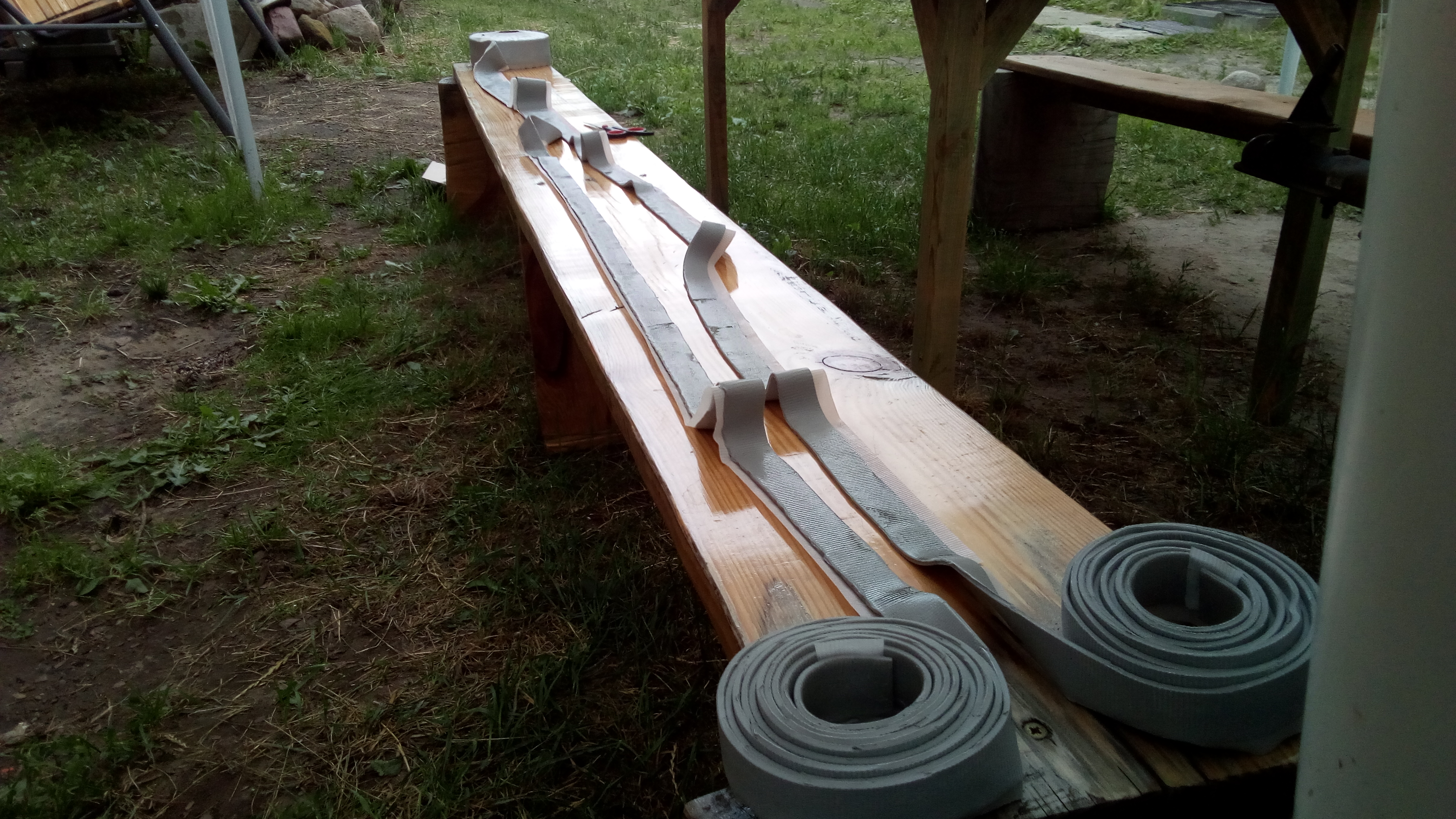 Co do taśmy - za radą z forum przeciąłem ją na pół na odcinku, jaki potrzebny jest do listwy. Trzeba uważać, żeby się nie polepiły między sobą, bo rozdzielić nie uszkadzając przekroju jest raczej nie możliwe. Bardzo się lepi do siebie. Z resztą do wszystkiego prawie, włącznie z paluchami! Nie pamiętam teraz ile idzie jej na listwy, ale szpula, którą kupiłem starczyła mi na wszystkie listwy jakie idą na budzie. I jeszcze mi zostało trochę.