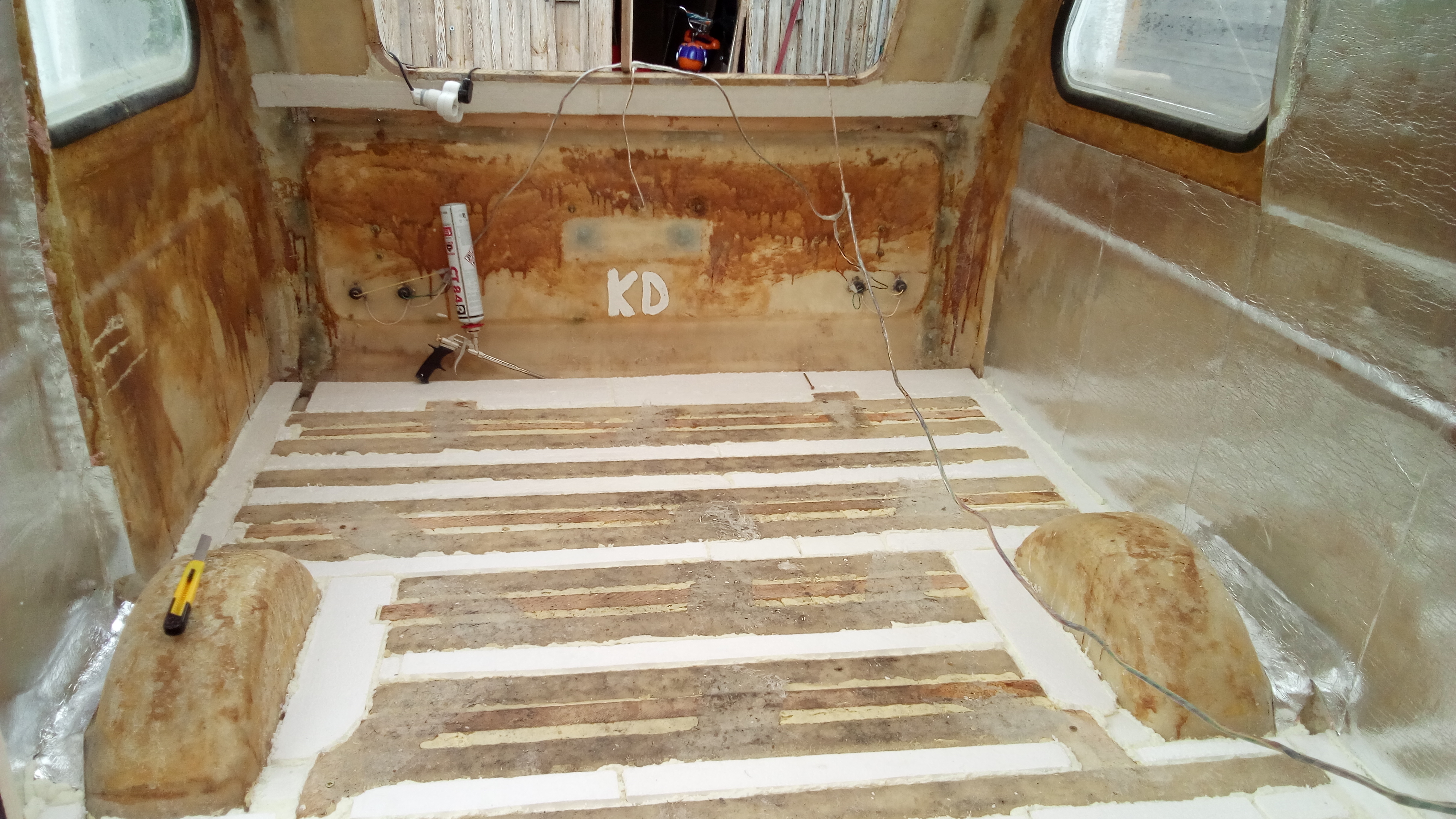 Następnym etapem była podłoga. Co się dało oczyściłem, odkurzyłem. We wręgi powklejałem styropian na pianę: