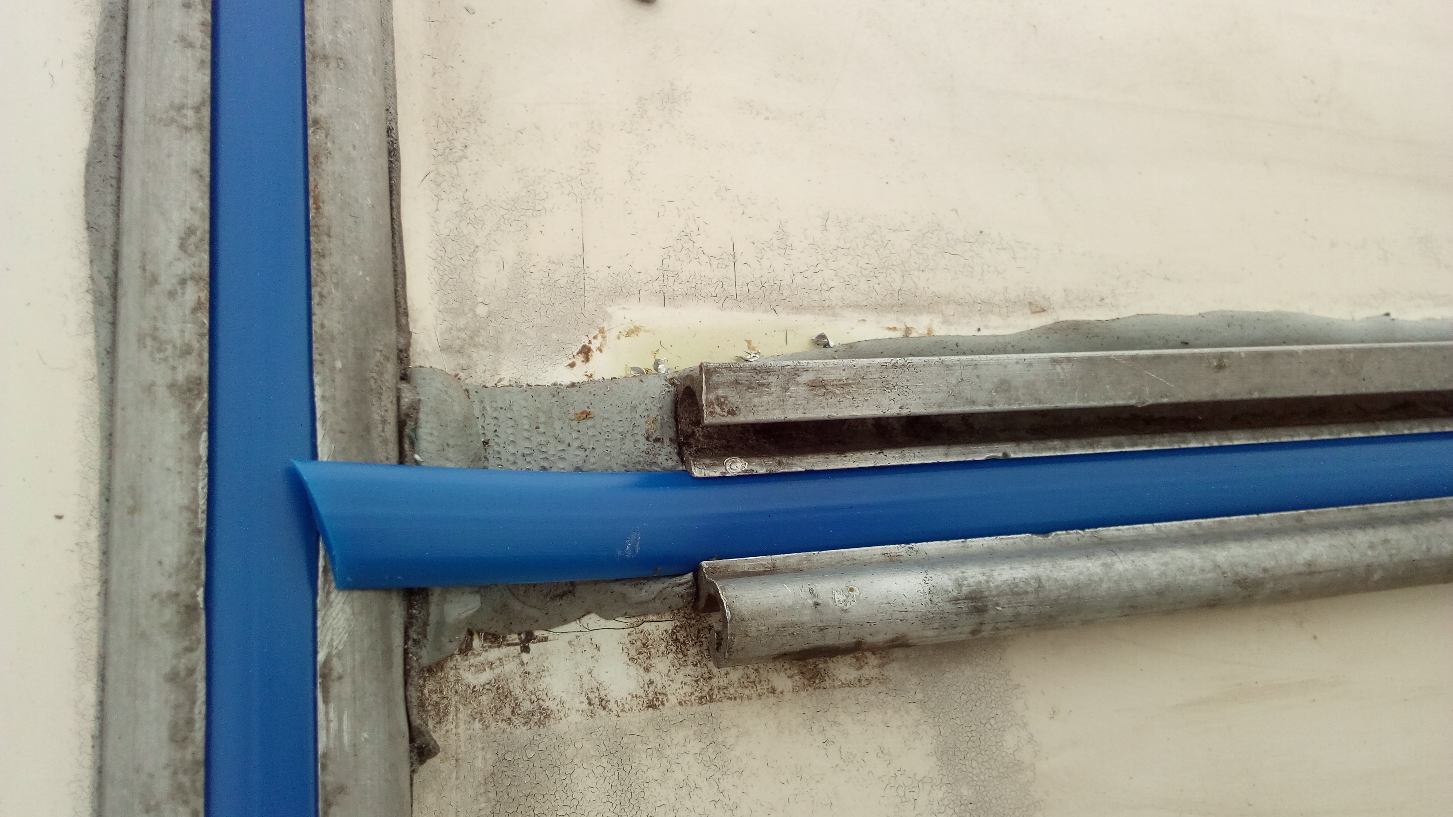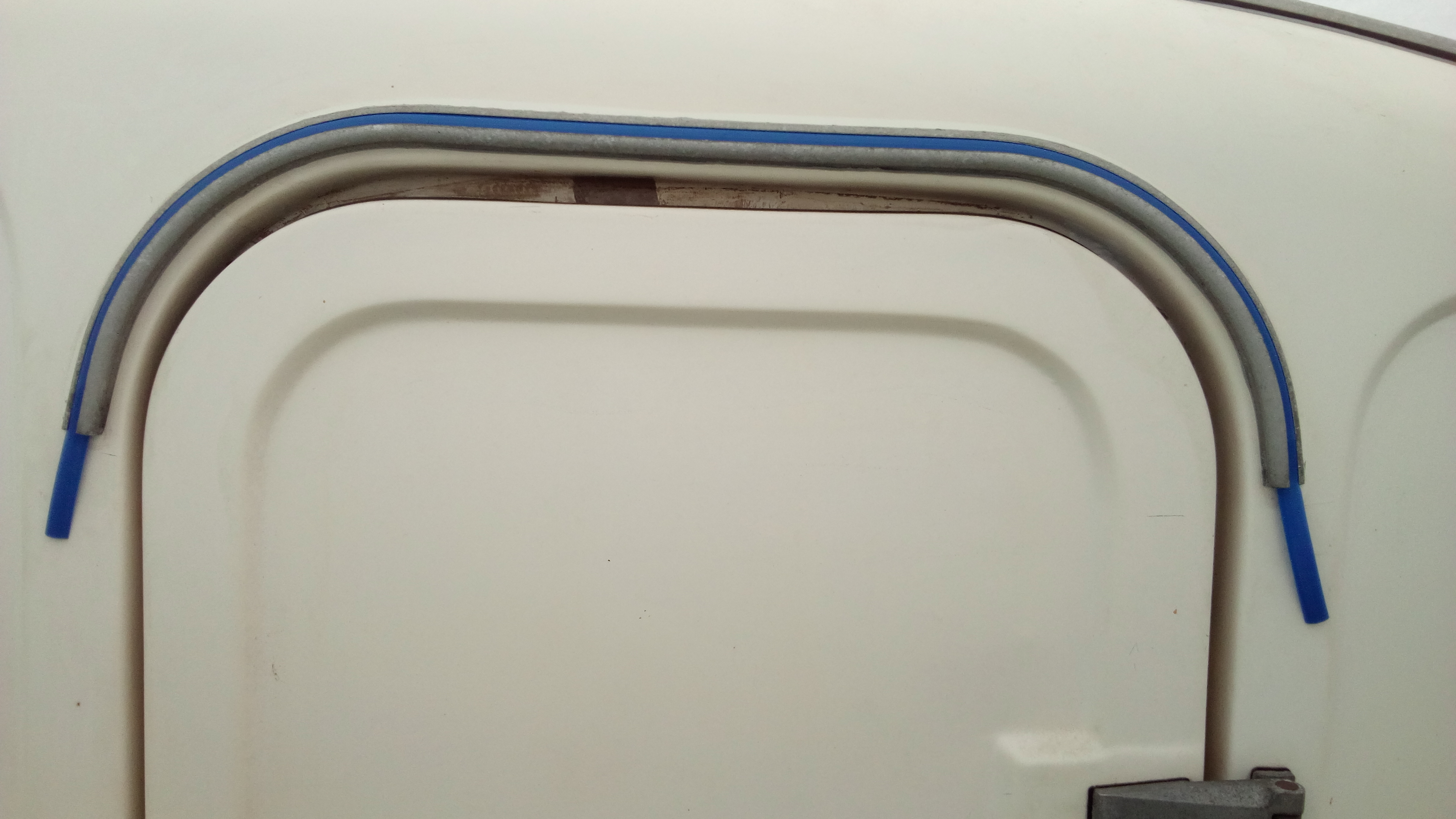 Rada dla potomnych - jak bym robił jeszcze raz, też bym kupił 50, ale już nie ciął bym jej na pół. Z tego co kojarzę, listwy nie są równej szerokości, ale nie o to chodzi. Chodzi o to, że po przecięciu mamy te taśmy za szerokie! Uciął bym tyle, aby nie wystawało poza listwę, szczególnie listwa, gdzie wpychamy przedsionek. Podczas skręcania listew nadmiar taśmy wychodzi i to dużo. Na chwilę obecną nie wiem jeszcze jak usunąć ten nadmiar z listwy do przedsionka - nie pozwoli mi wepchnąć sznura, będzie się czepiać i klinować. Bez usunięcia na równo z krawędzią przy budzie nie ma co podchodzić z przedsionkiem. Podejścia nie ma za bardzo, bo jest ten rant co siedzi w nim przedsionek. Musze jakieś zmyślne urządzenie tnąco - zbierające zaprojektować i zebrać tą taśmę. Kopa normalnie :-(.