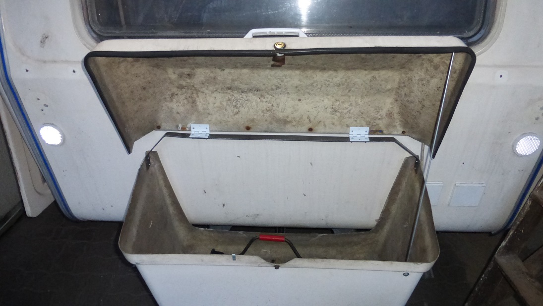 Bardzo prosta podpórka, budżetowa ale się sprawdza. Na zdjęciu widać pas przechodzący przez nakrętki z dużym uchem wystające z dna kufra. Te nakrętki są na śrubach łączących kufer z kątownikami wspawanymi wcześniej do ramy. Pasem będzie przypięta butla Nano żeby stała sztywno. Wyjąłem oryginalny laminatowy stelaż na butle i zbiornik na wodę więc trzeba to było jakoś rozwiązać. W kufrze nie będzie żadnego stelaża a po bokach butli będzie można postawić dwa zbiorniki na wodę.