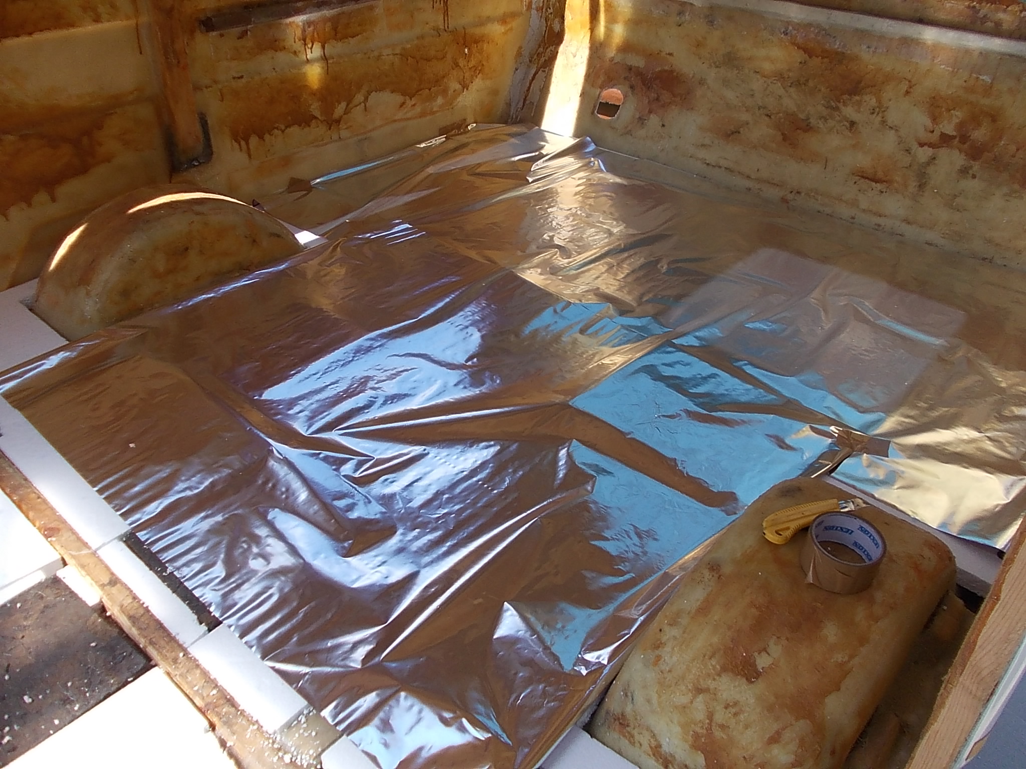 Wymienione 2 listwy nad przednim oknem,wlaminowane deseczki nad bocznymi szybami aby móc przykręcić lampę przedsionka ,czujniki itp. Wlaminowane są również listewki na ścianach bocznych i przedniej które będą częścią łóżka. Wycinając kiedyś otwór pod trumę przeciąłem listwę podłogową ; naprawiłem to dodając poprzeczkę - myślę ze wystarczy.Powiększyłem również ów otwór pod piec bo był trochę przyciasnawy.Cała buda oczyszczona ze starej tapicerki. Śpieszyłem się z laminowaniem bo sprzedawca twierdził że żywica po 15 minutach to beton ale 30 minut spokojnie upłynęło zanim zaczęła twardnieć.