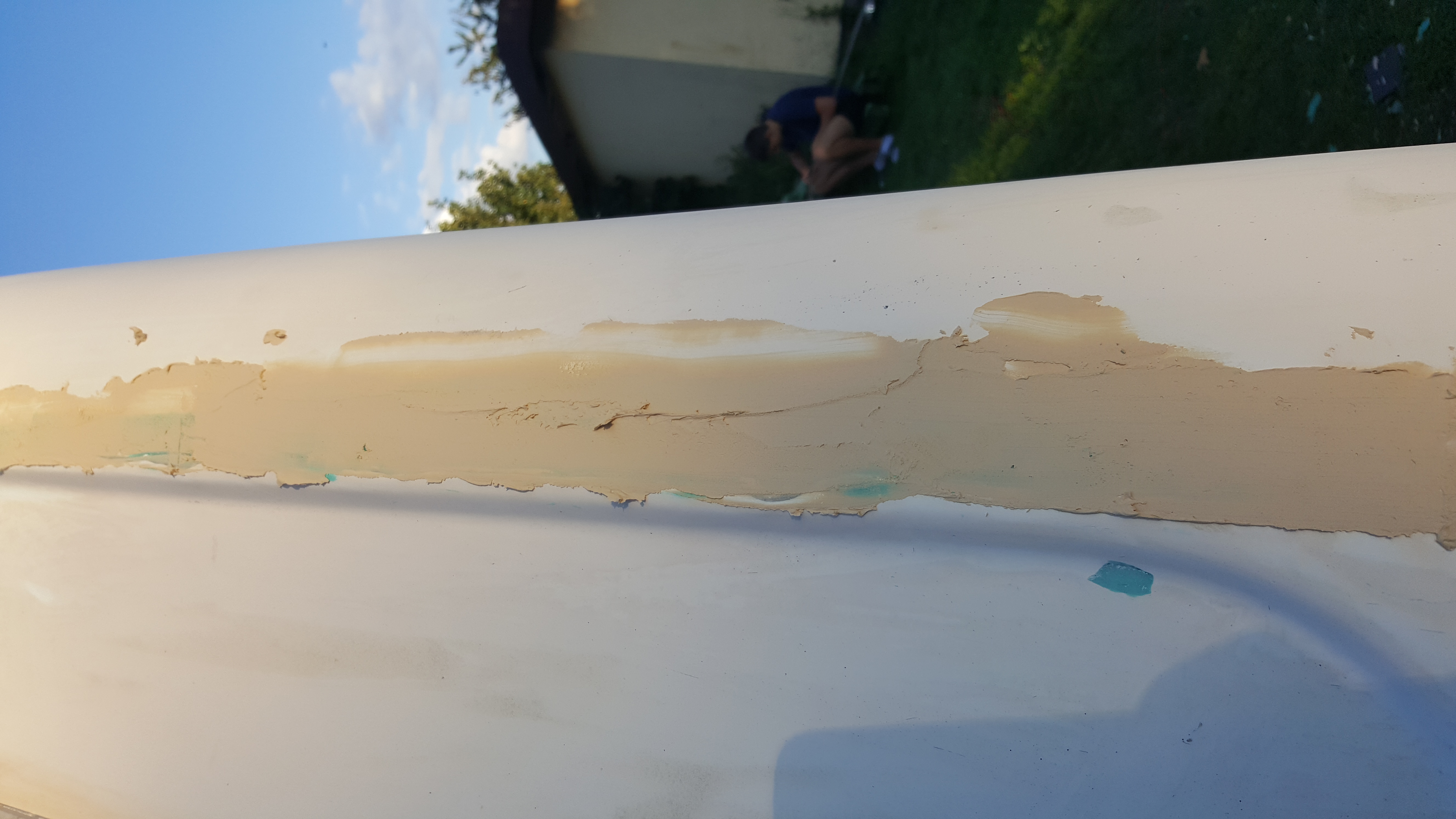 Zdecydowałem się na wyrównanie powierzchni bo po zdjęciu drugiej listwy okazało się że już chyba nasi tam byli i nieudolnie kleili jakimiś silikonami dziury. Więc kupiłem żywicę i matę (takie zestawy u sklepie budowalnym) i załatałem większe dziury. Reszta pójdzie zwykła szpachla z włóknem.
