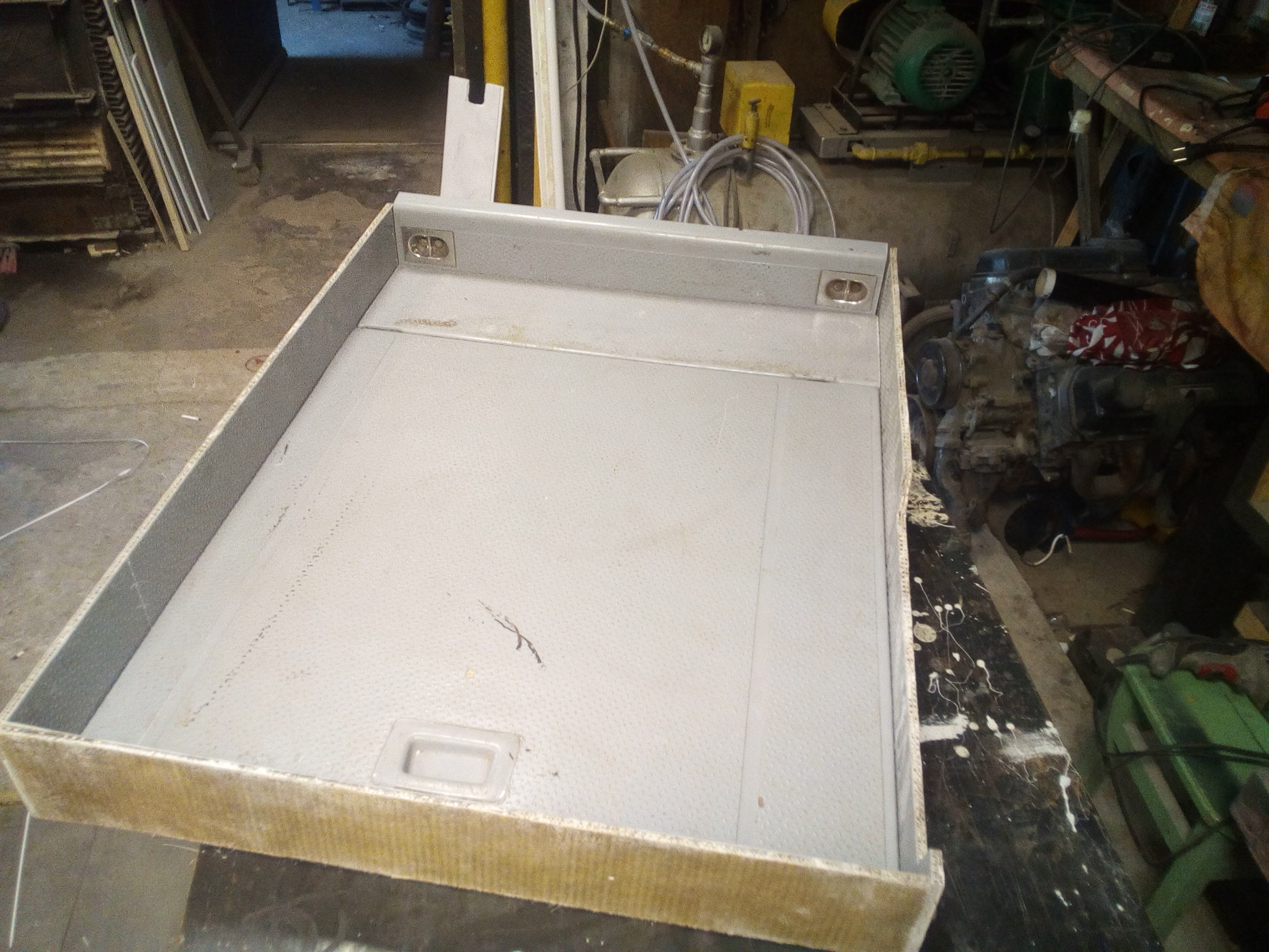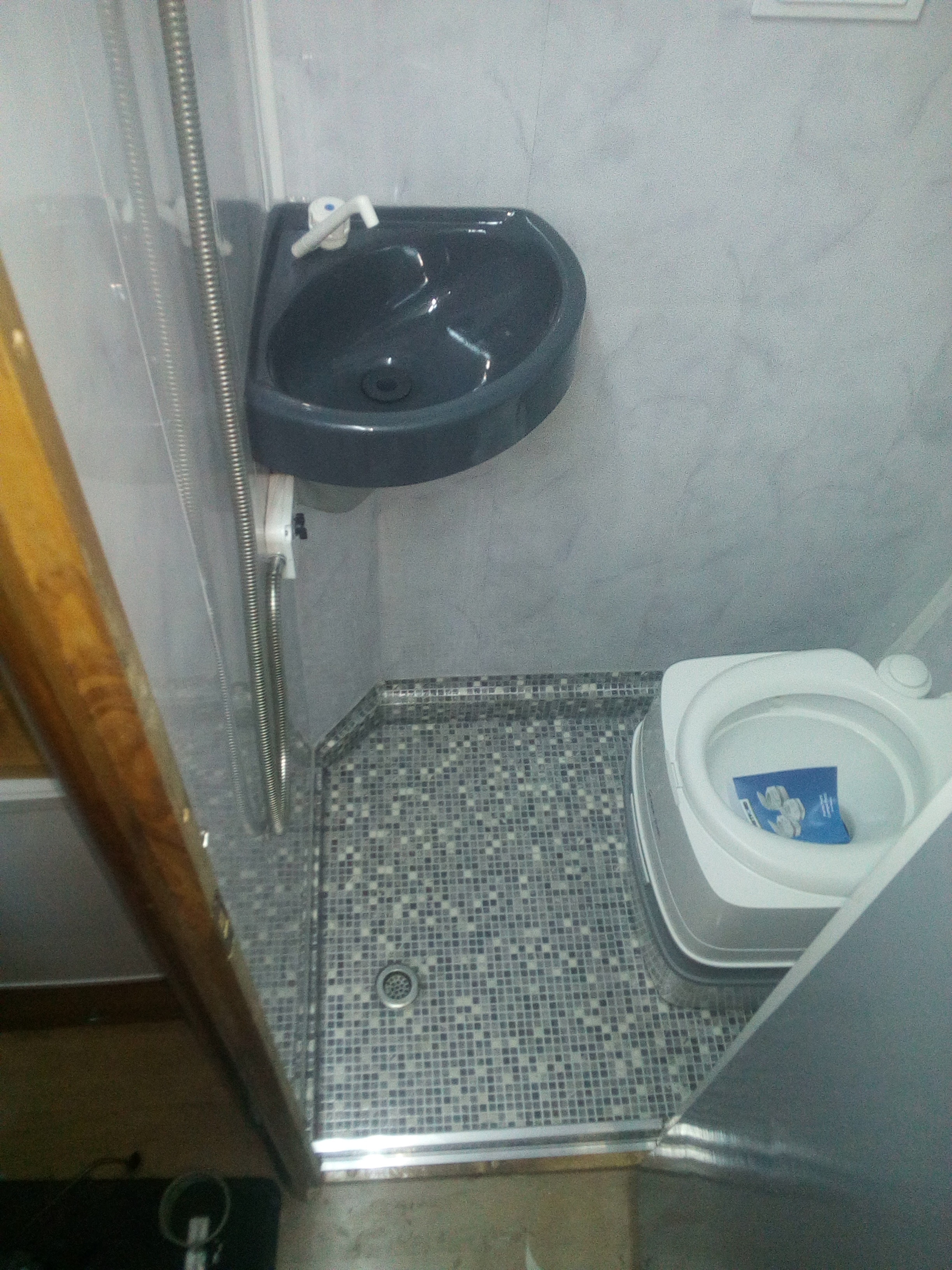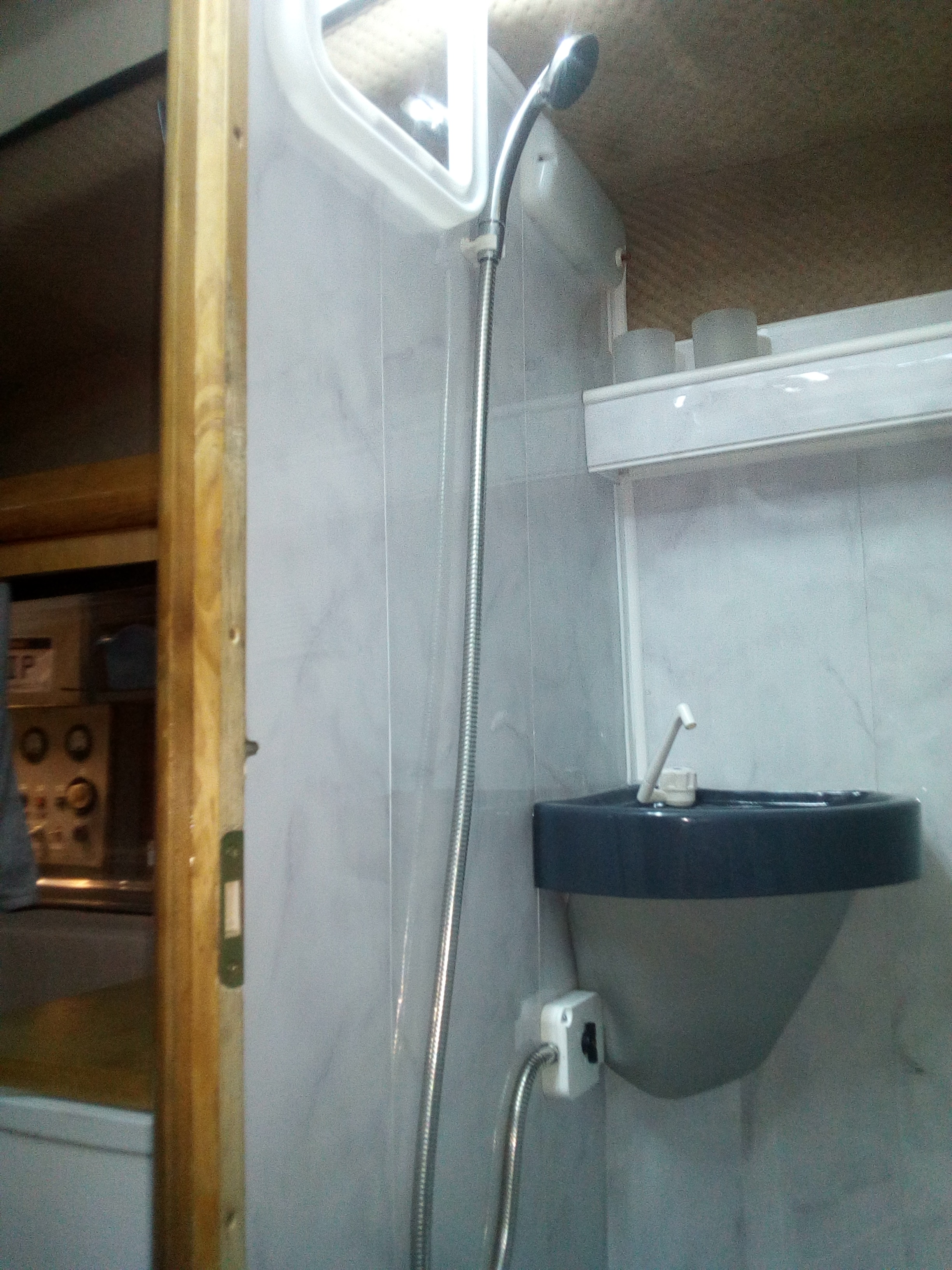 kotarka praktycznie będzie potrzebna w miejscu drzwi. Brodzik miałem robić z tej podłogi od poloneza, ale uznałem że to za dużo pie...nia zatem zrobiłem ze sklejki którą wysmarowałem szkłem wodnym, a na to nakleiłem gumolit. Inspiracją do tego był ten Pan https://www.youtube.com/watch?v=NIoDB5Yf_MY wodę do słuchawki doprowadziłem przez trójnik od umywalki i włącza się ją kranem od umywalki tylko przekręcić lekko żeby pompkę włączyć i po odkręceniu zaworku obok umywalki leci