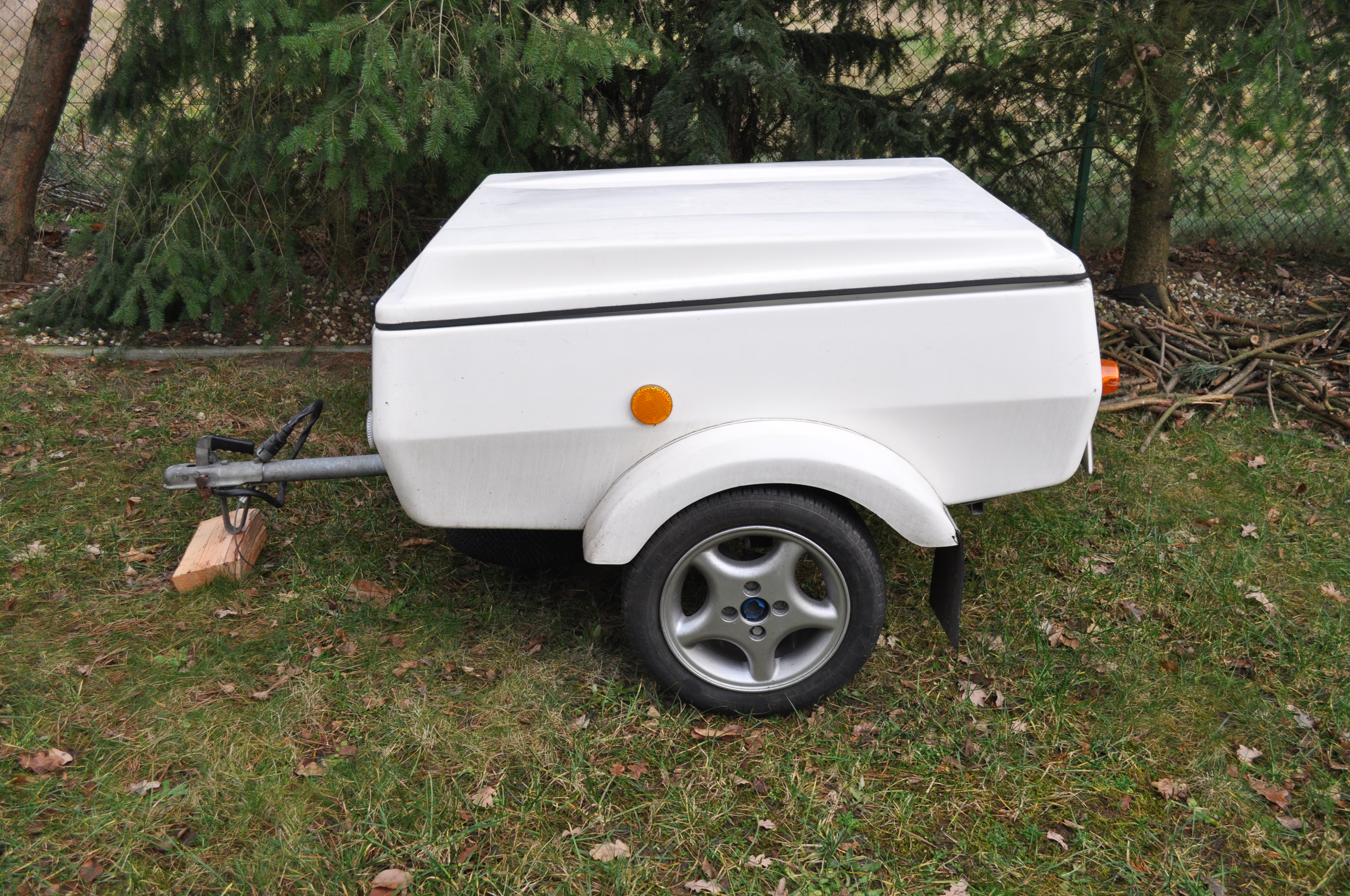 Przyczepka otrzymała alufelgi z oponami 165/55/13, nowe osłony przeciwbłotne, oświetlenie tylne, oświetlenie tablicy rejestracyjnej, kliny w listwy, zawiasy (poprzedni właściciel poskręcał zawiasy blachą jak się połamały...), trójkąty odblaskowe, światła pozycyjne boczne i w sumie tyle. We wnętrzu wykładziną oklejona i zrobione przegródki...
