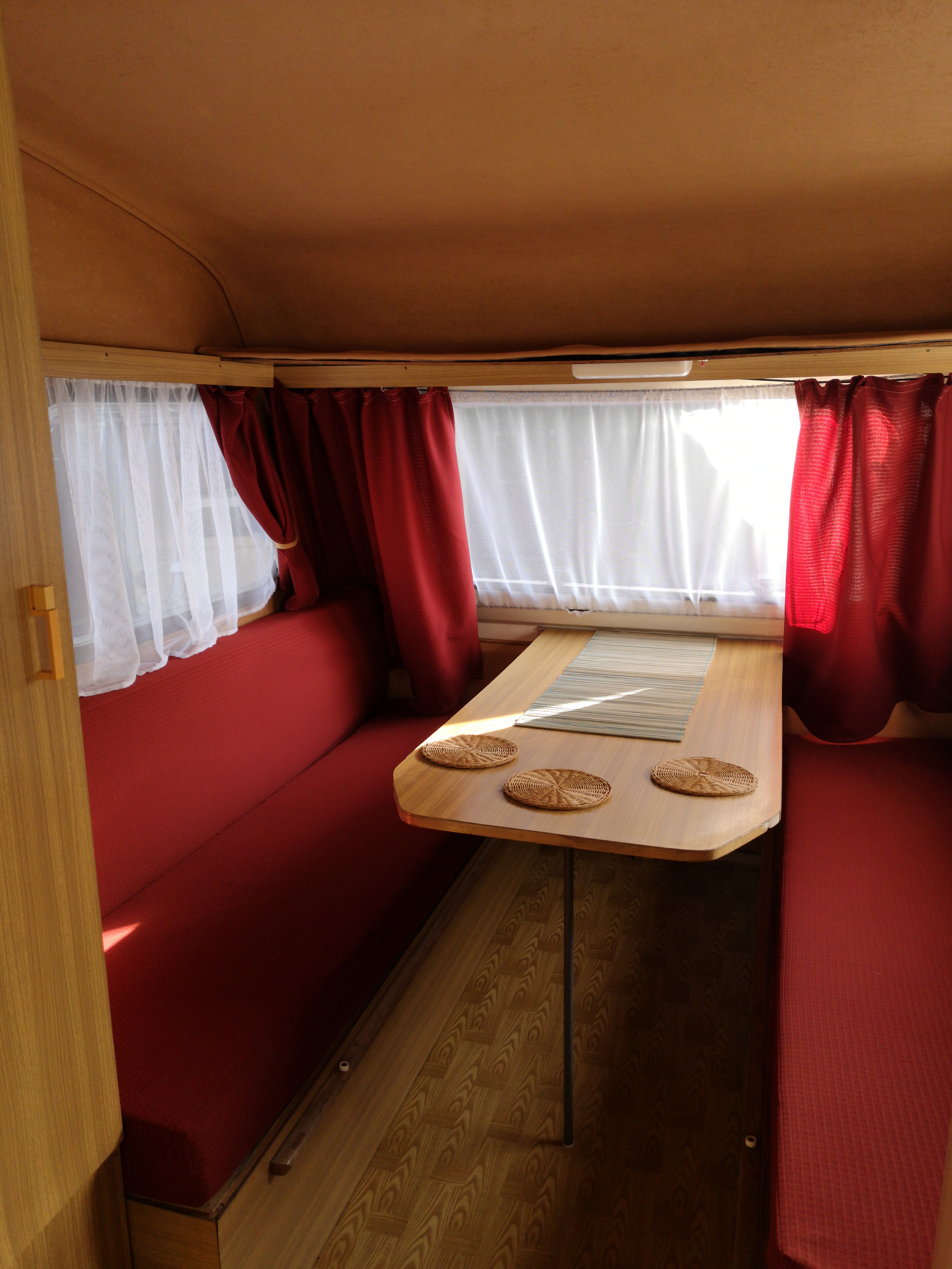 Jaki kolor tapicerki wybrać? Oryginalny bordo czy lepiej miodowy żeby rozjaśnić wnętrze przyczepy?