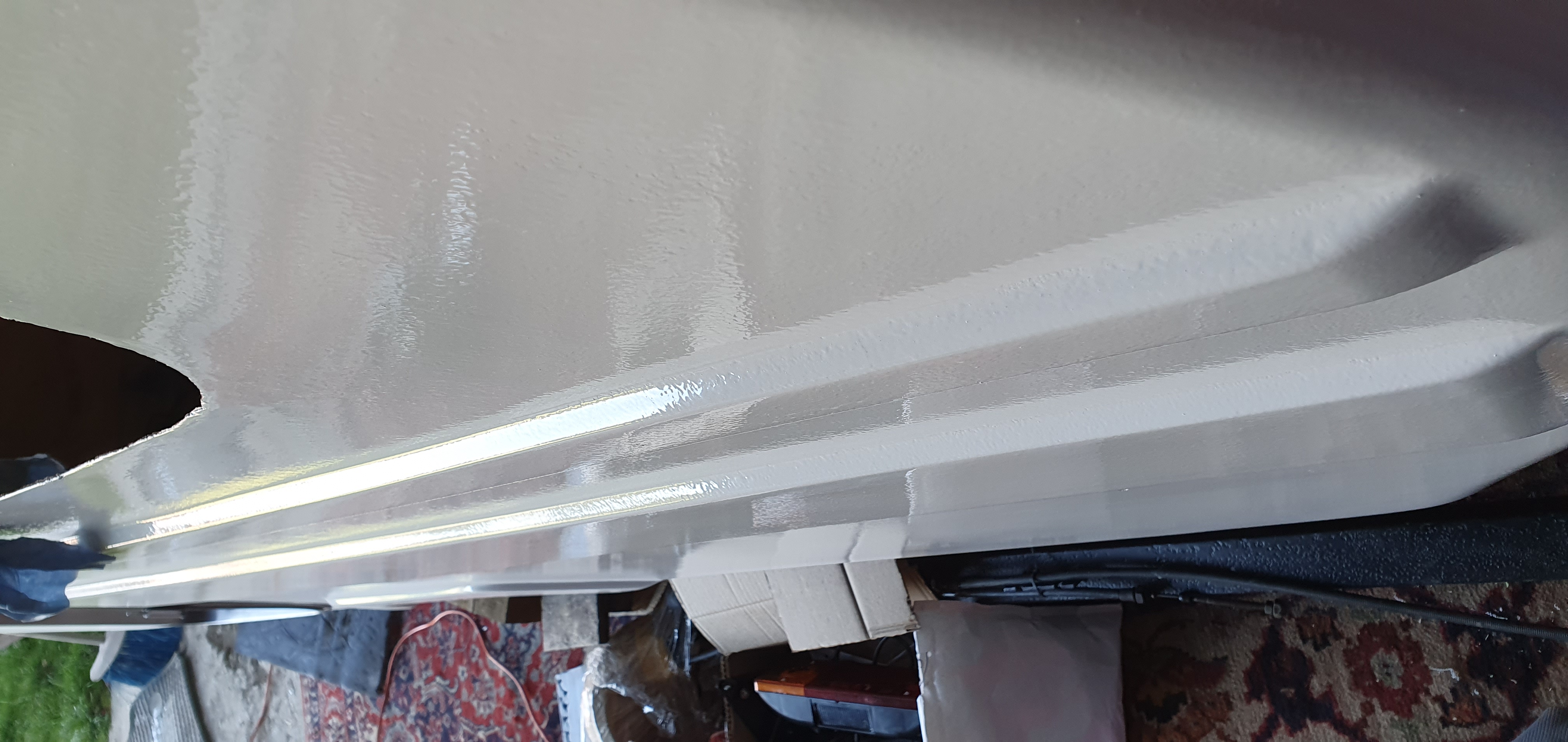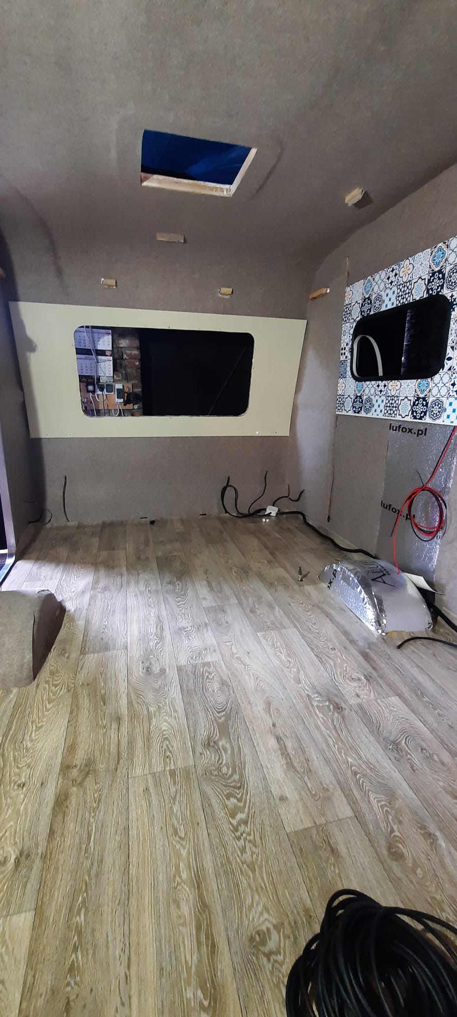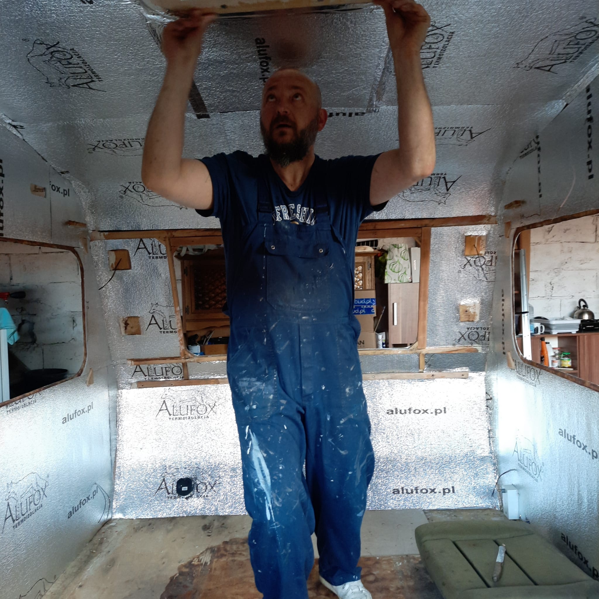 Dzień spędzony na zaklejaniu łączeń izolacji i przyklejaniu największego płata tapicerki. Tym razem bez pędzla