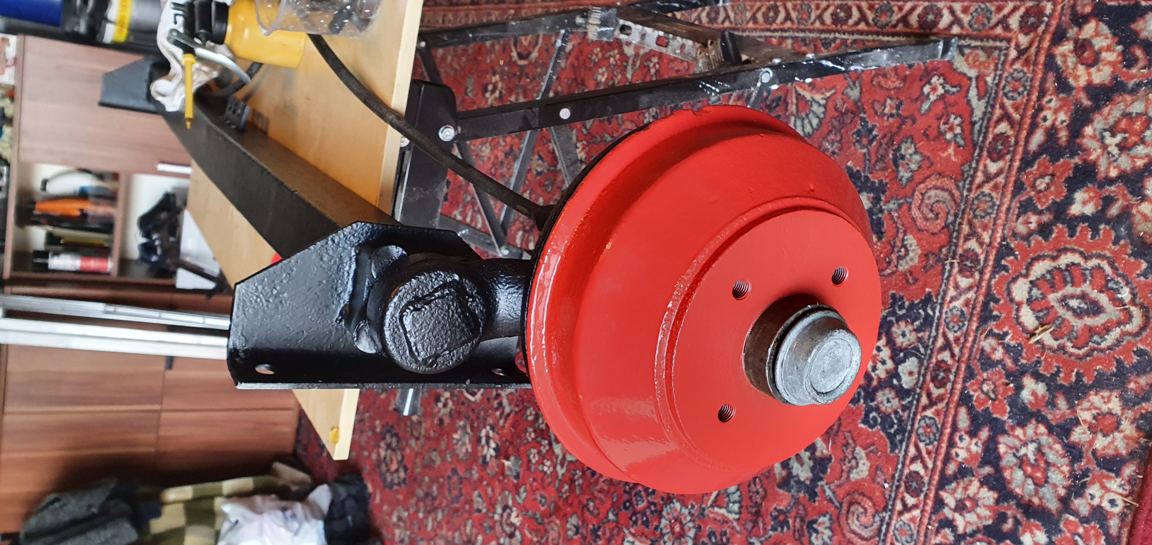 , nadał się idealnie. Całość skręcona i uszczelnione taśmą butylową. Kosz na butle zrobiony pod swoje potrzeby, podstawa na kątowniku stalowym 20x20, miejsce na dużą i małą butlę oraz baniak wody. 8 oczek do mocowania. Wpadnie jeszcze gniazdo 230v do grzałki wody. Ośka miała być nie ruszana ale przy demontażu hamulca/druta podjąłem szybką decyzję o zdjęciu i dokładnym przeglądzie. Szczęki i łożyska jak nowe. Całość wyczyszczona i odświeżona, bębny poszły w najszybszy kolor