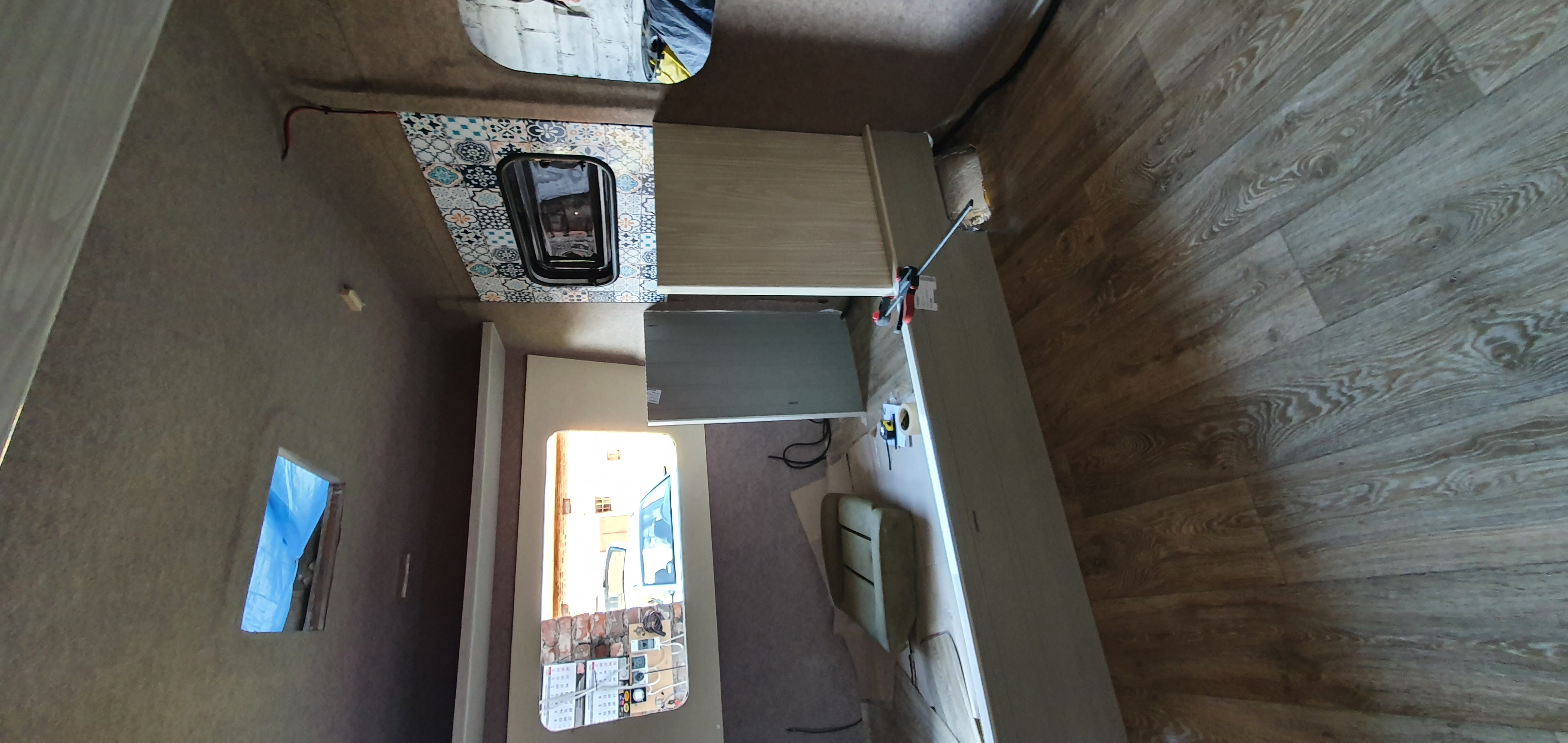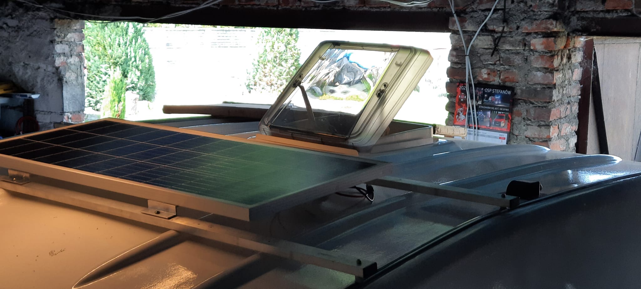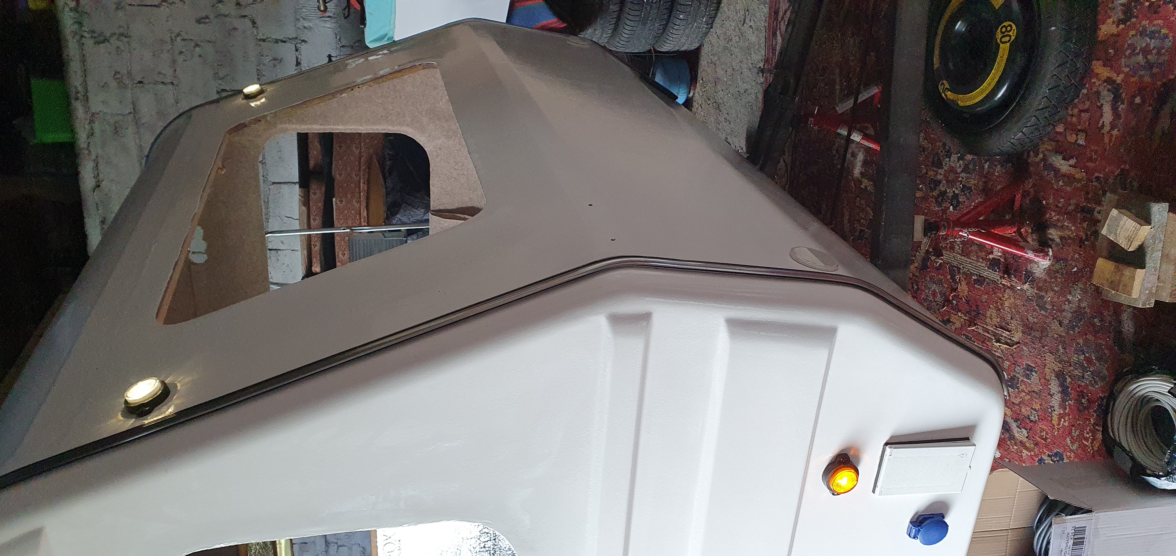 Buda nabiera wyglądu. Chciałem zachować oświetlenie oryginalne więc tylne lampy zostały od Ursusa, przednie i boczne kształtem nawiązują do PRL, całość firmy WAŚ, oczywiście ledowe. Oświetlenie tablicy ori zostało przerobione i też jest ledowe, wyciąłem moduł z lewej lampy tylnej. Listwy zamontowane na taśmie butylowej 20x2, śruby M4x15 z nierdzewki, nowe otwory, uszczelnione wszystko Sikaflexem. Na bocznej ścianie zamontowałem gniazdo 230V i gazowe. W środku nie będzie kuchenki, gotujemy na zewnątrz. Panel montuję na dwóch profilach alu 40x20 przykręconych do dachu śrubami M6x60 w miejscach listew na centymetrowych dystansach aby zniwelować nierówności wręg. Zastanawiam się czy wręgi łapać śrubami do profilu, na pewno wzmocniłoby to dach. Ościeżnica drzwi również na taśmie butylowej 15x1, wkręty w nowych otworach.