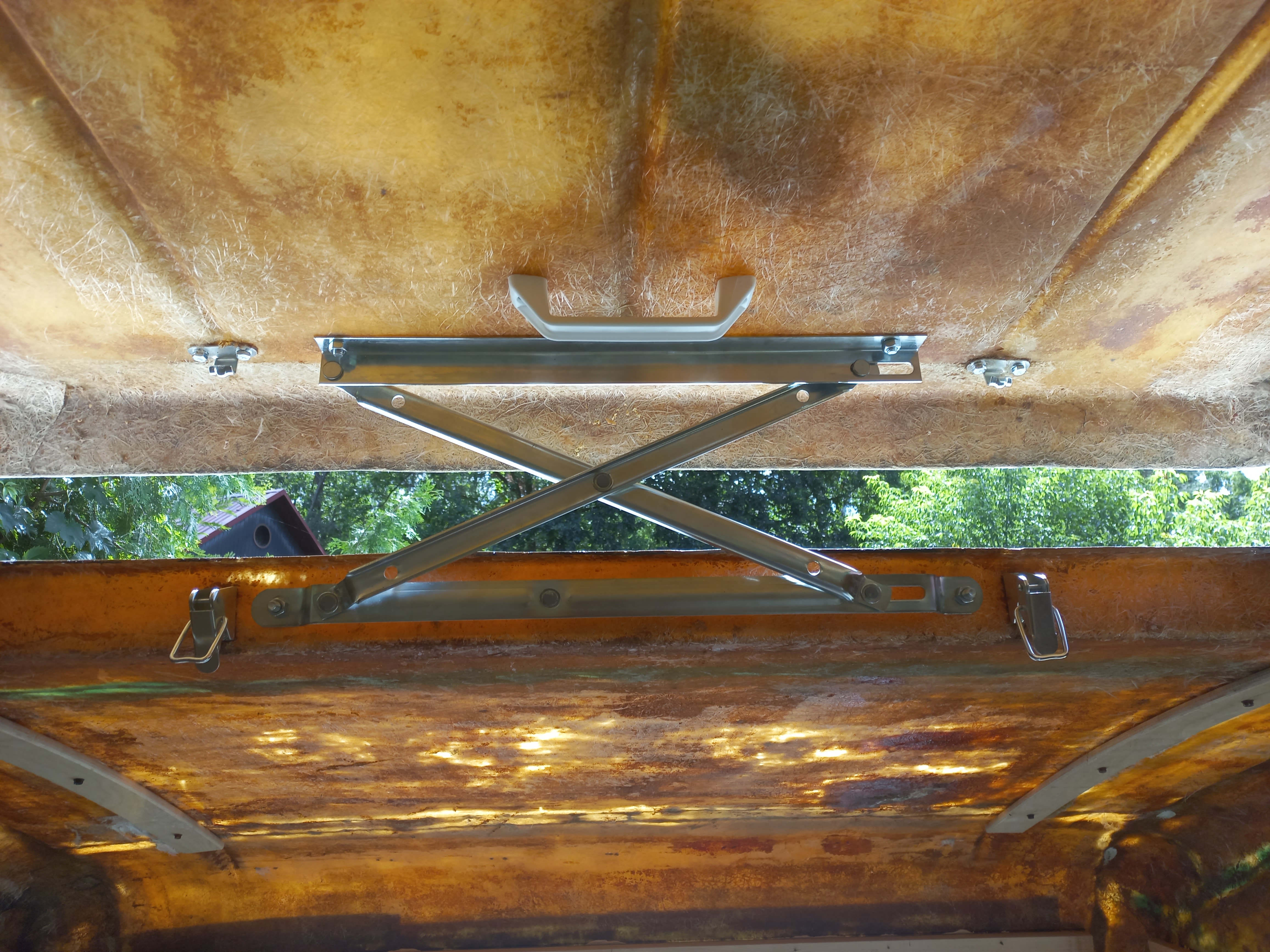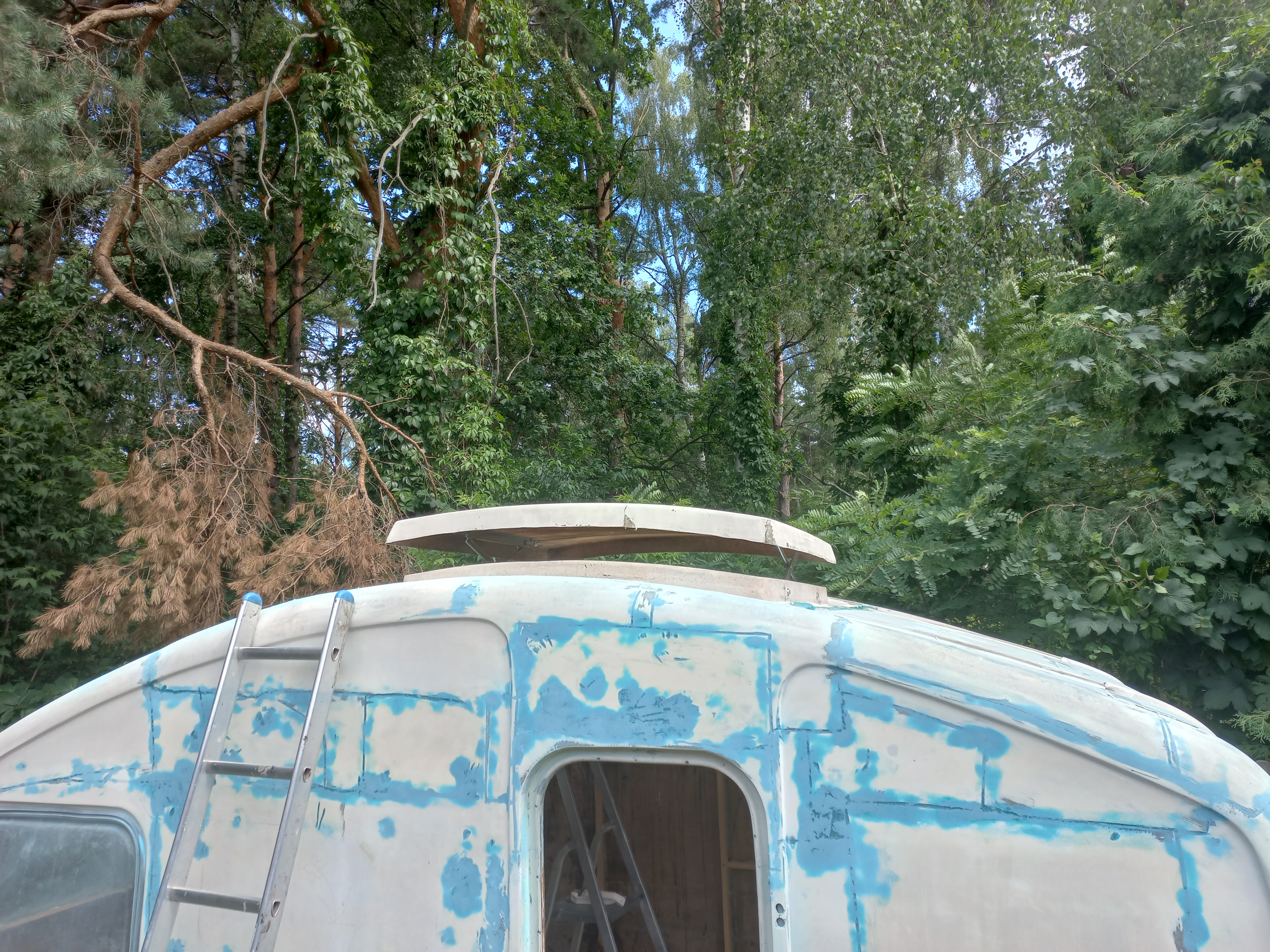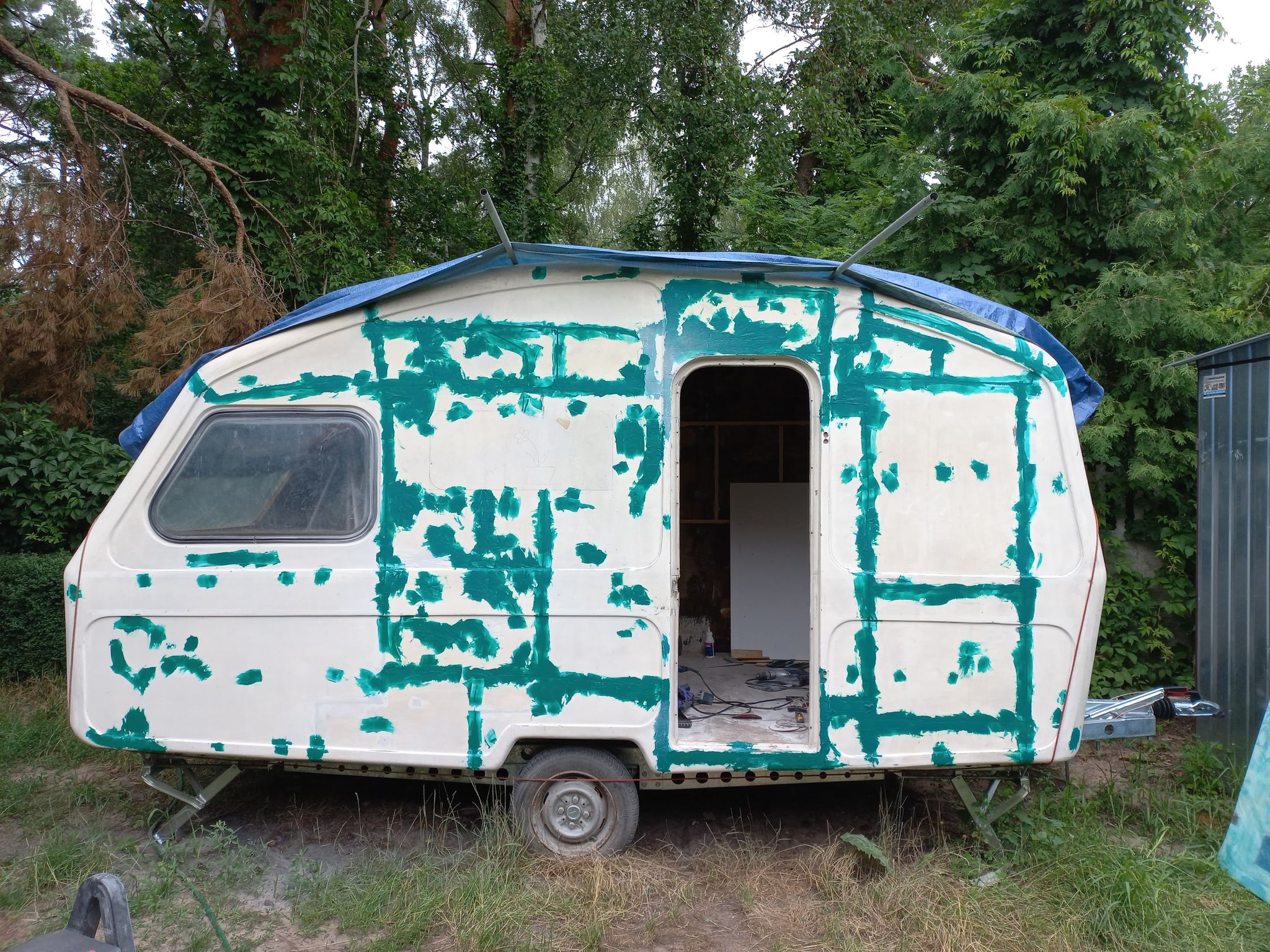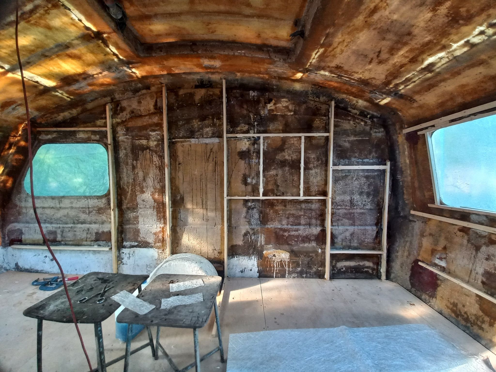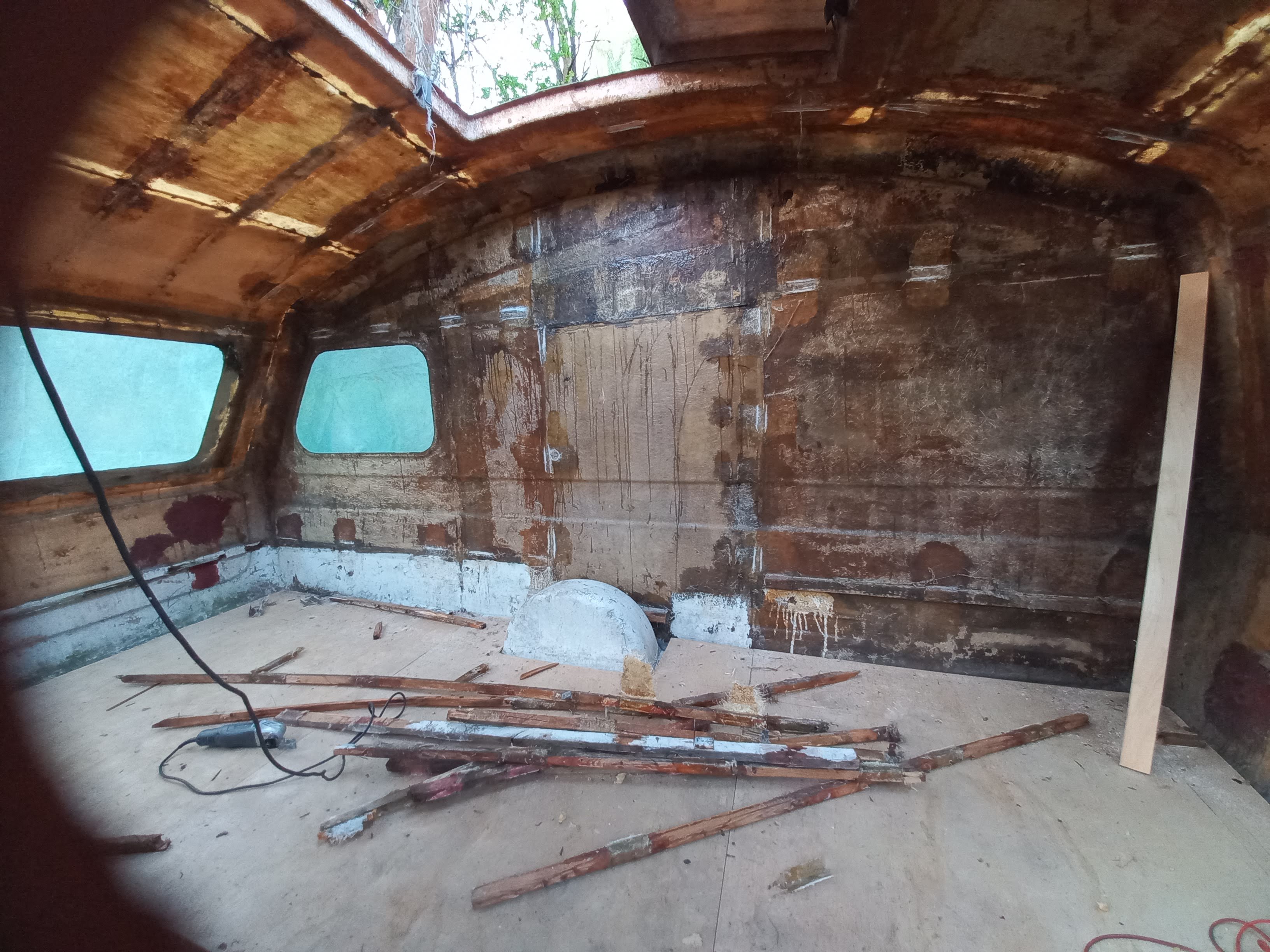 Na tym zdjęciu dobrze widać jak buda była szyta. Wszystkie łączenia są teraz wzmocnione od środka, a z zewnątrz rozfrezowane i wyszpachlowane na nowo szpachlą z włóknem szklanym.