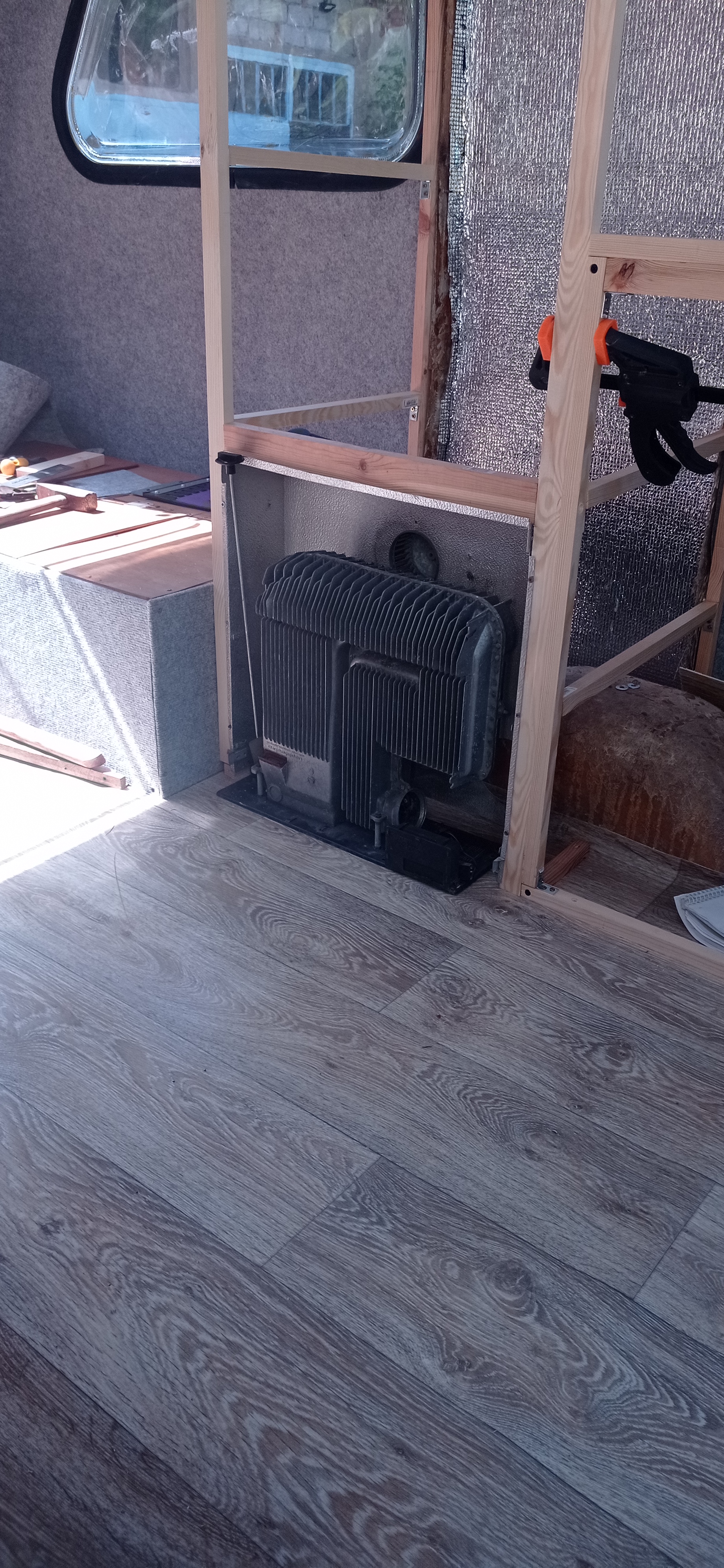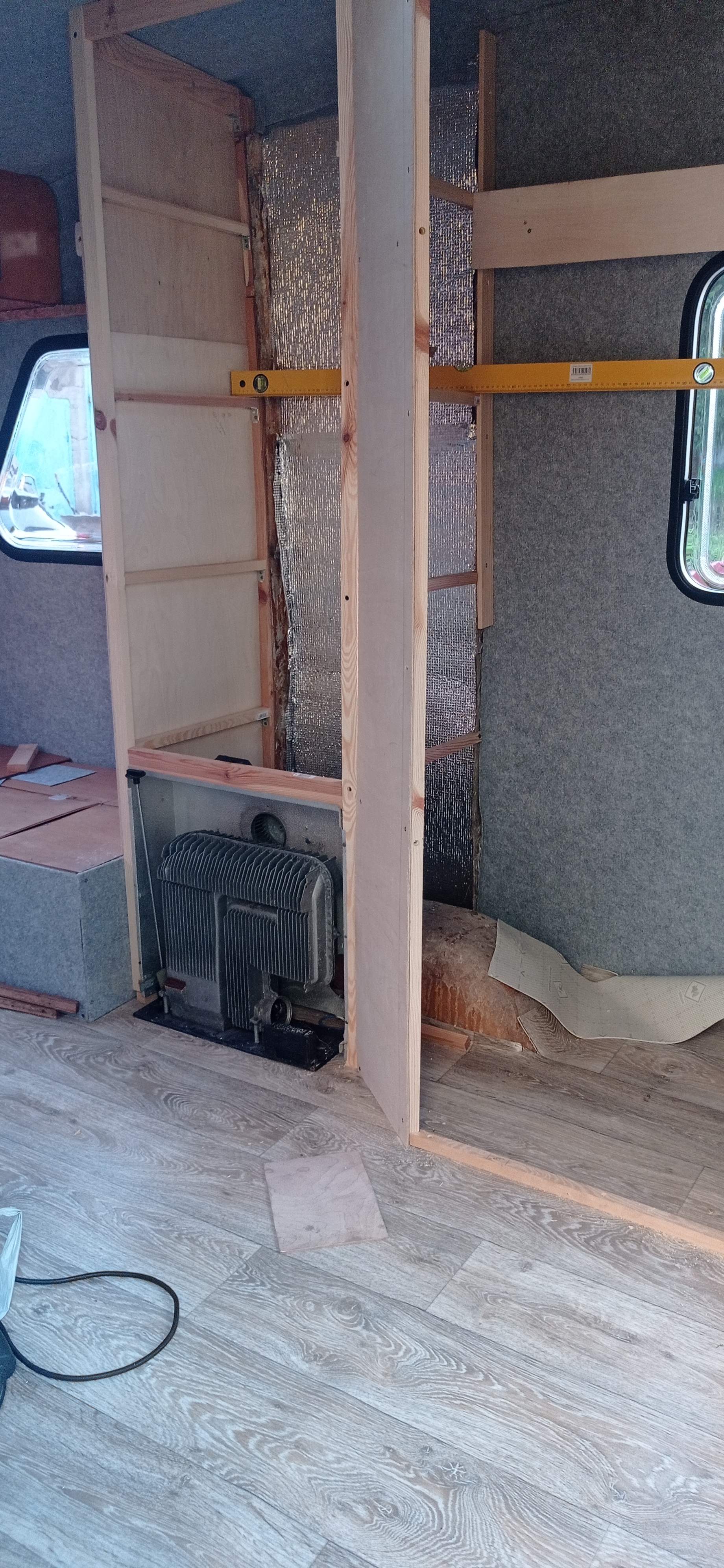 Najbardziej się bałem, czy aby na pewno w dobrym miejscu wycinam dziurę pod piec. Pomógł mi w tym szablon którego wymiary znalazłem w sieci. Na tym etapie muszę się wstrzymać z pracami bo studnia pieniędzy wyschła i musi trochę nakapac. Łazienki nie będzie. Kuchnia na koniec zostaje. Później instlacje, testy i na jesień pierwszy wyjazd.