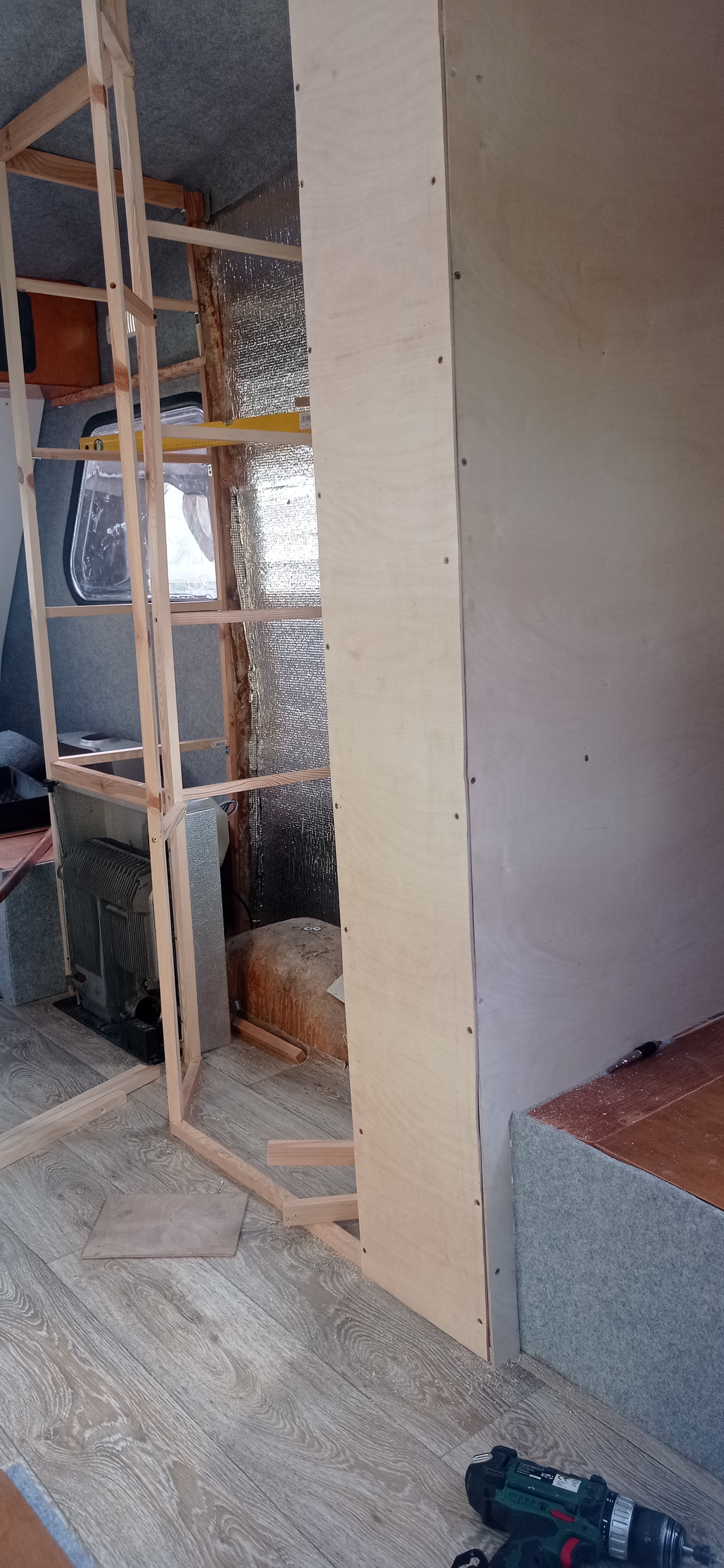 Nigdy więcej małego namiotu. Szafka wywalona i buduje się szafa i łazienka. Zabrakło drewna, więc jutro kurs do sklepu na zakupy i będziemy działali dalej. Po kilkudniowych ulewach delikatnie puszczało boczne okno stałe, w miejscu którego nie oszlifowalem. Szyba zbyt gruba.
