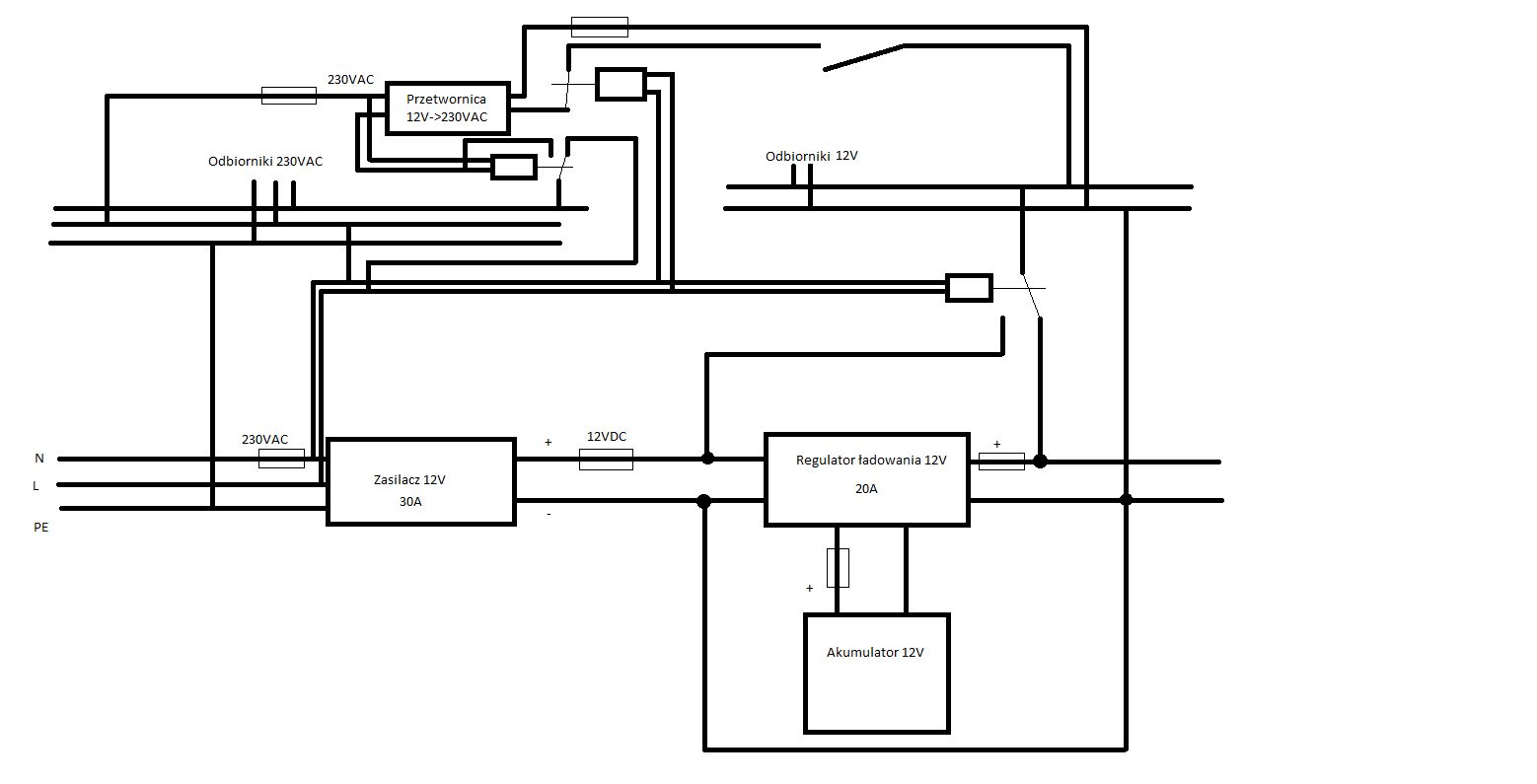 Ten bajpas zrobiony za zasilaczem 12V, który przechodzi za regulator nie jest potrzebny. W momencie braku zasilania z sieci 230V i uruchomieniu przetwornicy, regulator nie będzie ładował akumulatora bo było by to bez sensu. Jeżeli mamy napięcie z sieci to zasilamy odbiorniki 230V, odbiornik 12V oraz ładujemy akumulator.