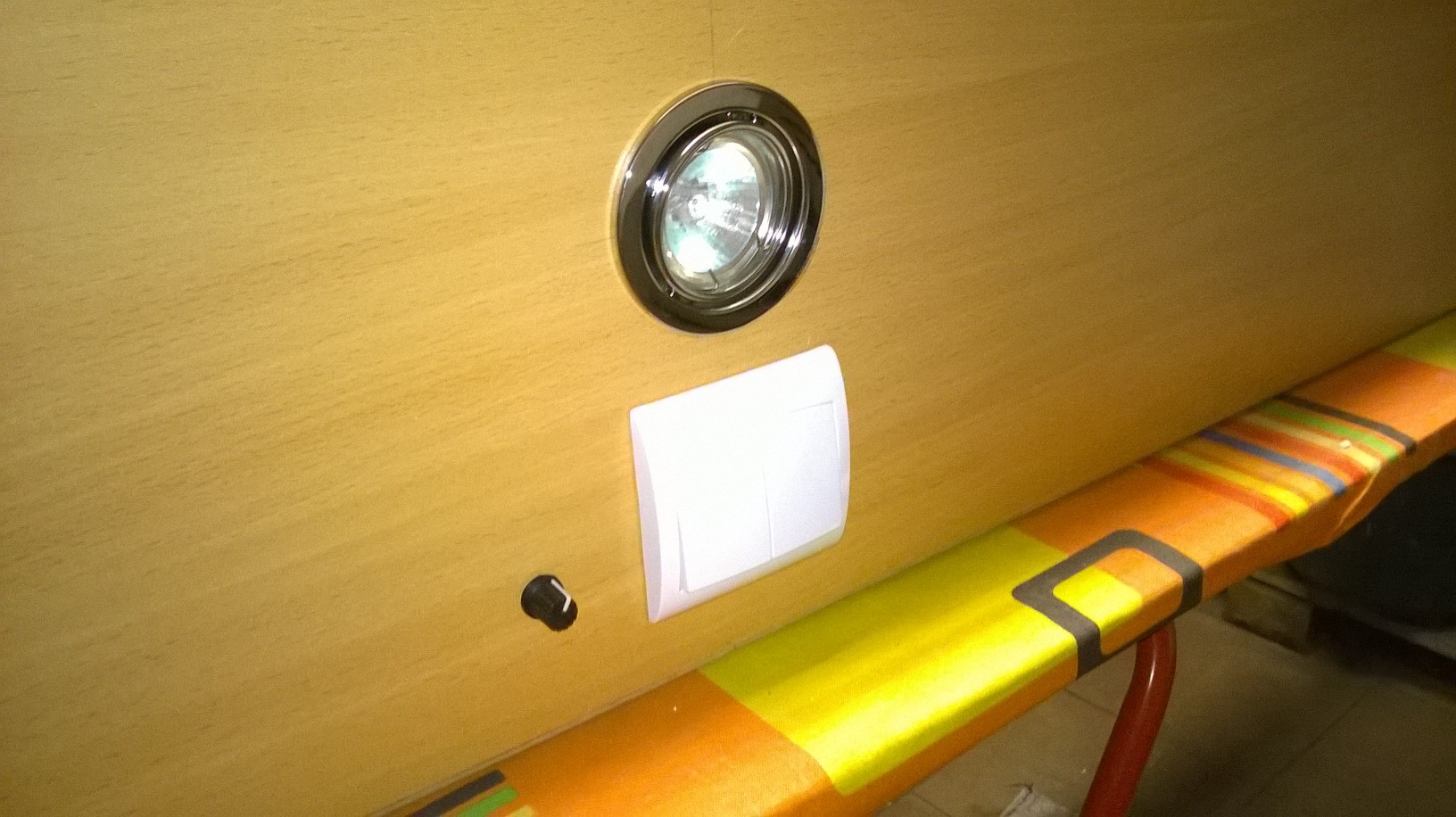 Wiszące szafki zmodyfikowałem. Z zewnątrz obkleiłem to płytą hdf pasującą do reszty. Od środka biała hdf na listewkach, żeby można to fajnie czyścić. Od dołu zamontowałem oczka ledowe mr16 + dodatkowo zastosowałem ściemniacz. Wszystko razy 3 (do przodu, nad kuchnią i z tyłu). Wlącznik umożliwia zaświecenie wszystkich świateł lub jednego.
