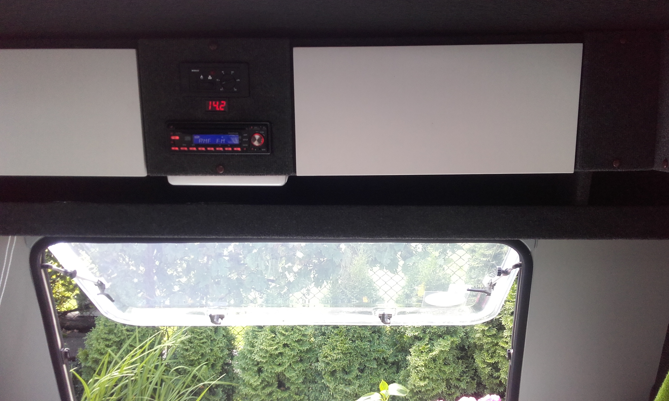 Widok na radio, panel sterowania ogrzewaniem webasto Eberspacher i woltomierz.