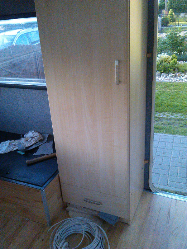 No to lecimy dalej z tematem. Dzisiaj swoje miejsce znalazła szafa ubraniowa. Trochę walki z nią było ale się udało. Trzeba było ją skrócić, bo niestety oryginalnie miała 182 cm, a to sporo za dużo tym bardziej, że sufit raczej do prostych nie należy. Niestety jej szerokość jest ciut mniejsza niż rozstaw listew wlaminowanych w ścianę, przez co z jednej strony musiałem ją mocować od zewnątrz. Dałem ładne plastikowe kątowniki i jest "bez tragedii". Najważniejsze, że po taniości. Po szafie przyszła kolej na stół a dokładnie uchwyt do mocowania w pozycji "na dzień". Zrobiłem go z kawałka aluminiowego profilu kwadratowego 20x20mm. Na koniec poszły dwa wieszaczki na bok szafy i poprawka wczoraj zamontowanych wywietrzników, które nie chciały się otwierać.