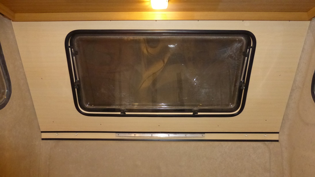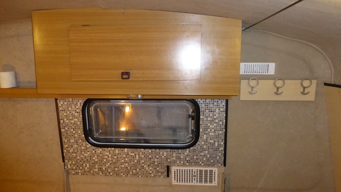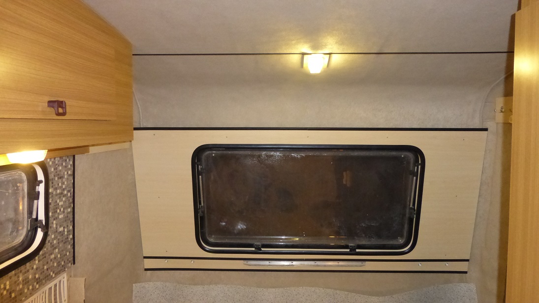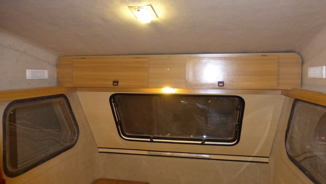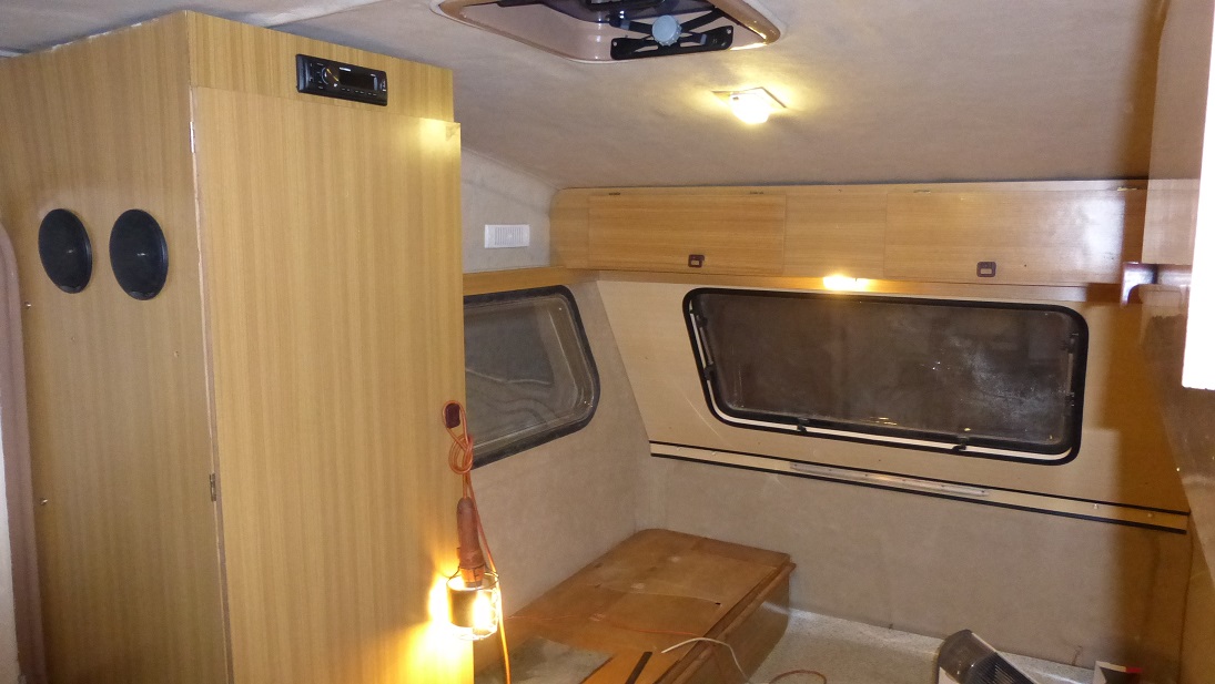Widok w stronę przodu. Górnej półki nie będzie, zrezygnowałem z niej żeby mieć więcej przestrzeni na głowę podczas korzystania z kibelka i ogólnie poruszania się w przyczepie. Będzie można wygodniej zajmować miejsca przy przednim stoliku. Likwidacja półki wymusiła przeniesienie lampy na sufit.