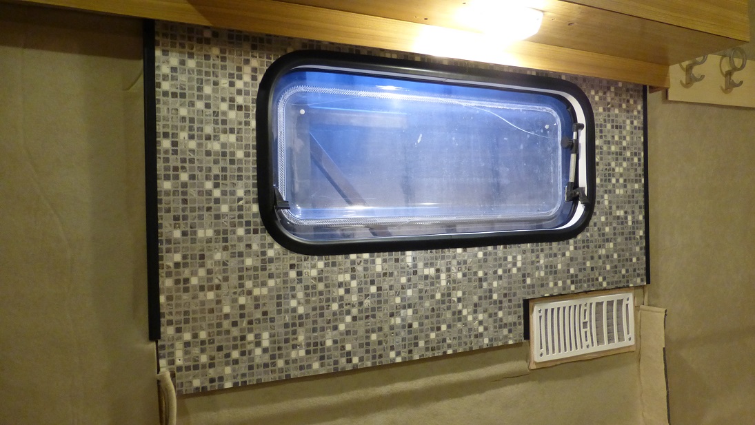 Zamiast tej sklejki dałem płytę taką jak stosowałem przy dużych oknach. Żeby trochę ją przyozdobić przykleiłem wykładzinę podłogową z motywem małych płyteczek. Moim zdaniem wyszło całkiem fajnie. Do wyboru miałem identyczny wzór ale w beżowym kolorze który może ładniej komponowałby się z tapicerką ścian i meblami ale wybrałem odcienie szarości żeby nawiązywały do srebrnej płyty kuchennej. Boki wykończone profilem klamrowym.