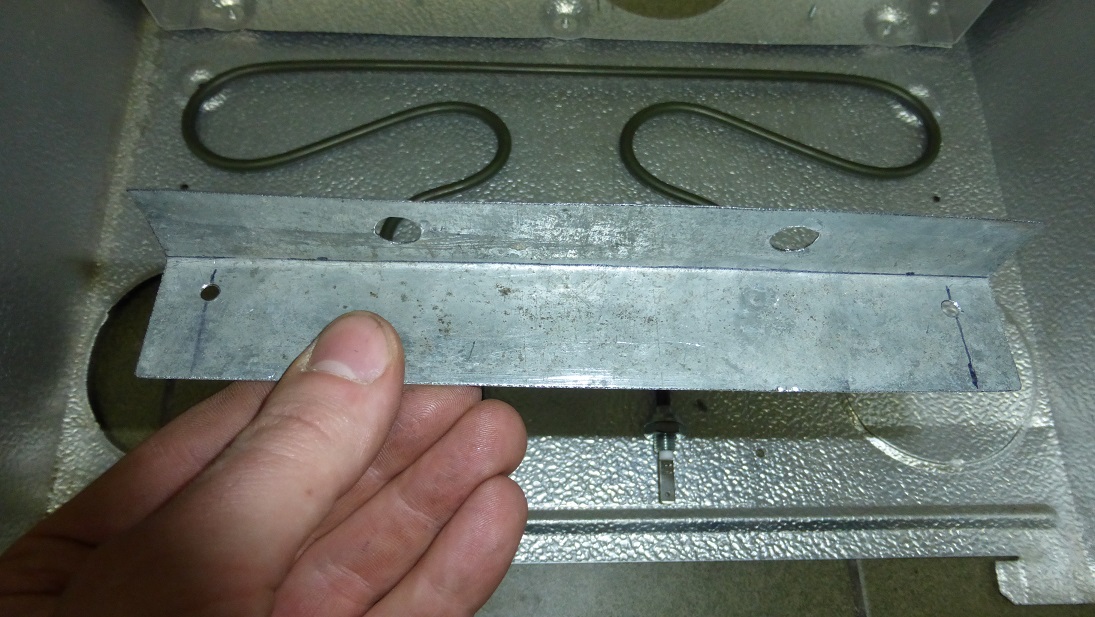Zależało mi aby nie dziurawić dodatkowo tylnej obudowy pieca i wykorzystać fabryczne otwory. To się udało, nawet nie usuwałem fabrycznej zaślepki do montażu oryginalnej grzałki. Wszystko zanitowałem żeby nie było ryzyka odkręcenia się czegokolwiek. Wiadomo, dostęp jest w razie czego kijowy.