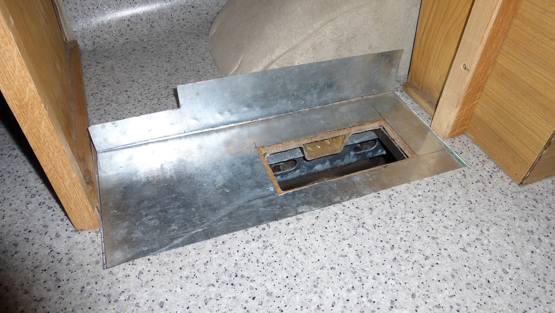 Po wycięciu otworu usunąłem wykładzinę z ociepleniem i dorobiłem blachę która będzie izolować podstawę pieca od sklejki, stanowić dla niego podłogę.