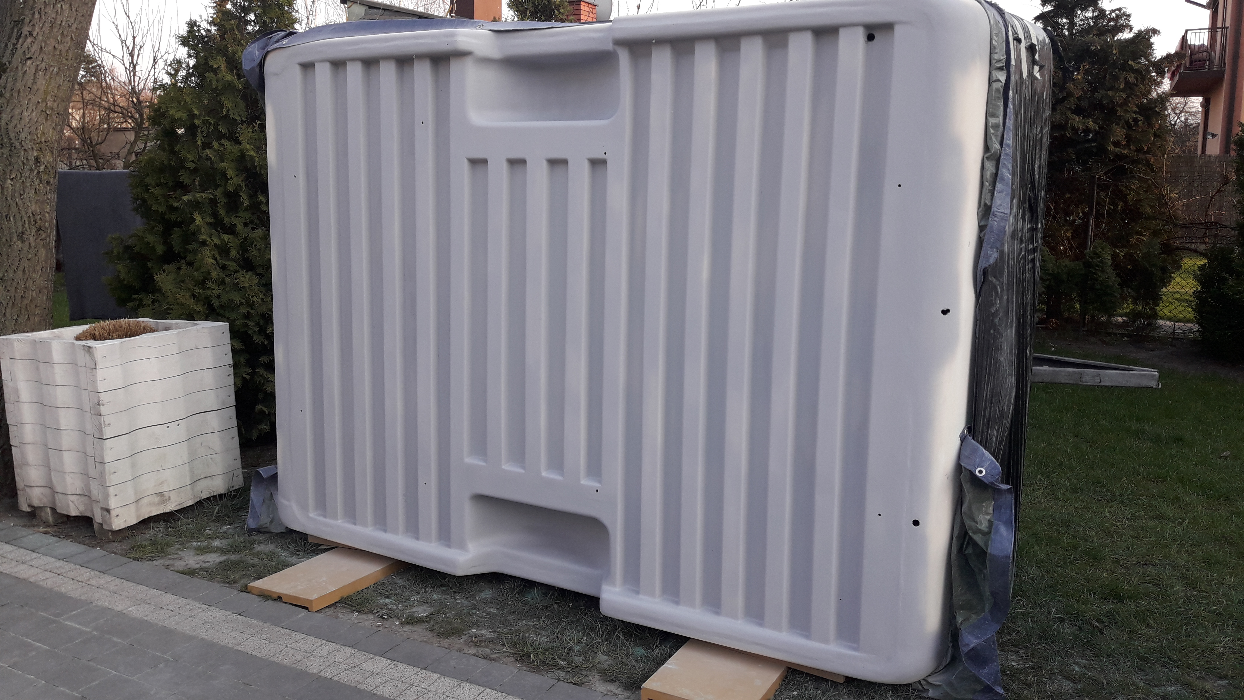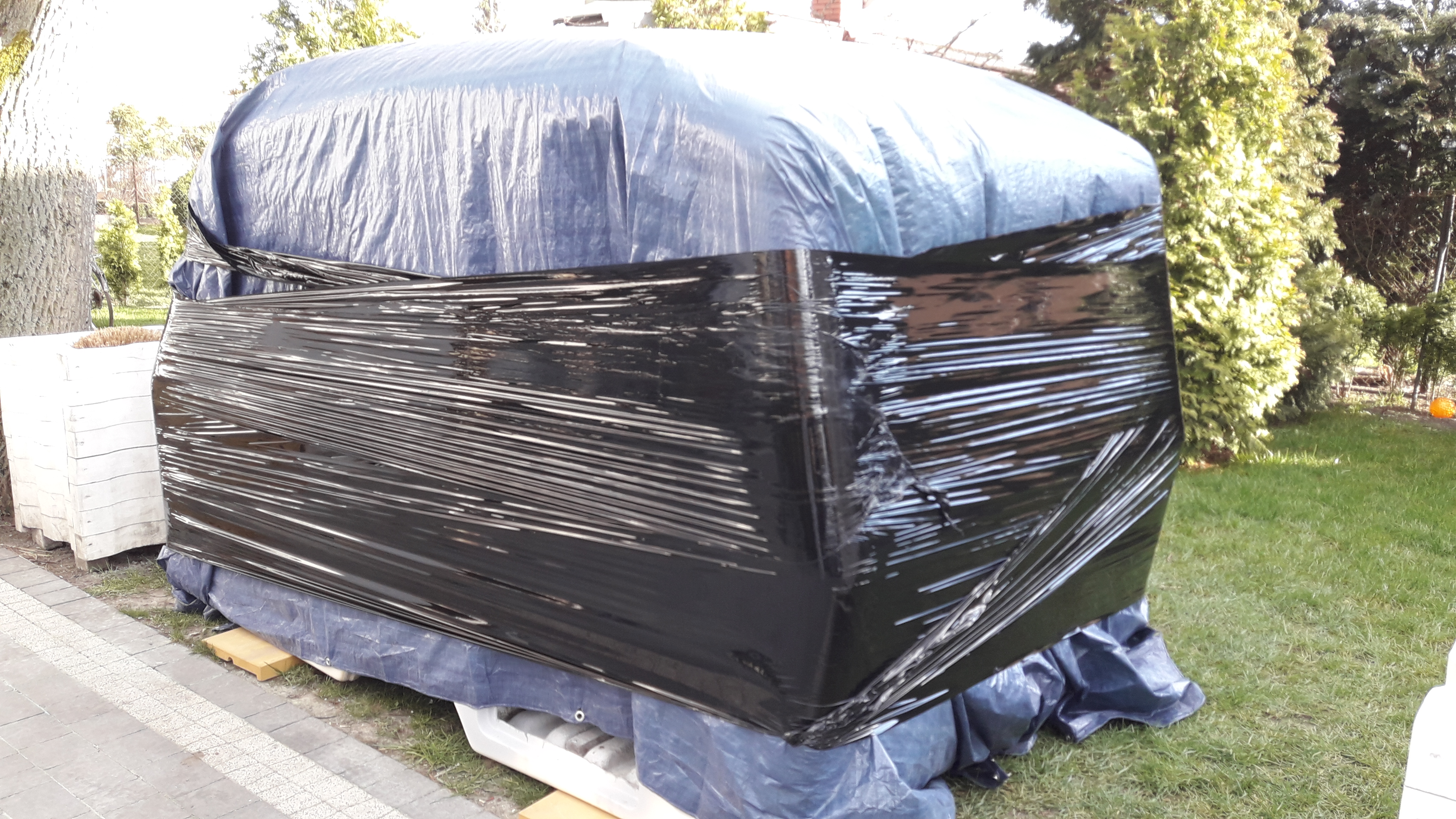 9. Opuściłem budę na jedną warstwę i zabezpieczyłem przed deszczem, owijając ją plandeką i streczem.