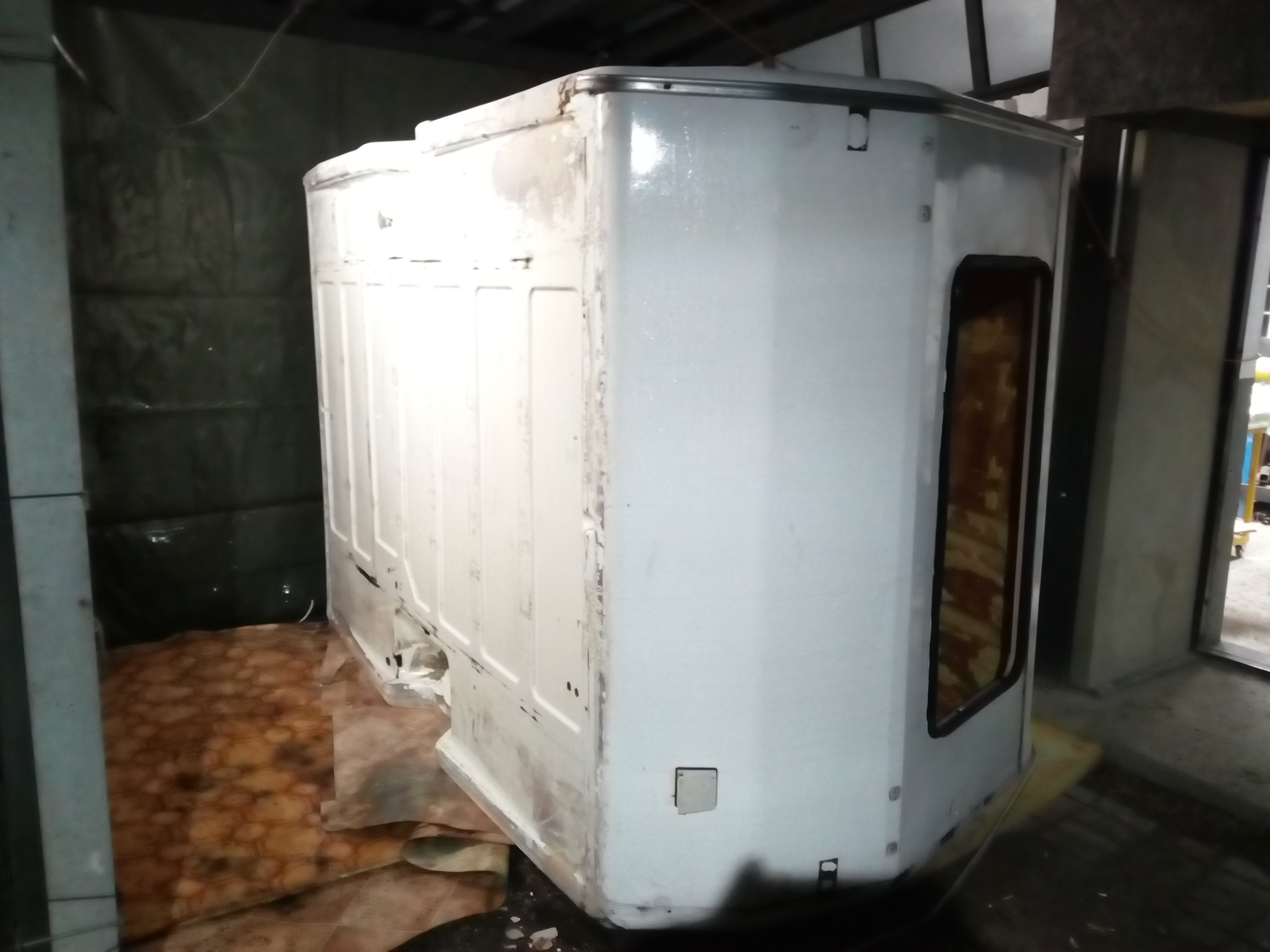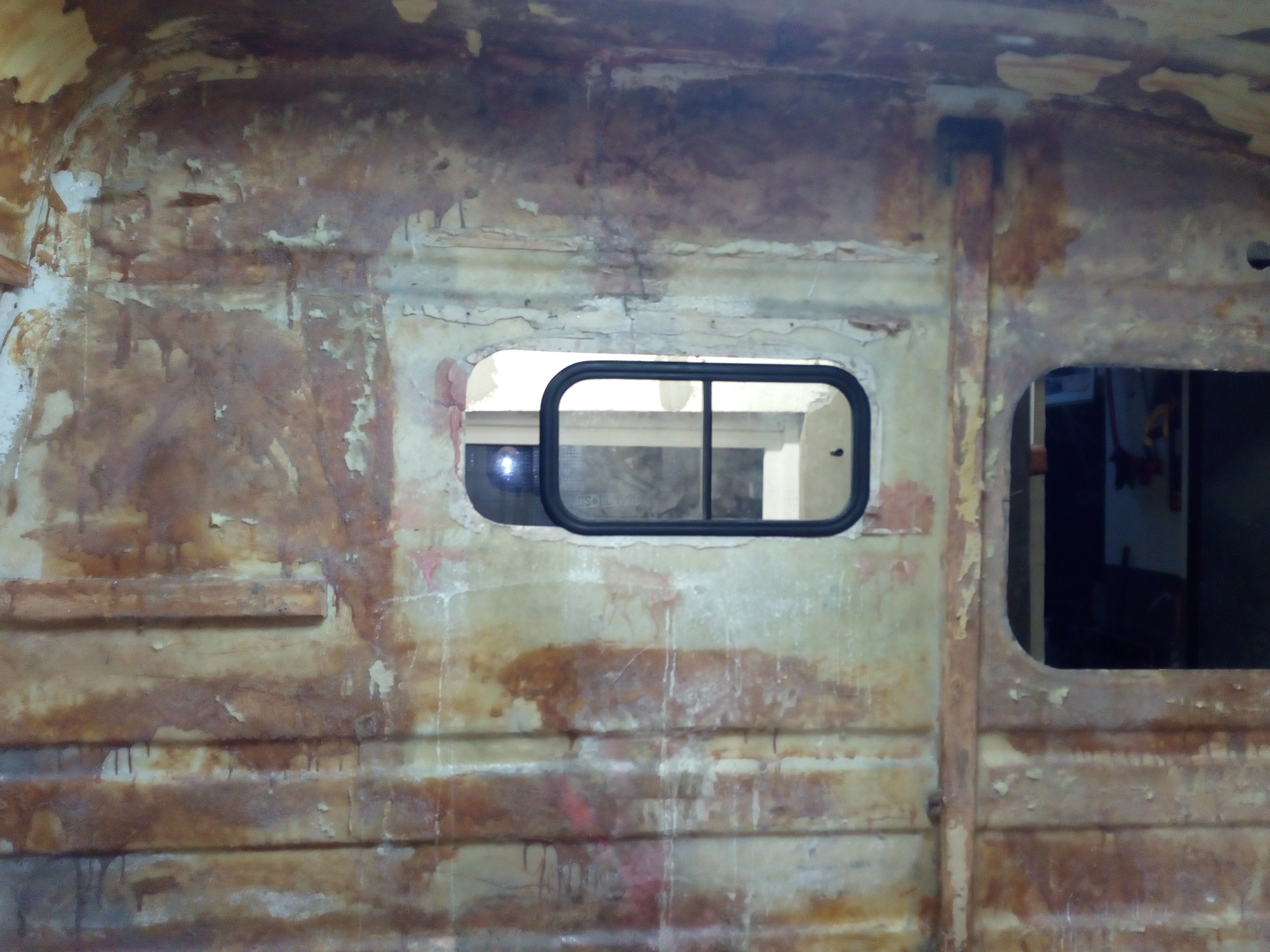 Budkę wsadziłem na ramę; nie było łatwo ale z pomocą kolegi daliśmy radę nie uszkadzając konserwacji. Koncepcja okienka chyba taka zostanie... Zacząłem wzmacniać od środka rogi budki; topornie to idzie bo pogoda nie sprzyja... za zimno. I rozpocząłem walkę z tyłem; z góry mówię zacząłem. Dojdzie szereg wzmocnień i wzmocnień, ale po wycięciu tych dwóch kawałków nie zauważyłem osłabienia konstrukcji - wiadomo; na pewno lepiej kiedy były, ale będzie dobrze.