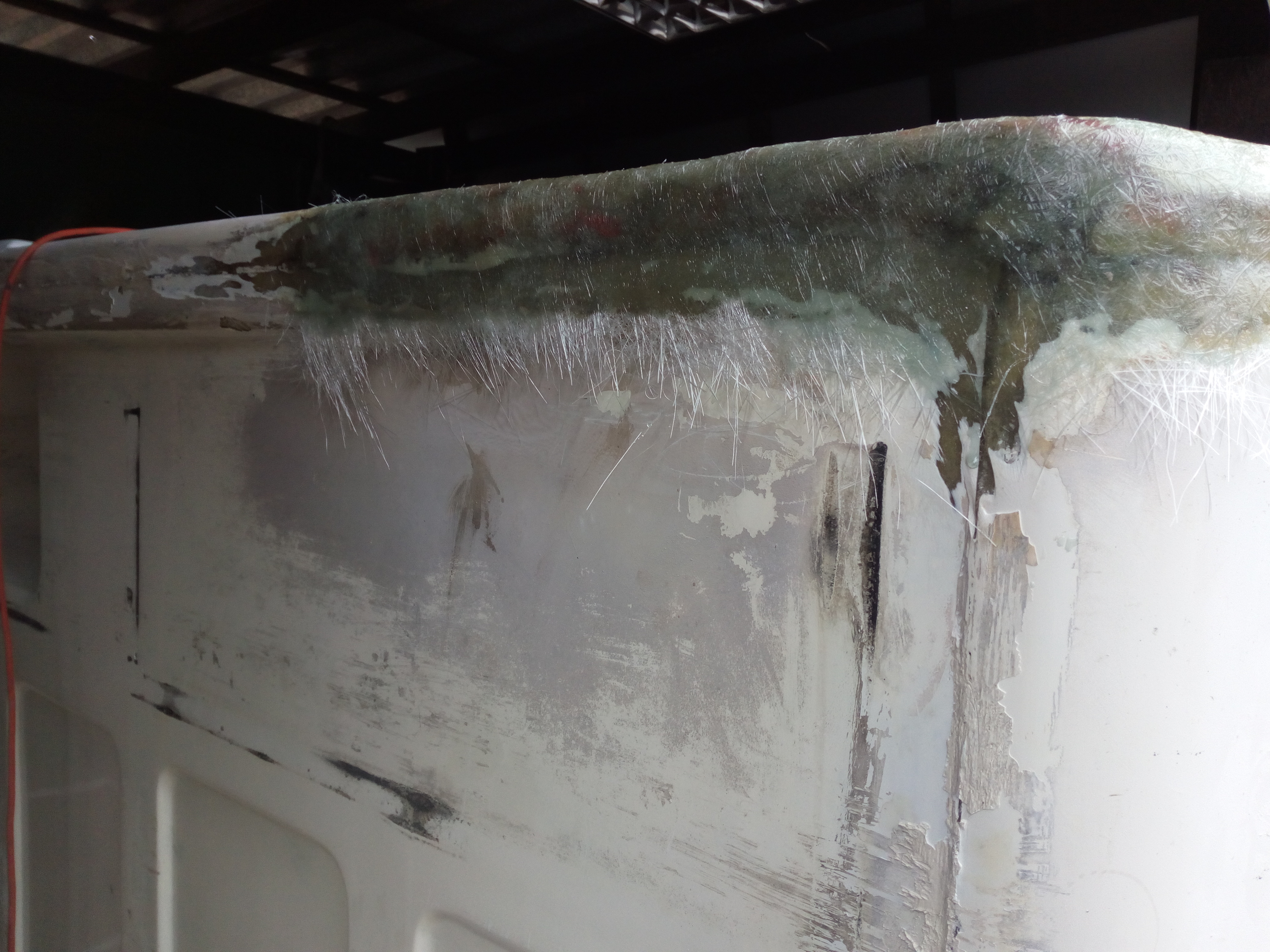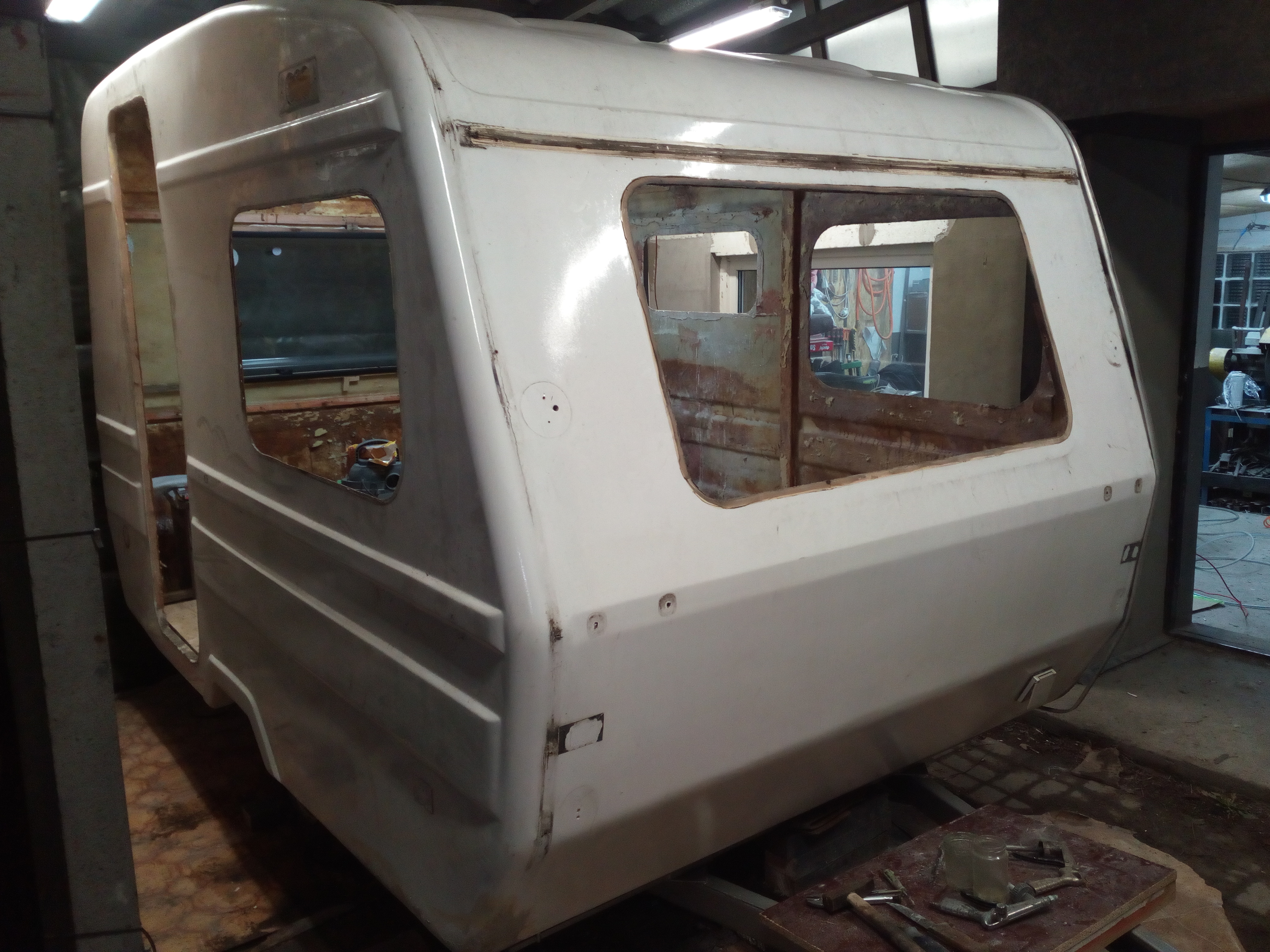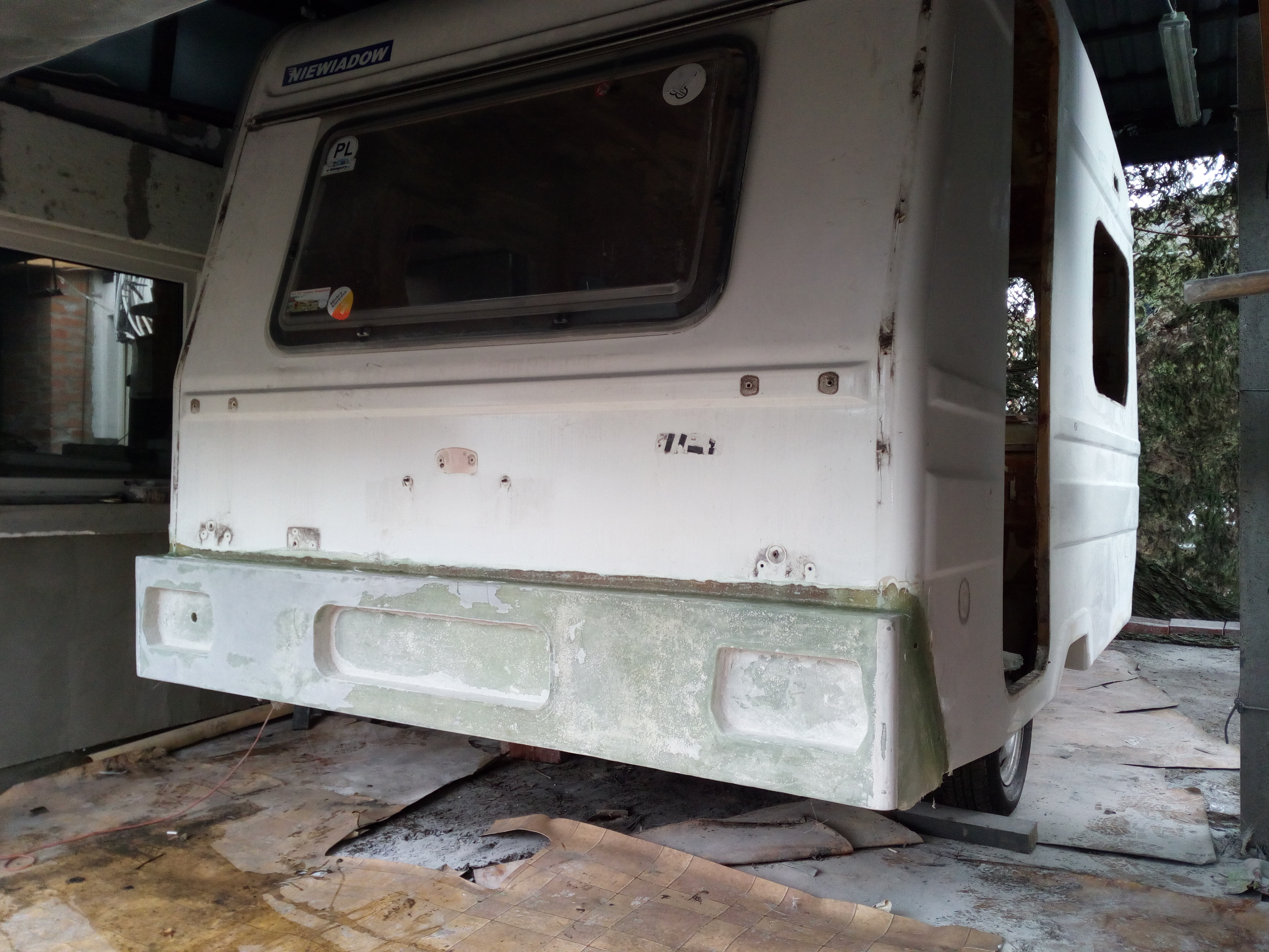 Panowie, co do tyłu to co mam powiedzieć??? Ja to dopiero mam obawy, że popęka, że będzie pękał, że całą budę zepsuję i jeszcze - jakby nie patrząc - płacąc za to pieniędzmi i czasem... Ale jadę dalej z tematem; powstał model-wzór i w głowie i w postaci modelu. Tak więc patrzymy wszyscy i zobaczymy co z tego będzie. Dziękuję za słowa otuchy jak i wszelkie uwagi przeciw; co więcej powiedzieć, albo będzie 1 albo 0.... Trochę się ociepliło no to buda na bok i jazda - myte podwozie. Ku zdziwieniu w bardzo dobrym stanie jeśli chodzi o cornicus-laminatus. Potem "zepsułem" to co poprzedni właściciel "naprawił". Około 1 kg szpachli i naprawiłem po normalnemu. Jeszcze ta dziura została do zalaminowania...