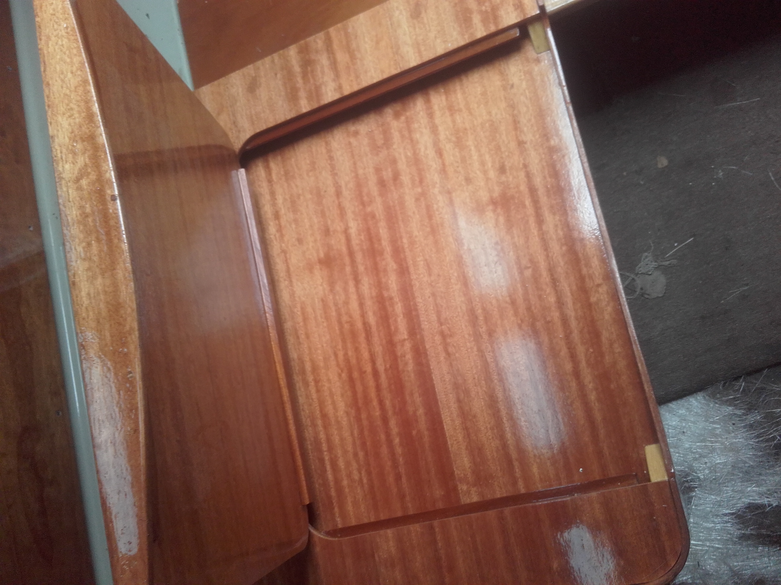 Co do mojej pierwszej wyprodukowanej łódki to proszę bardzo, zdjęcia poniżej, wyprodukowałem ją bodajże w 2007 roku w moim przydomowym garażu. Zresztą bardzo długo działałem w pojedynkę w domowym garażu. Jeśli chodzi o kopyto do gięcia drewna to nie mam pojęcia co niezwykłego może być w kilku deskach skręconych ze sobą? W mojej opinii zupełnie nic. Nie mam niestety zdjęć takiego kopyta, ale pozwolę sobie wstawić stolik nawigacyjny jako przykład gięcia na kopycie wykonanym z kilku skręconych do kupy sosonowych desek. Szkutnictwo to nie czarna magia ani NASA.