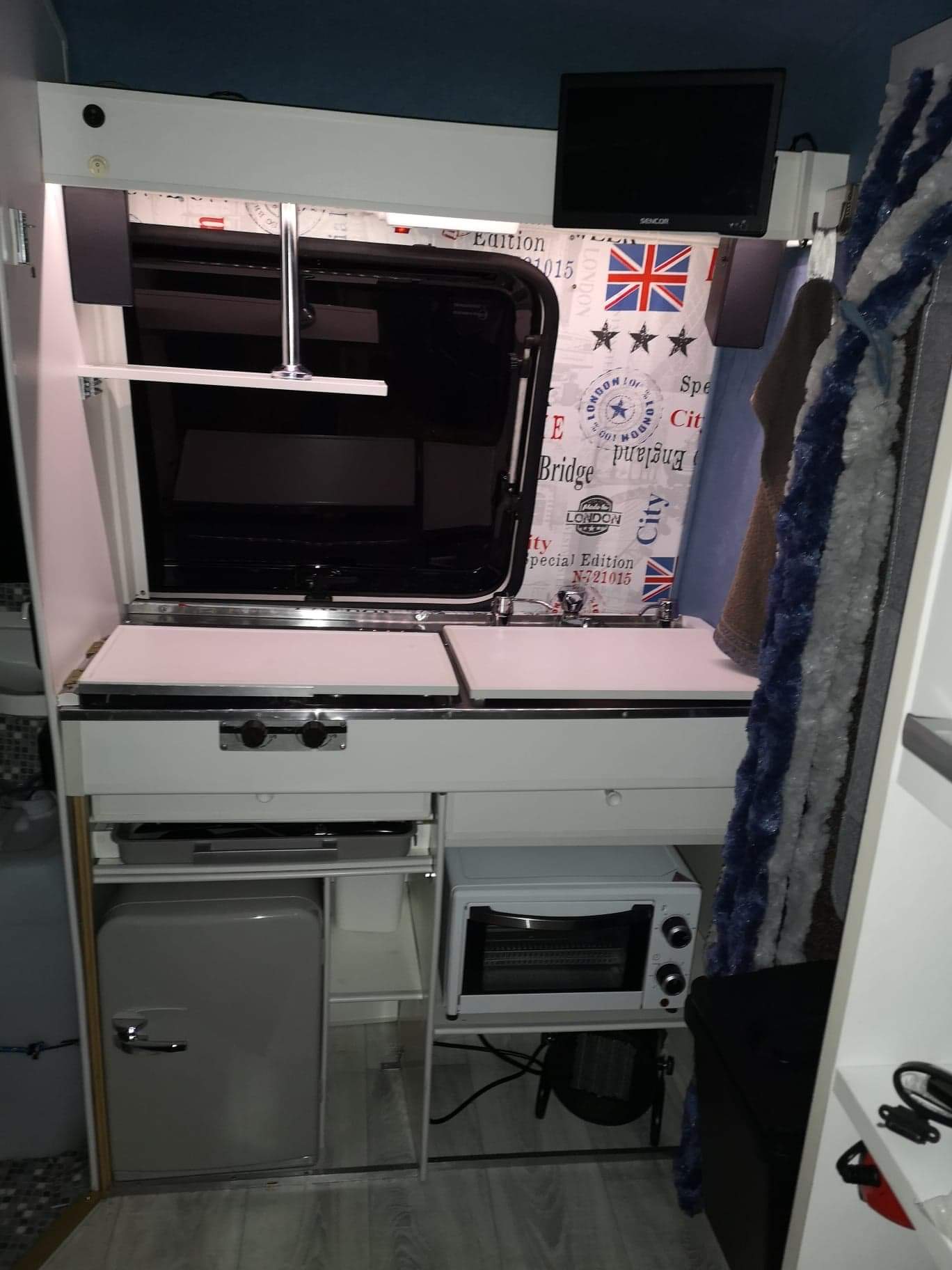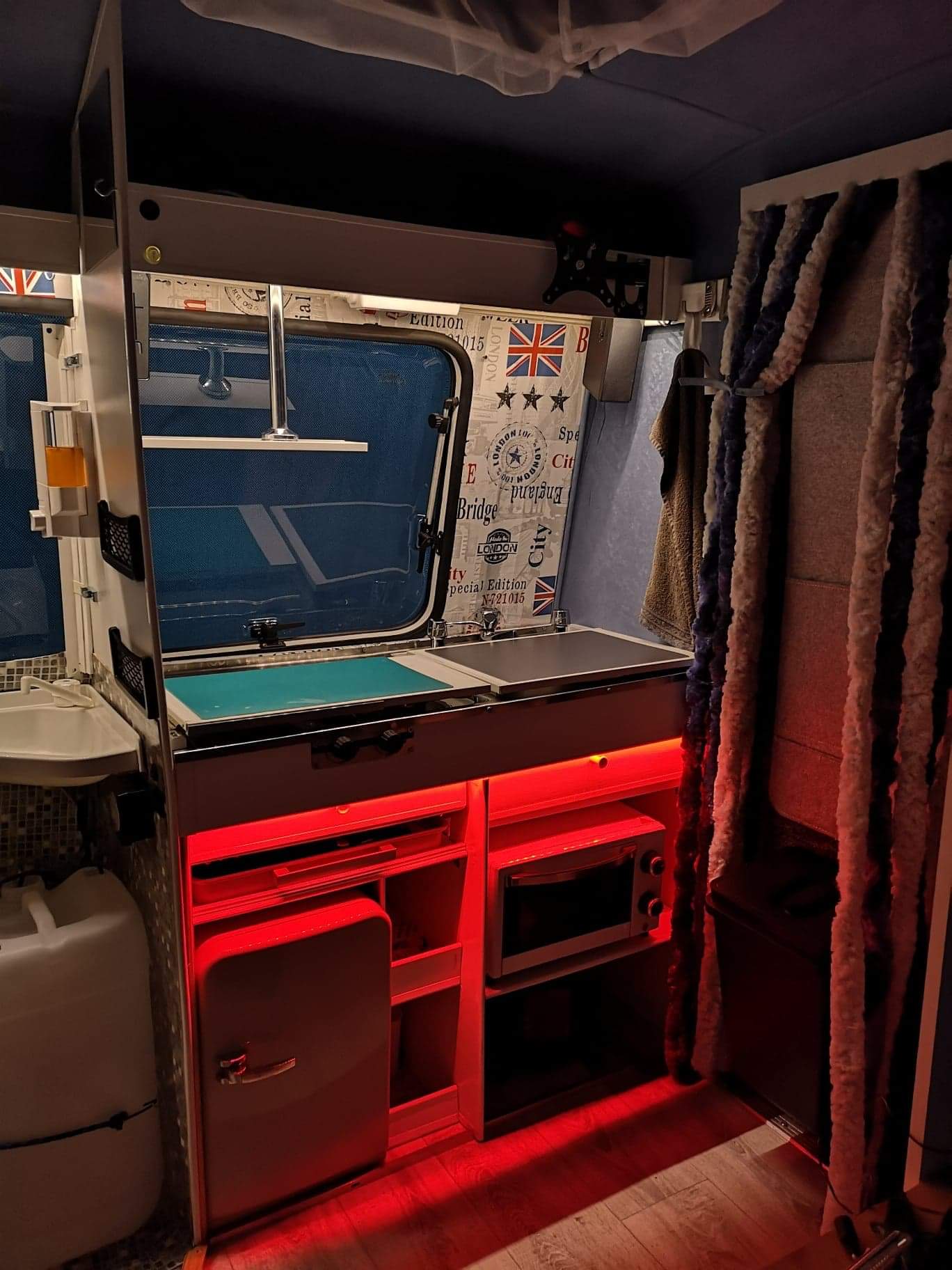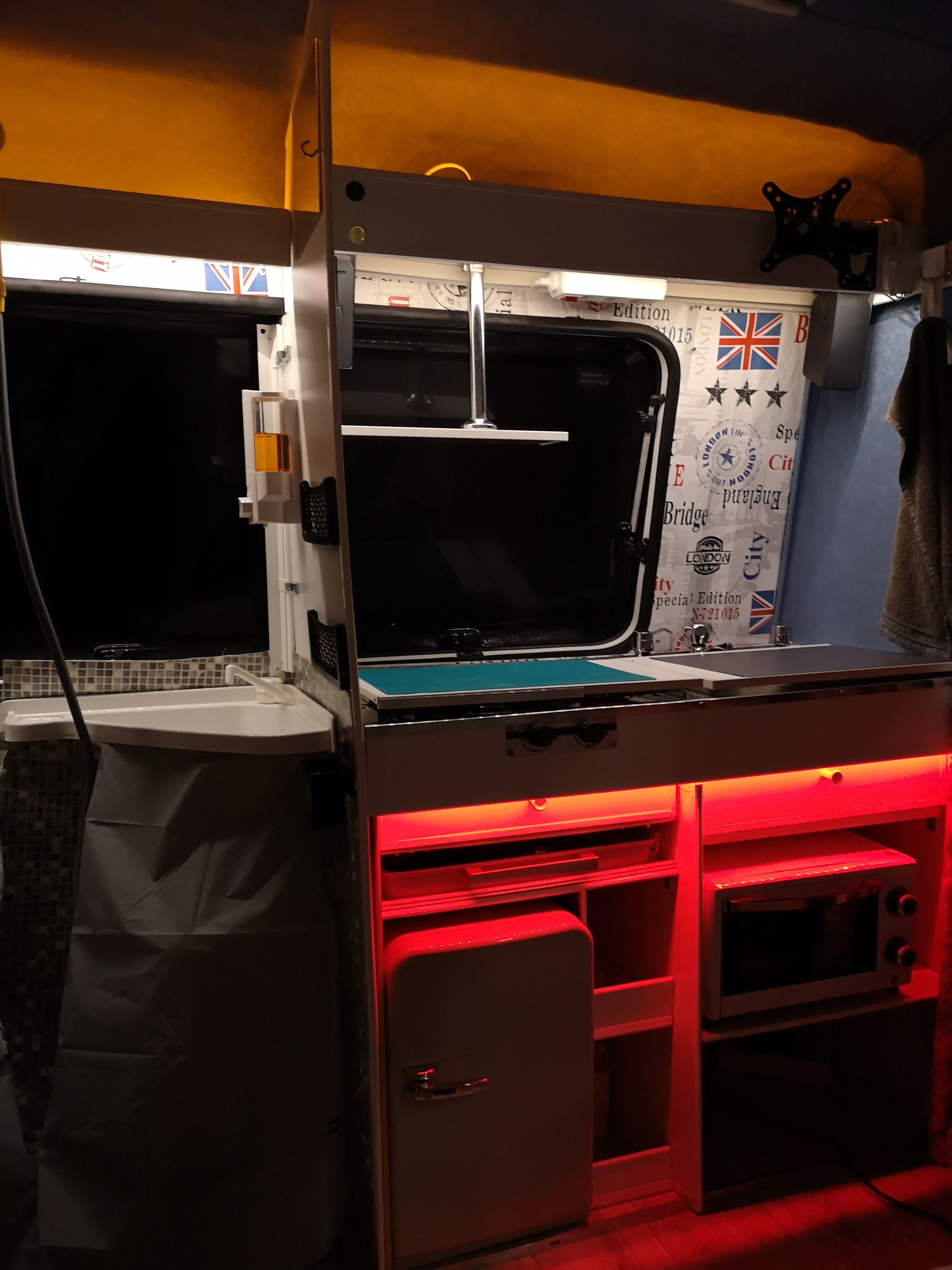 Tak wygląda moja ostateczna wersja kuchni. Macie jeszcze jakieś pomysły? Zmieniłem lodówkę (chłodziarkę) za waszą namową... Jednak z uwagi na gabaryty i wagę wybrałem cos mniejszego - co pozwala na weekend chłodzić z pomocą aku i mojego solara. Założyłem też dwa dozowniki podblatowe na mydło i płyn do naczyń. Zrobiłem mały test - lodówka w temperaturze 24°C po dwóch godzinach pracy schłodziła do 7,5°C - to raczej dobry wynik. Wymieniłem żarówkę na led, żeby uzyskać ciekawszą barwę światła.