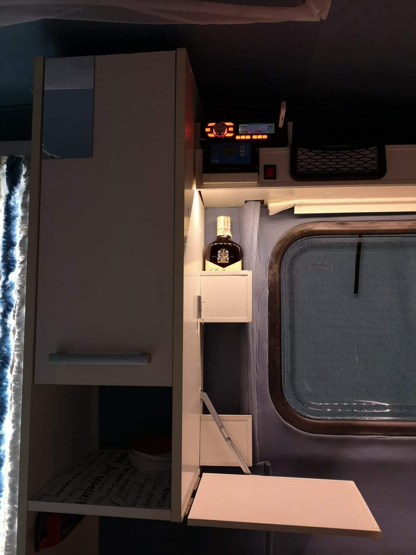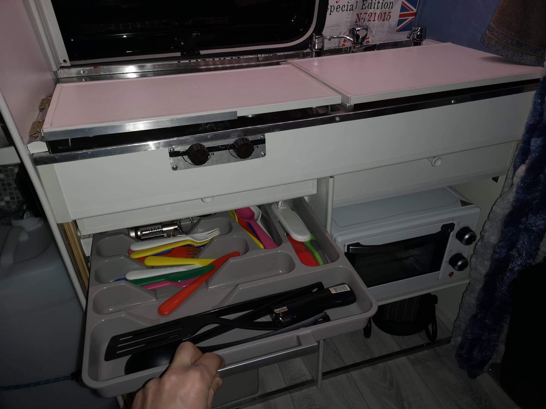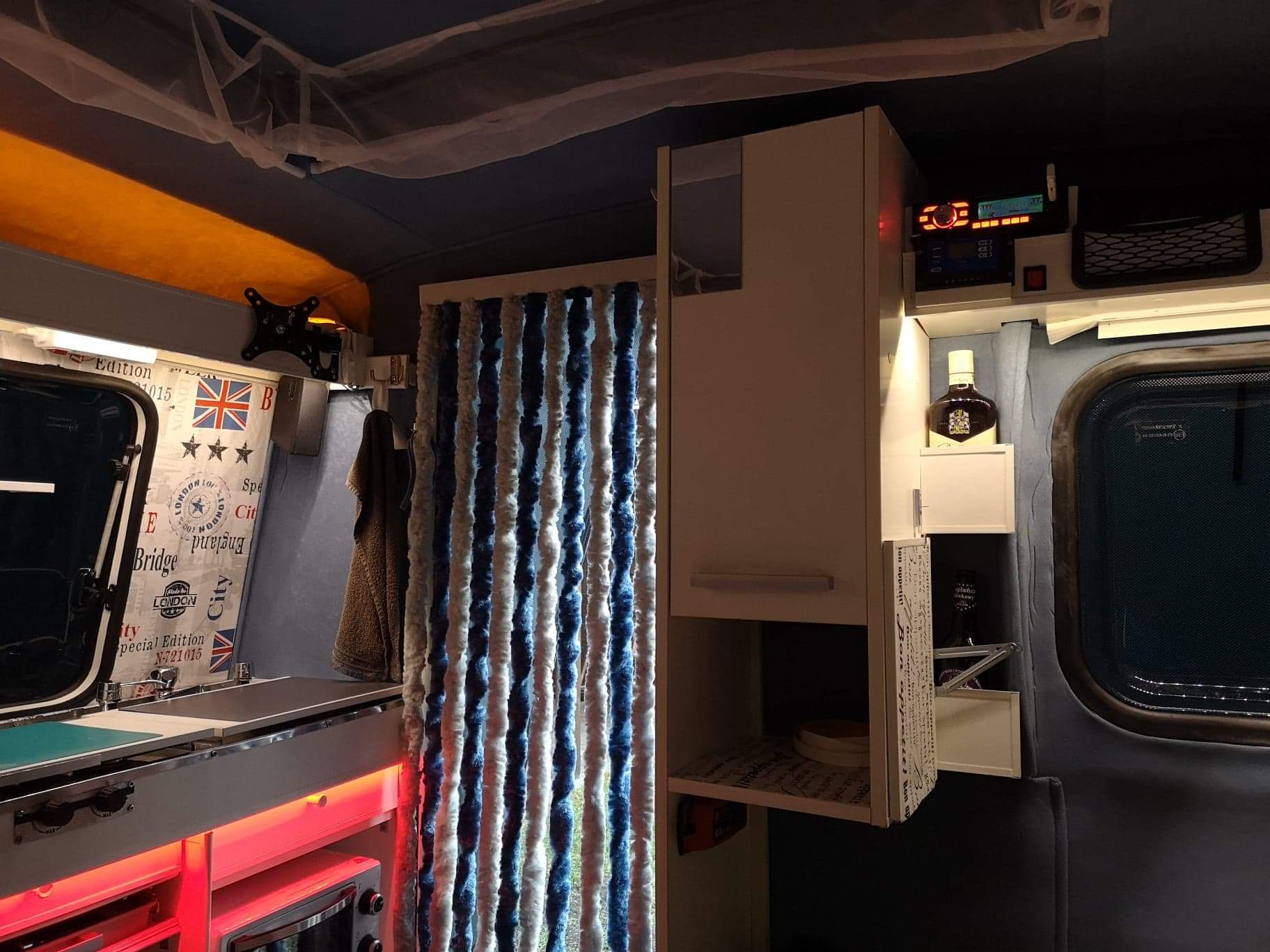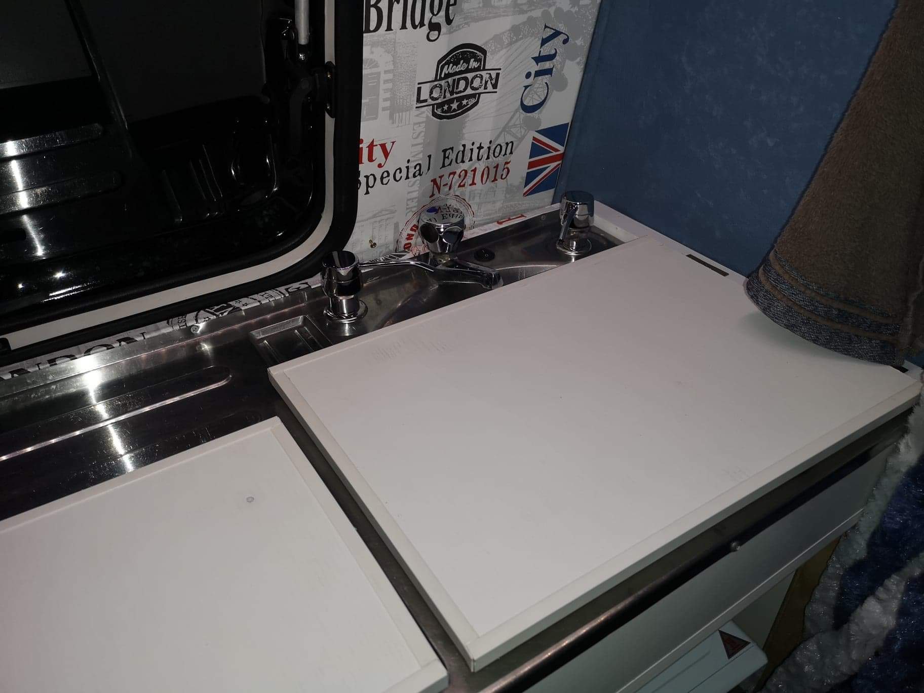 Tak wygląda moja ostateczna wersja kuchni. Macie jeszcze jakieś pomysły? Zmieniłem lodówkę (chłodziarkę) za waszą namową... Jednak z uwagi na gabaryty i wagę wybrałem cos mniejszego - co pozwala na weekend chłodzić z pomocą aku i mojego solara. Założyłem też dwa dozowniki podblatowe na mydło i płyn do naczyń. Zrobiłem mały test - lodówka w temperaturze 24°C po dwóch godzinach pracy schłodziła do 7,5°C - to raczej dobry wynik. Wymieniłem żarówkę na led, żeby uzyskać ciekawszą barwę światła.