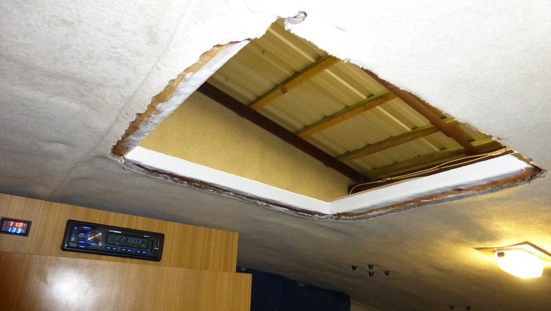 Oczyściłem szlifierką sufit pod nową ramką z pozostałości starego kołnierza, aby był w miarę równy a później zapodałem po pasku tkaniny od wewnętrznej strony każdej ze ścianek ramki tak aby wywijały się na sufit.