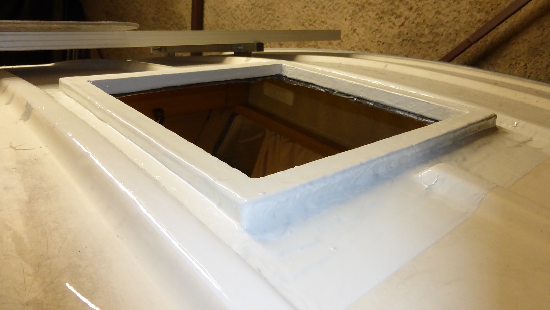 Uff, skończyłem laminowanie kołnierza pod nowe okienko :) Dzisiaj wzmocniłem jeszcze na zewnątrz narożniki ramki dodatkową warstwą maty i przeleciałem wszystko żywicą ostatni raz.