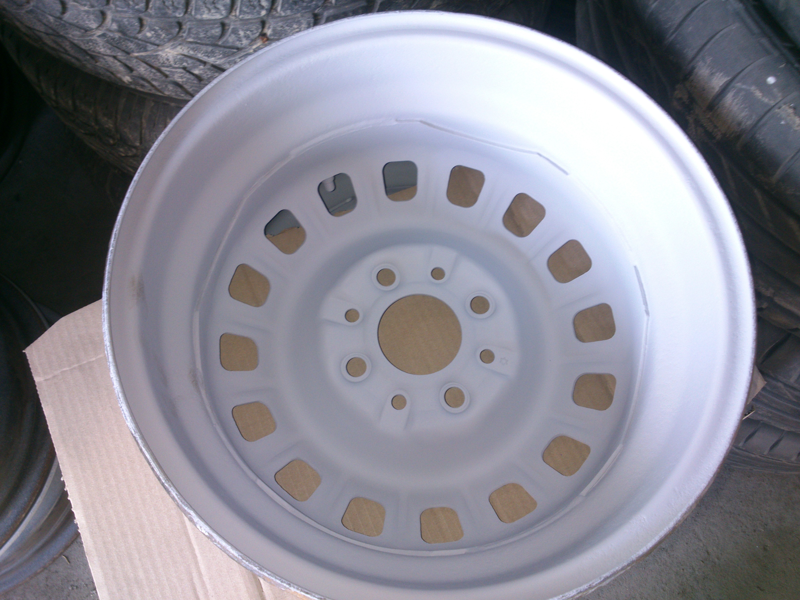 Felgi były wypiaskowane,teraz są 2 x podkładem tryśnięte,i już kolor tylko przyjdzie ,proszkowo obudowę od Trumy malowałem,w około okien dałem nową płytę z laminatem,a dobrałem okleinę pod tego kolor do oklejenia drzwiczek od półek wiszących.
