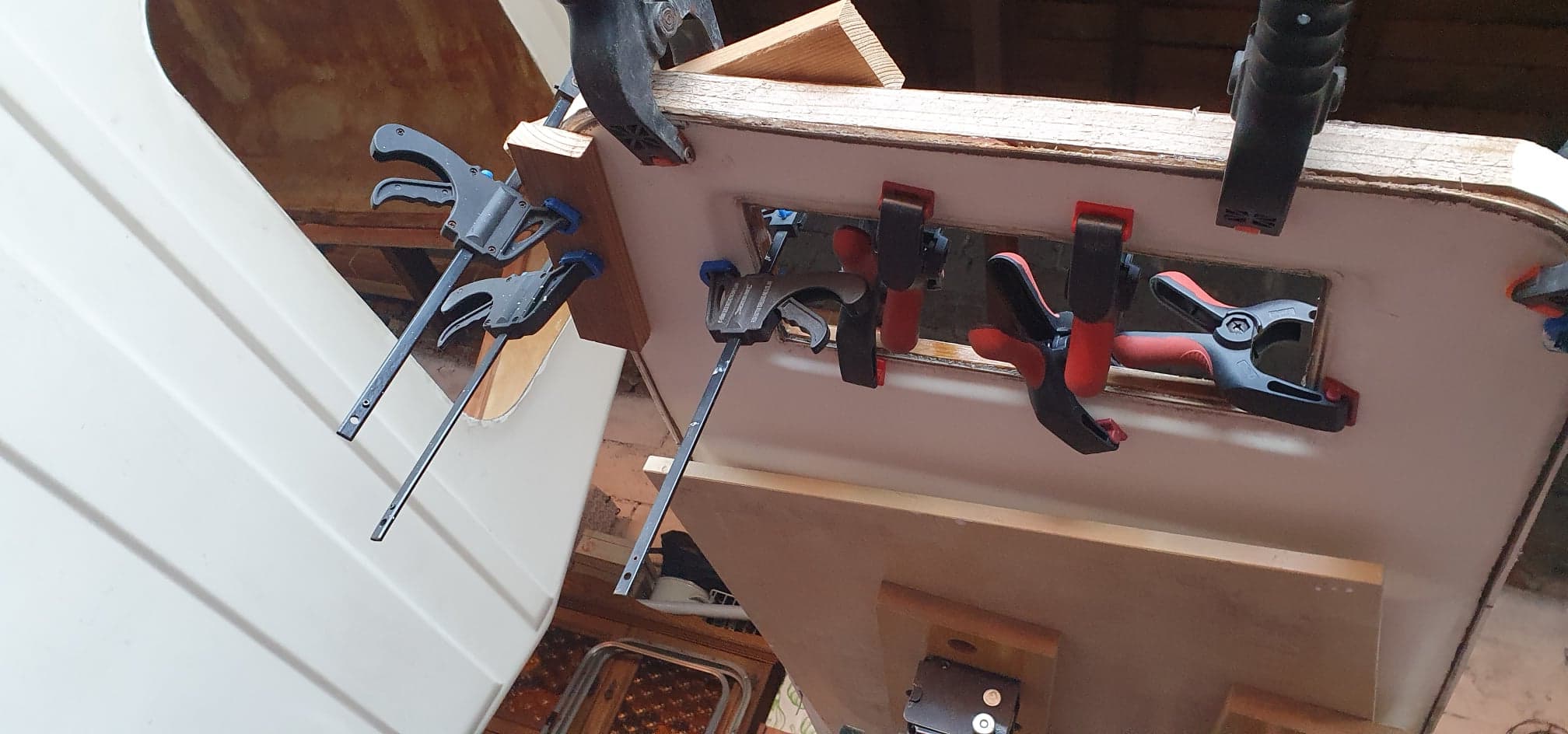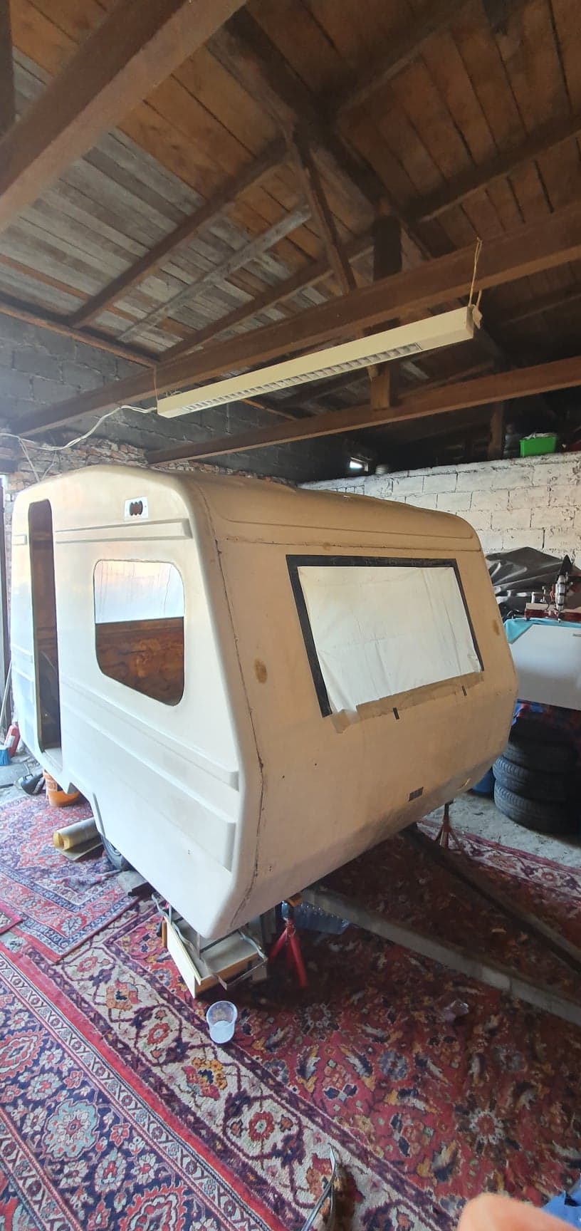 Ciepło się zrobiło to można ruszyć z robotą. Przygotowania do malowania, szpachlowanie, zaklejanie dziur, matowanie, ogólnie nuda straszna :lol:. Drzwi wymagały reanimacji bo w dolnej części drewno się rozsypało. Przymiarka okna. Sklejka z dwóch stron wzmocni i wyrówna dach, kołnierz fabryczny zostaje. Pytanie, jak wykończyć dach? Czy na żywicę dać szpachlówkę i farba, czy na żywicę żelkot? Waham się, co radzicie?