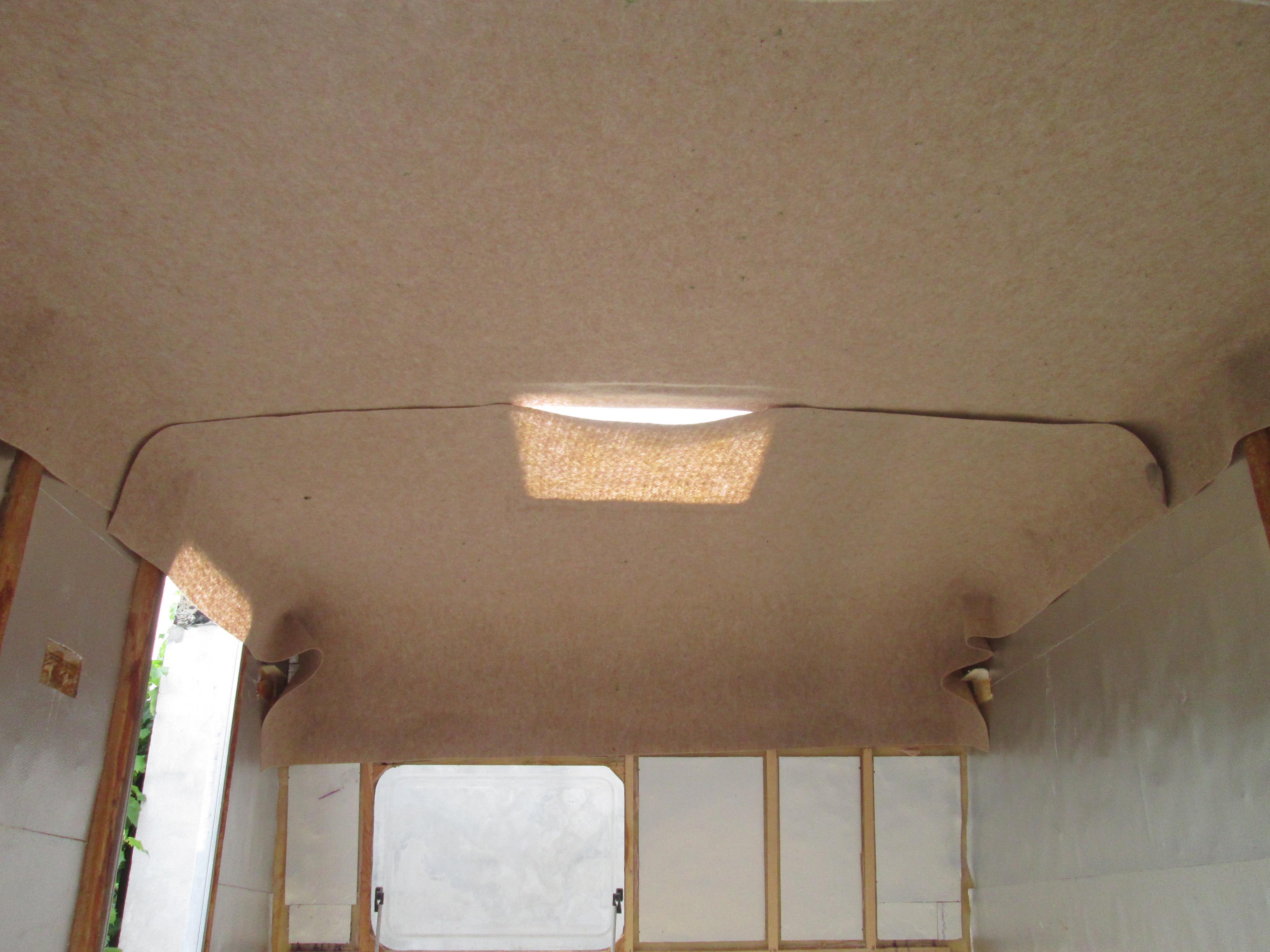 i wg niej rozpocząć klejenie ponieważ dach nie jest płaski to myślę że nad szafą ubraniową potrzebne cięcie poprzeczne , aby wykładzina się ułożyła na kszywiznie dachu , ja składałem płytę z dwóch części i gimnastykowałem się z kształtem łuku poprzecznego i wzdłużnego