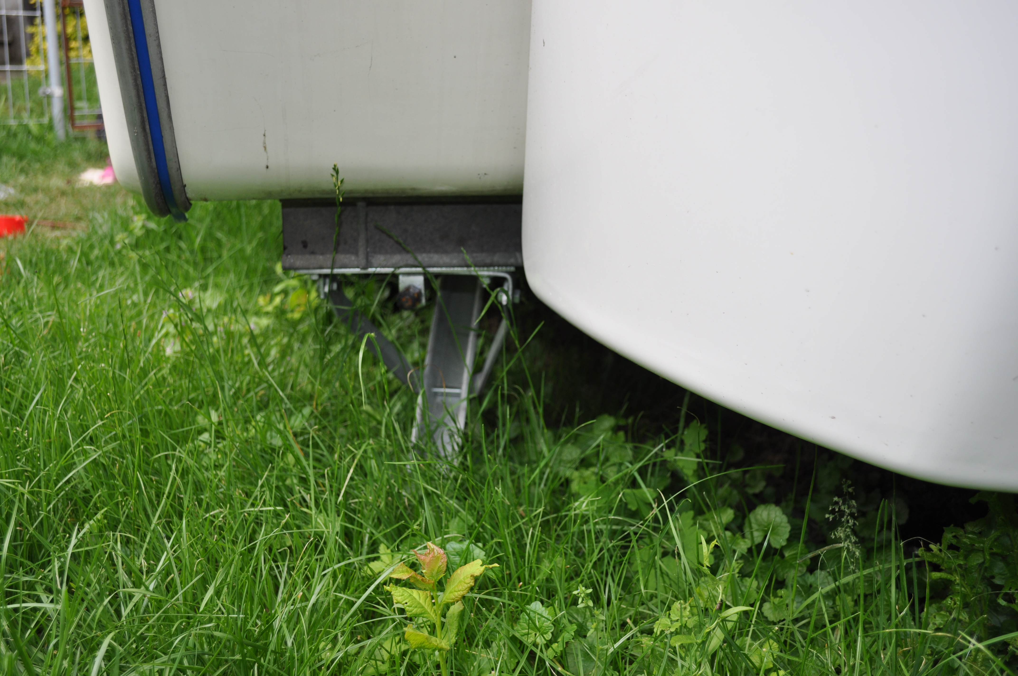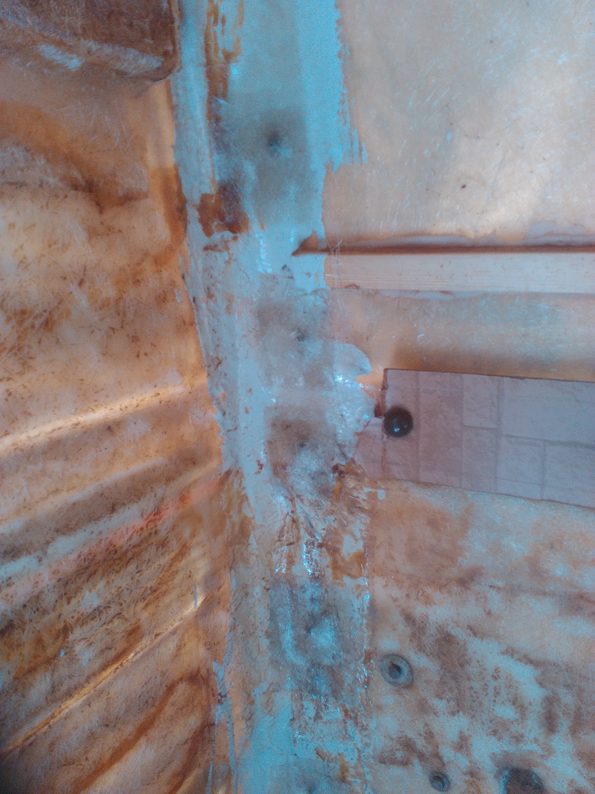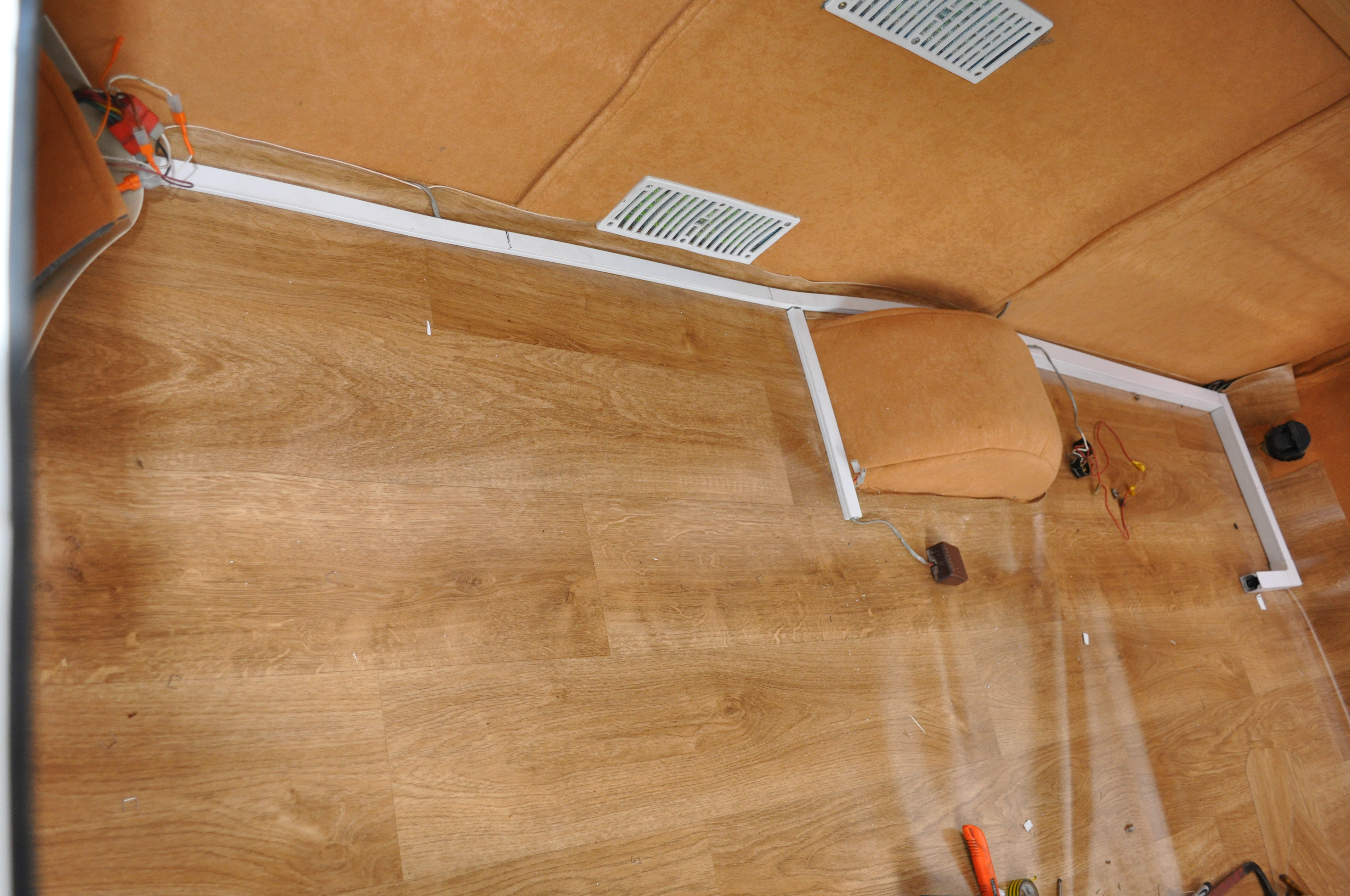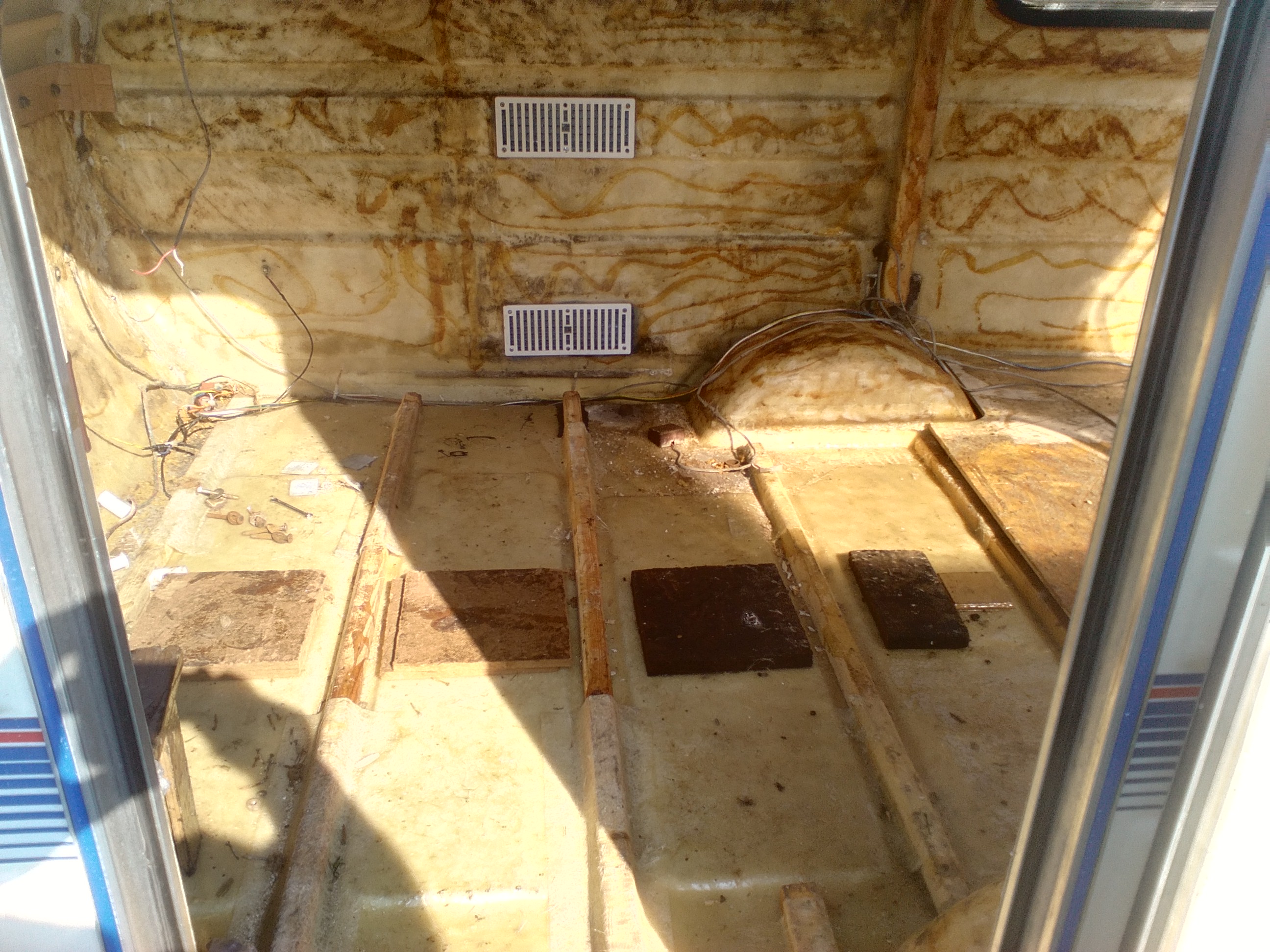 Dalej , zastanawiałem się czy ruszac podlogę , nie była nigdzie zalana , tylko pod drzwiami sklejka ciut zbutwiala. Jednak decyzja wkońcu zapadla ze trzeba zobaczyc co pod plytą , okazalo się ze przyczepa jakby wczoraj wyjechala z fabryki , czyściutka , widać nigdy woda tam nie trafiła. Zdecydowalem ze ocieplimy ją trochę zostawiając po bokach odpowiednią dylatację. Zbutwialy kwałek wyciełem i nawet identycznej grubości sklejkę znalazlem u siebie więc zrobiona została wstawka podłogi w tym miejscu.