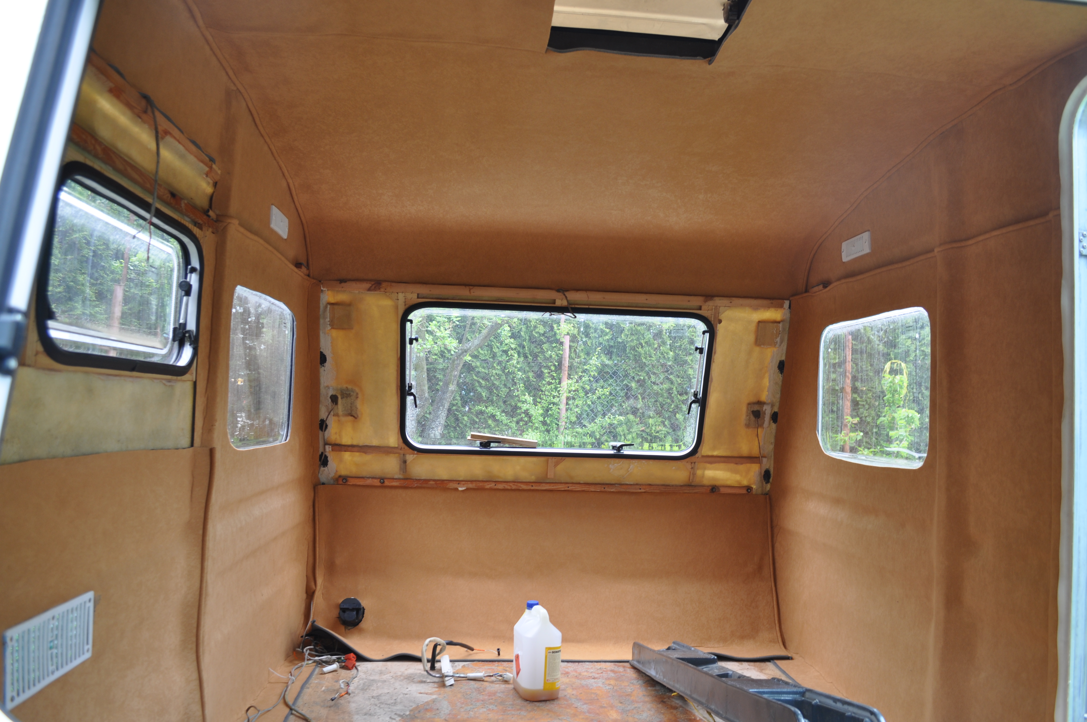 Przyszla pora na wnętrze , pamietam dlugi weekend majowy zamiast się byczyc to ja w przyczepie , z pomoca przybył kolega Slimak który pomógl przy wyklejeniu dachu bo nie wiem czy we dwójkę bysmy sobie poradzili. Na 6 rąk juz było lepiej.