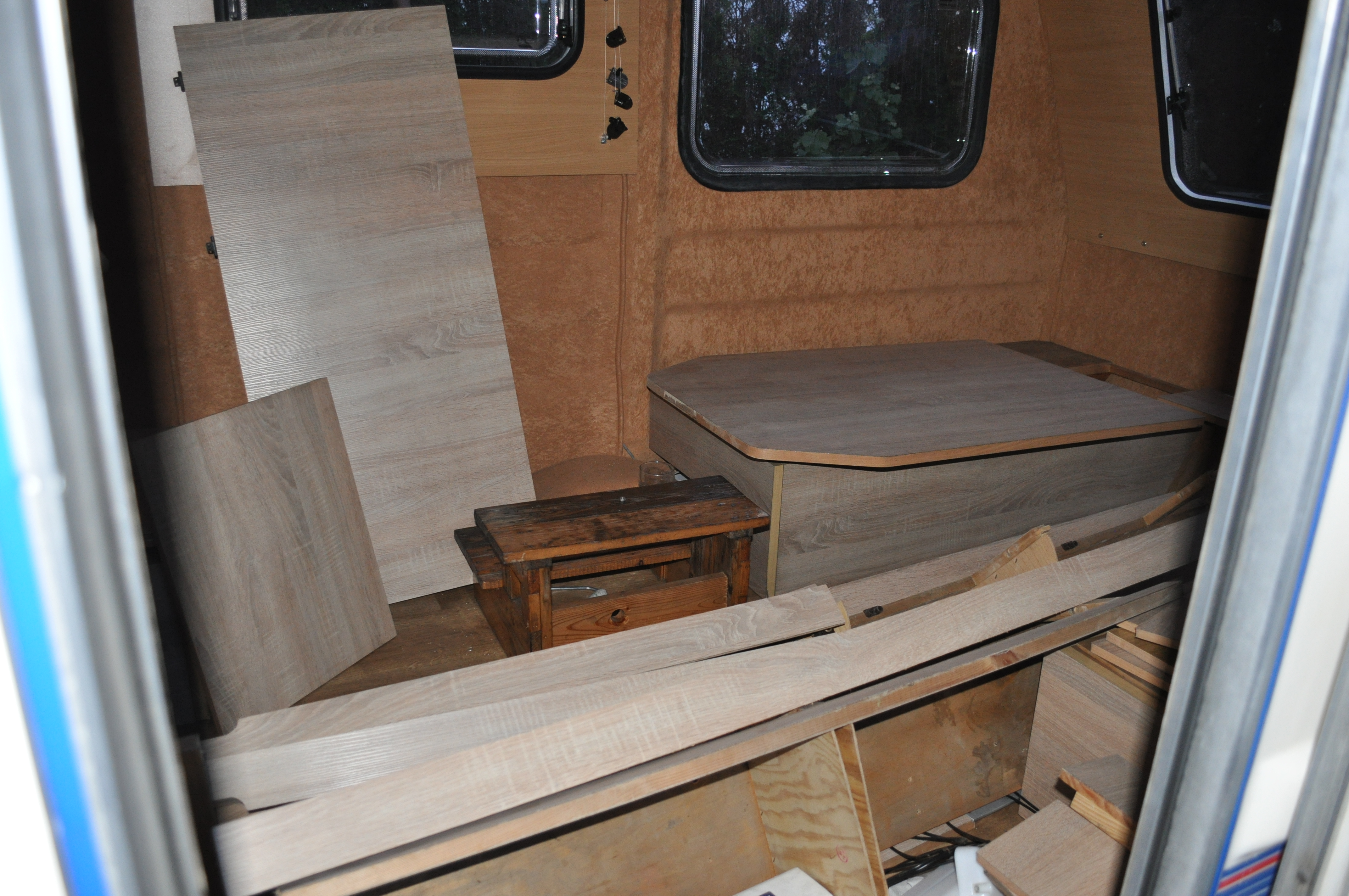 W hurtownii dostaliśmy fiszki i wybierajcie sobie... a wiemy chyba wszyscy jak się wybiera ze skrawka kilku centymetrowego wzór jaki ma byc na meblach... Znależliśmy wzór taki jak mamy na meblach w domu i stwierdziliśmy ze chyba zrobimy taki sam bo przynajmniej wiemy jak to wygląda na wiekszym elemencie... wybraliśmy jak to pan z hurtownii okreslił "najbardziej oklepany" Dąb Sonoma... No i teraz zamiast juz wkładac meble do środka to dalej walka. Dobrze ze te francowate wkręty udalo się odkręcic praktycznie wszystkie bez bólu, meble rozkręciłem na jak najmniejsze elementy się dało , wkręty prawie wszystkie w przyczepie wymieniłem na wkręty na "krzyżak", a gdzie się dało i widać to jest to nawet na torx bo w/g mnie estetyczniejsze łby mają. Fabrycznie mebla pozszywane na zszywki , rozlaziły się bo zszywki popuszczaly , więc je na wkręty poskręcalem , w niektórych miejscach od zewnątrz bo i tak nowy laminat je zakrywał, wreście nabralo to sztywności. No i jazda... jak remont praktycznie calej przyczepy robiłem tylko w weekendy , tak przez meble zawaliłem caly tydzień pracy, może w stolarni poszloby szybciej ale robilem to pierwszy raz , klej kontaktowy który mialem musiał odeschnąc prawie godzinę przed złączeniem dwóch elementów ze sobą i tak czas zleciał. Z szafki kuchennej została usunieta kuchenka,zrezygnowaliśmy całkowicie z gazu, przez lata mieliśmy zapiekankę z nową nie uzywaną kuchenką więc gazu w budzie się nigdy nie uzywalo , to i tu stwierdziliśmy ze zbędny gadzet to jest, wywaliliśmy równiez zlewozmywak. Ogolnie rozwiązanie które bylo czyli z zamykanymi klapkami zaslaniającymi zlew i kuchenke bylo kiepskim rozwiązaniem , nie ustawnym. Na wierzch szafki kuchennej trafił blat , i tu znów zapasy sklejki z odzysku się przydały , za blat posluzyła sklejka która kiedys byla podłoga w busie . Oczyszczona , wyszlifowana , oklejona trafiła na kuchenkę. W/g nas duzo praktyczniejsze rozwiązanie bo jest teraz gładki blat gdzie mozna nawet posilek sobie przygotować. Ale.... instalacji od zlewozmywaka nie usunąłem , w planie na przyszly rok może jest zlewozmywak taki jak w nowszych enkach , wpuszczony w ten blat co teraz jest i zamykany szklana plytą. Ale to z racji kosztów zostawilismy sobie na kiedy indziej bo do tanich widze on nie nalezy.