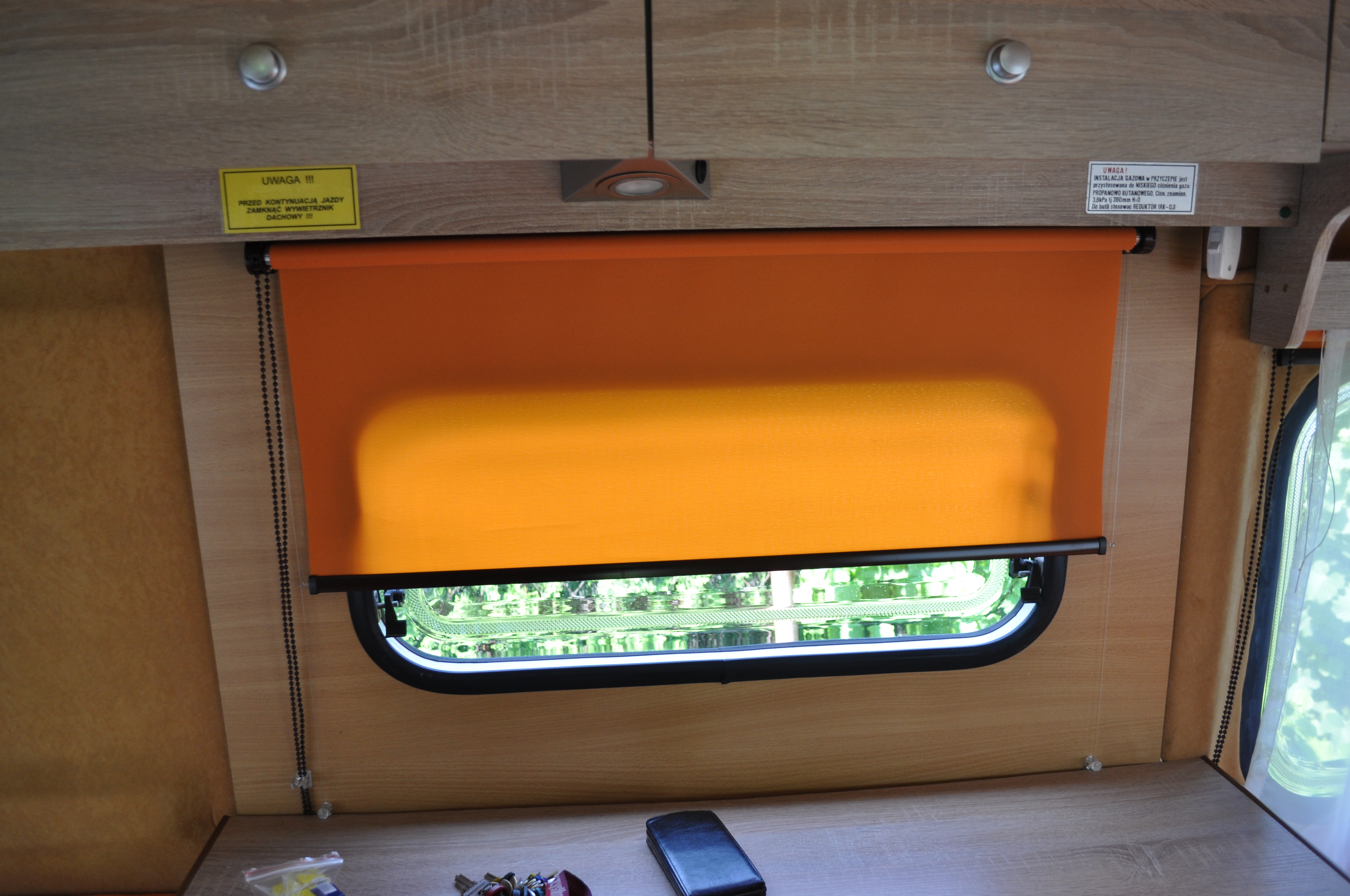 Oswietlenie z lamp trójątnych i zarówek na 12V. Rolety w oknach , poszliśmy z materacami w pomarańcz to i rolety takie zalozylismy.