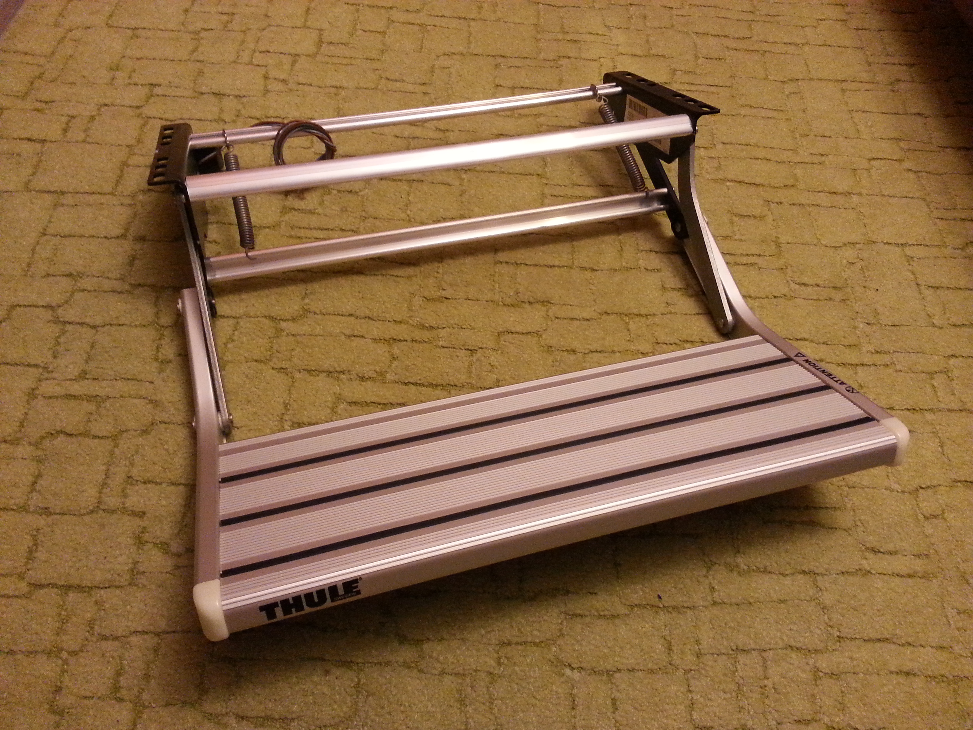 Przyszła paczka a w niej piękny kawał amelinium czyli manualny stopień. Wykonany naprawdę solidnie. Co ciekawe jest w nim zamontowany czujnik rozłożenia stopnia. W przyczepie raczej bezużyteczny ale w kamperze to już się może przydać. Koło czujnika -który zdemontuję- jest też zębatka gdyby w przyszłości zachciałoby się elektrycznego. Wystarczy tylko przykręcić do istniejących otworów silnik, zdjąć sprężyny i podłączyć elektrykę.