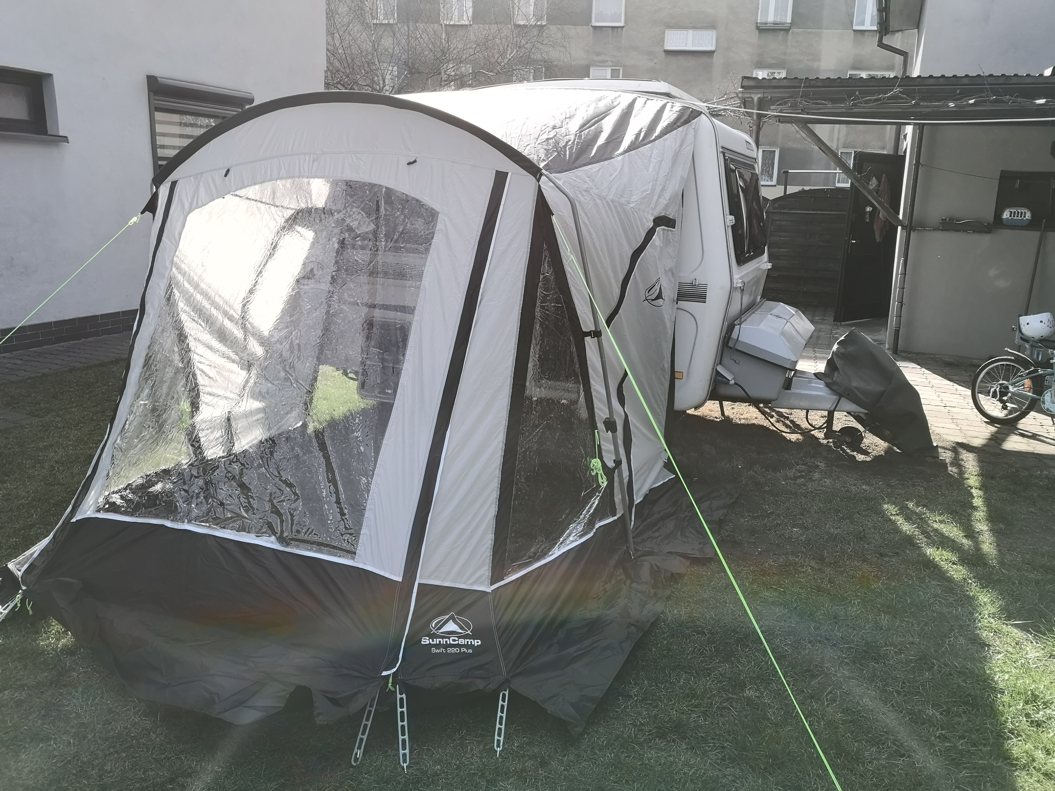 Fajnie. Ten patent od dawna chodził mi po głowie, jeszcze gdy jeździliśmy N-127. Myślałem o wożeniu dwóch "kołnierzy" dachu, jednego tradycyjnej moskitiery a drugiego w formie szczelnego materiału namiotowego. Ja tego nie zrealizowałem bo zmieniłem przyczepę ale od tamtej pory czasem nachodziła mnie taka myśl, dlaczego nikt się na takie rozwiązanie nie decyduje, skoro ogromnie poprawiłoby funkcjonowanie w przyczepie w czasie złej pogody, gdy więcej czasu spędzamy wewnątrz. Nawet ostatnio w Warce był ten temat poruszany.