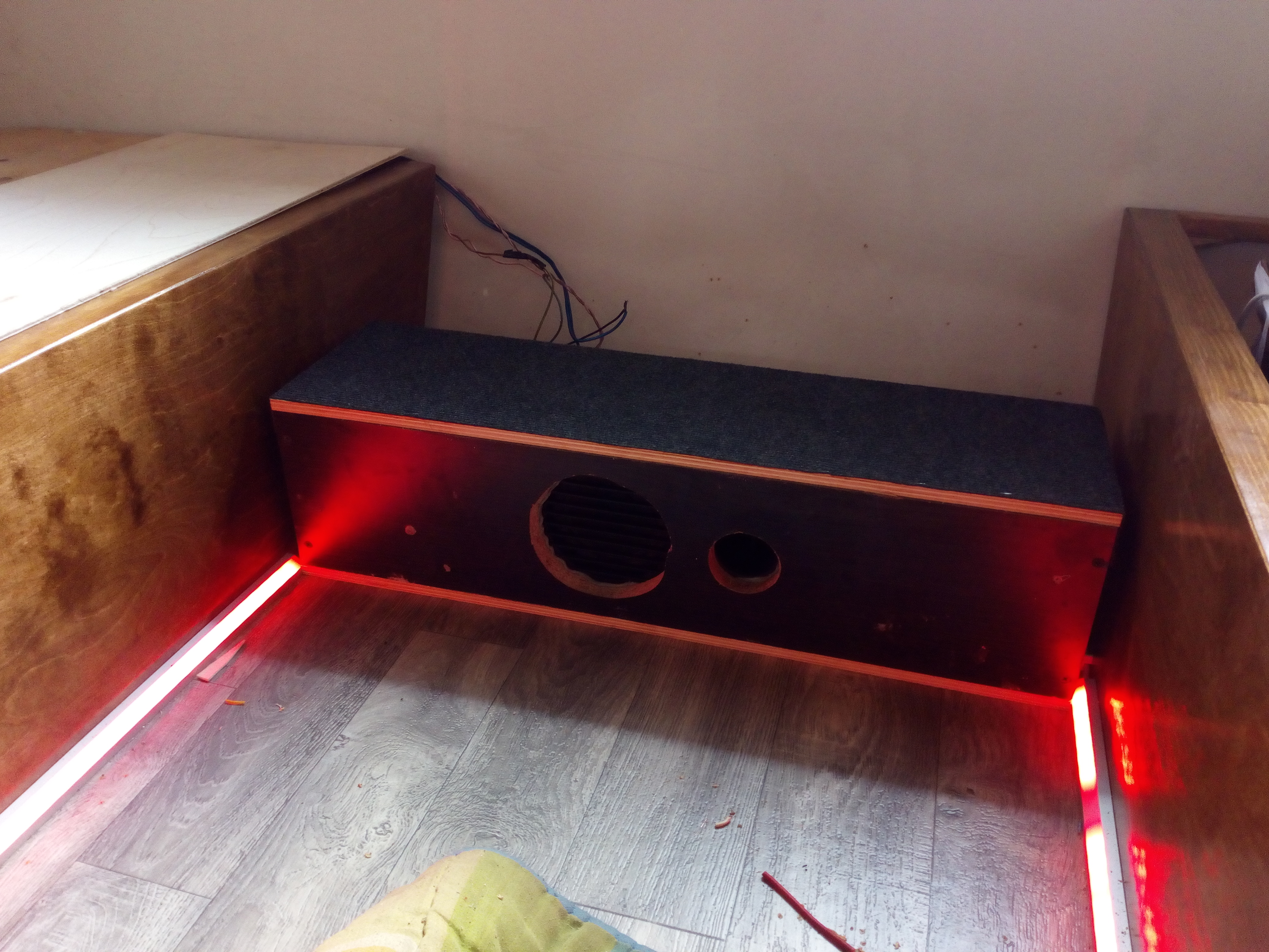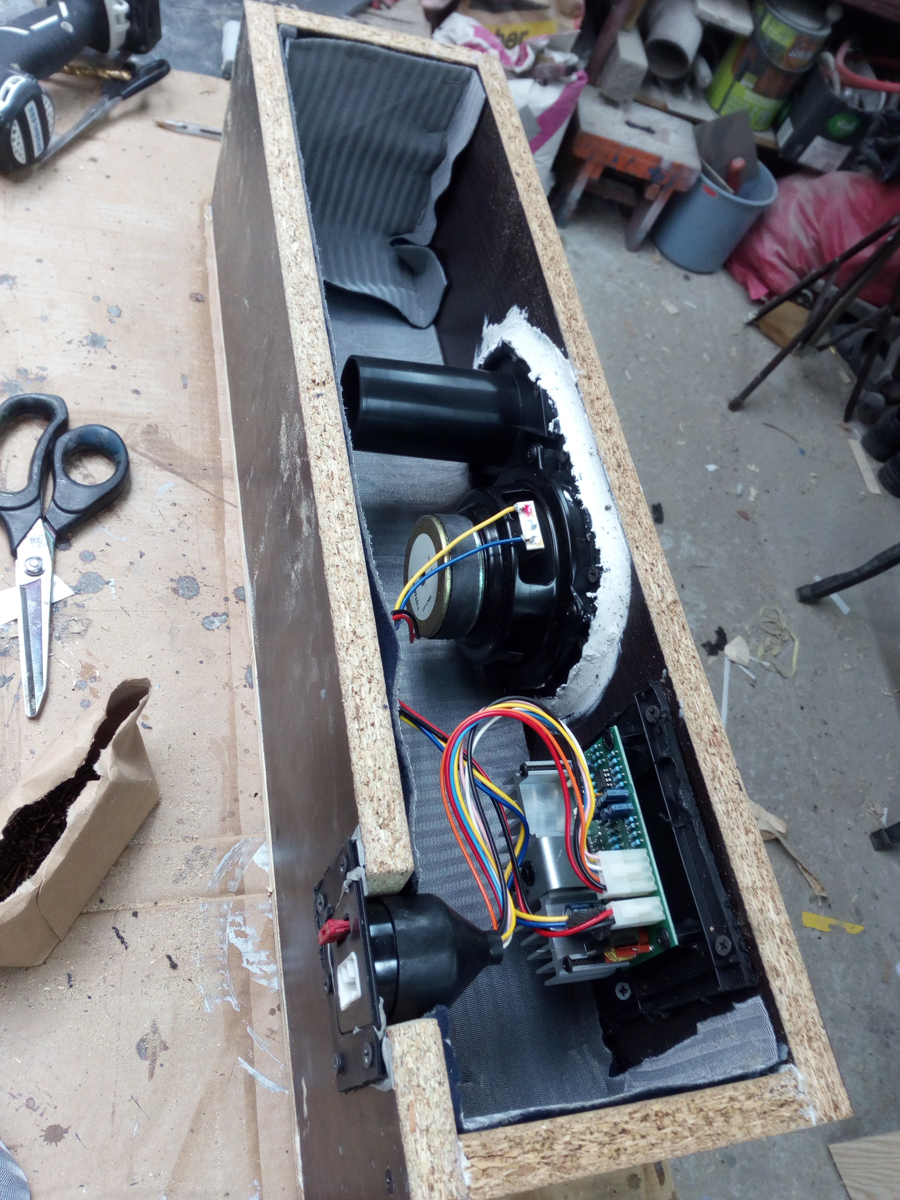 Oczywiście pytanie Eli - po co? .... Pomimo tego, że znaczek Tonsila to tylko znaczek. Sub jest Ask, dokładnie z Punto II ale po zrobieniu normalnej skrzyni robi robotę. Fajnie robi bas; jest mile odczuwalny przy czym tam jest śmieszny głośnik 15 cm, ale 2 omowy, 2 cewkowy. Dwa tylne kanały z radia idą tylko na jego wzmacniacz. Skrzynka jest odseparowana od mebli, a przede wszystkim przyczepy żeby w rezonans nie wpadała reszta. Efekt - nie będę pisał, trzeba posłuchać.