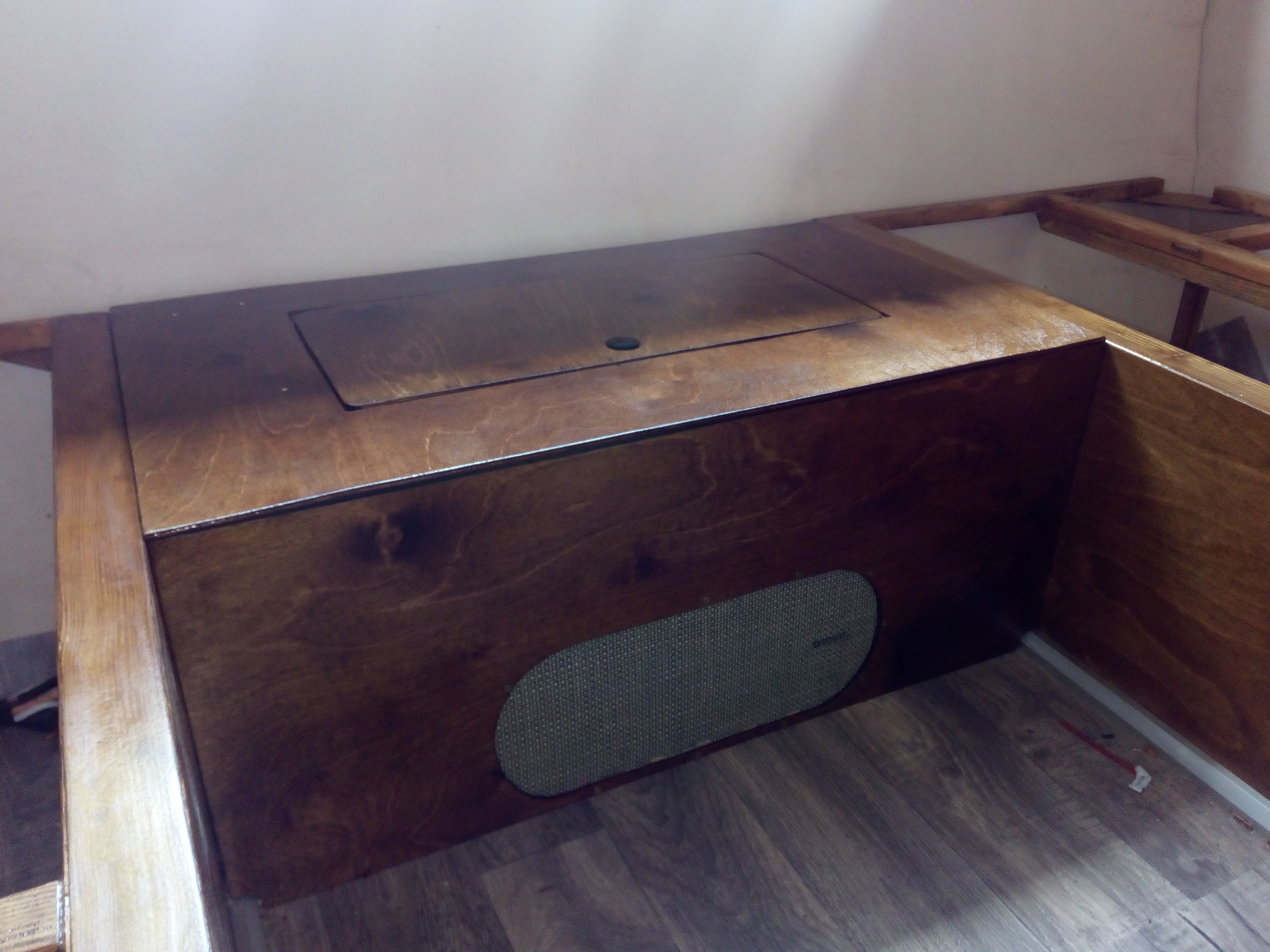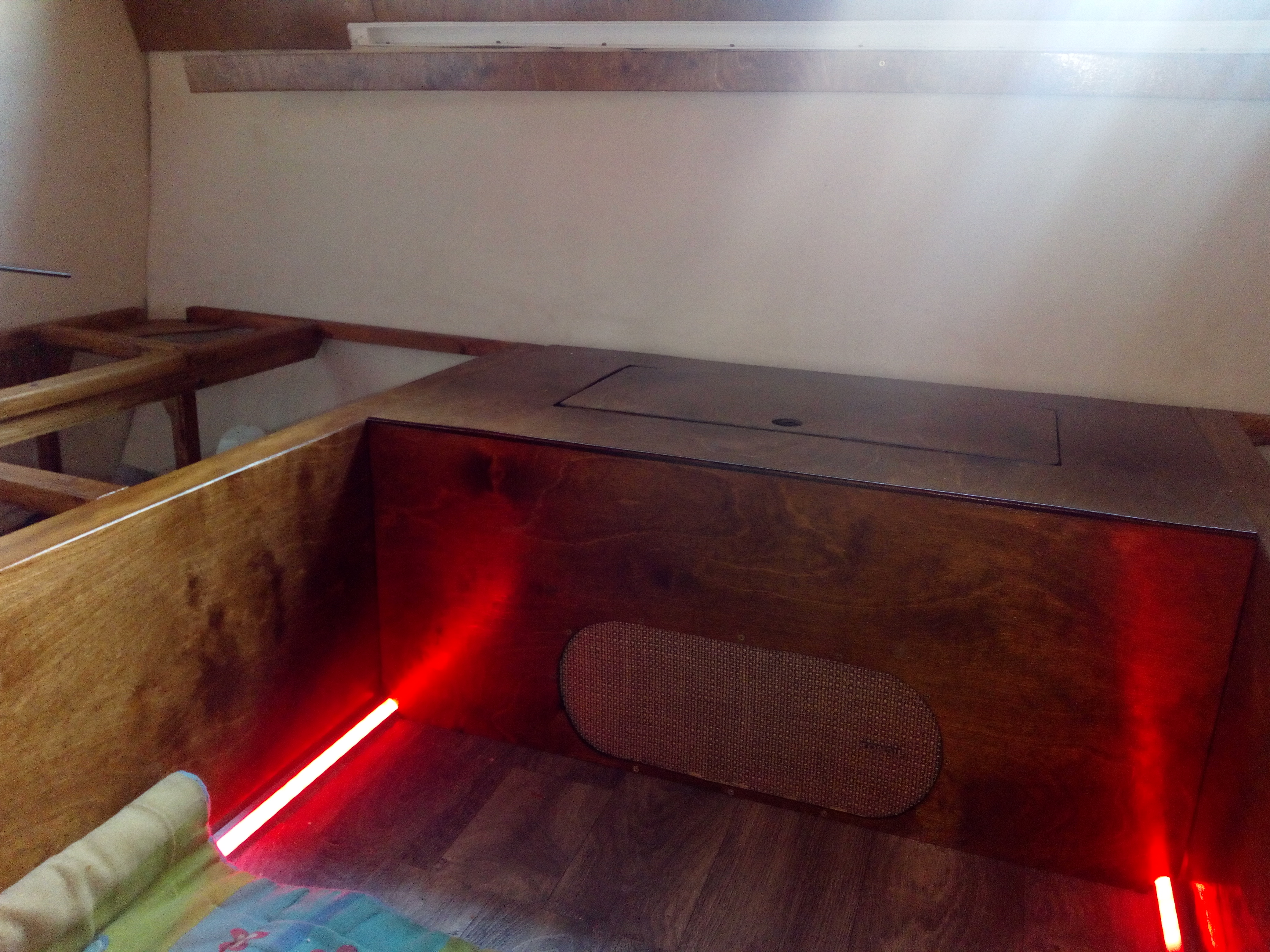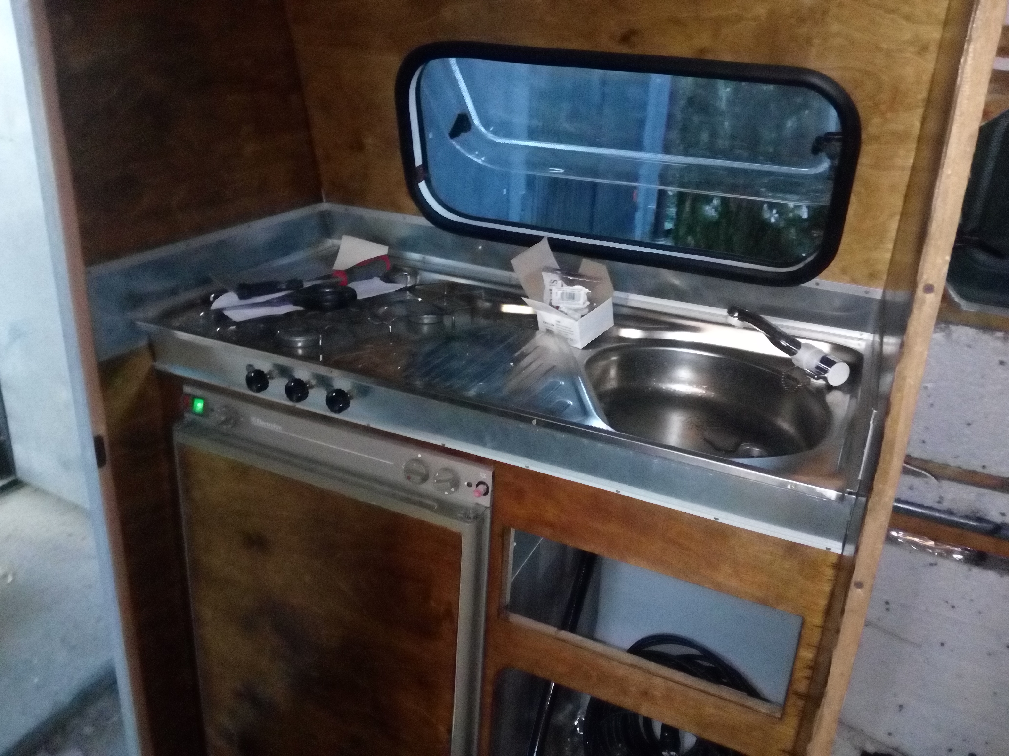 Tylną część kuferka zaślepiłem blachą na taśmę butylową i nity, stelaż do piecyka i pojawiła się ciepła woda w przyczepie. Szafka w części kuchennej też już jest z oświetleniem oraz do kuchenki dogiąłem jakąś blachę. Kiedyś to pomaluje i jakieś logo Niewiadów dam; na razie tak zostanie.