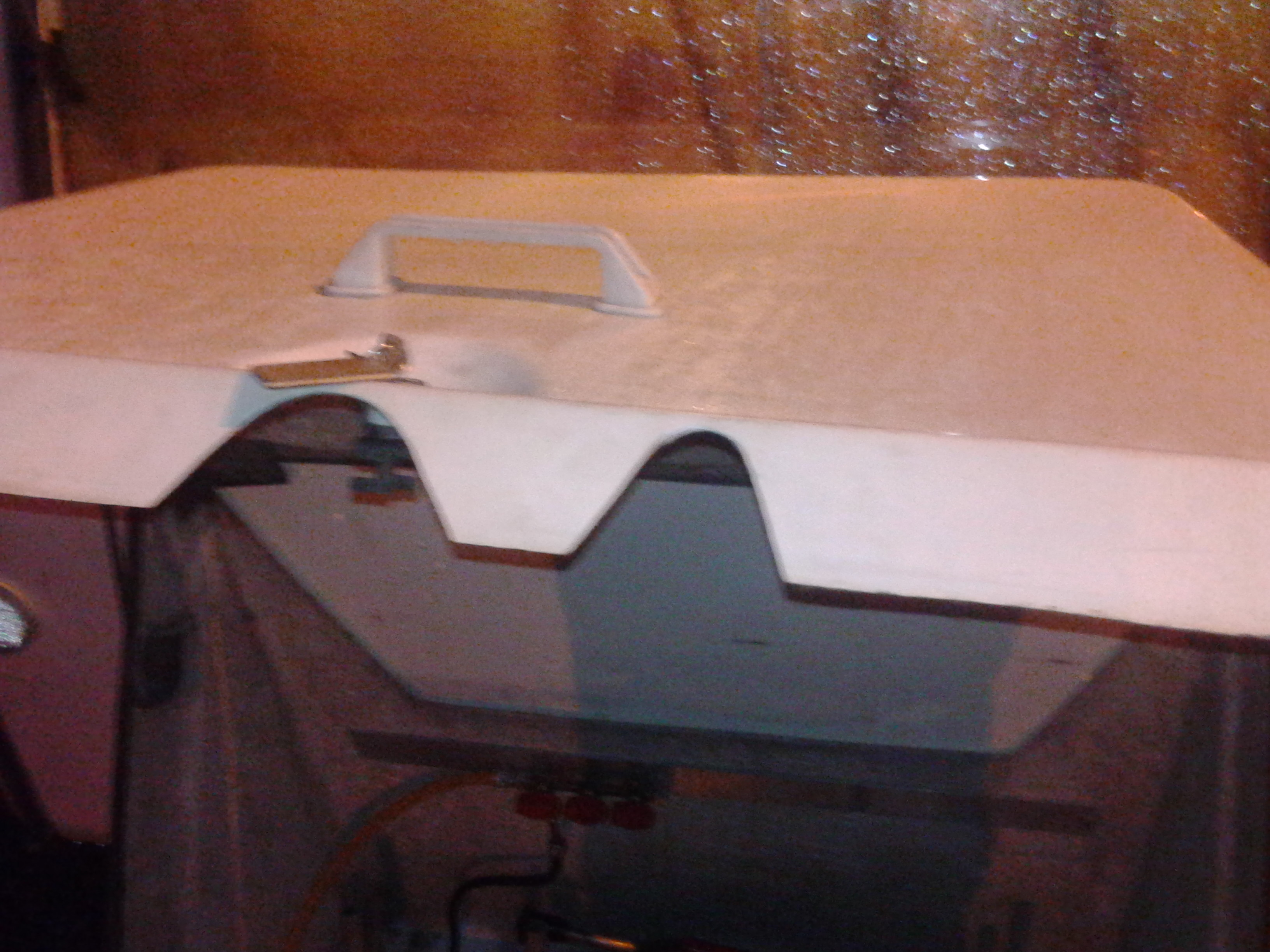 1. Klapa kufra zahacza o najazd przy otwieraniu. Są dwa wyjścia: albo podnieść kufer na profilach metalowych w górę 4cm, albo tak jak ja wyciąć wnękę na najazd w klapie kufra. Pierwsze rozwiązanie robił u siebie m.in. Grzesiek w swojej n132, któremu dziękuję przy okazji za łopatologiczne wyjaśnienia. Ja jednak zdecydowałem się nie podnosić kufra, tylko wyciąć w jego klapie wnękę, którą przechodzi najazd przy otwieraniu klapy. Użyłem otwornicy i piłki do metalu, pocięta krawędź laminatu wygładzona papierem ściernym. Zostanie to wykończone uszczelką, więc nie będzie straszyć tak jak na załączonym zdjęciu. Podpowiedź dla następców: ubierzcie długi rękaw i najlepiej maseczkę, chyba że chcecie się naszpikować kłującymi opiłkami żywicy, tak jak ja.