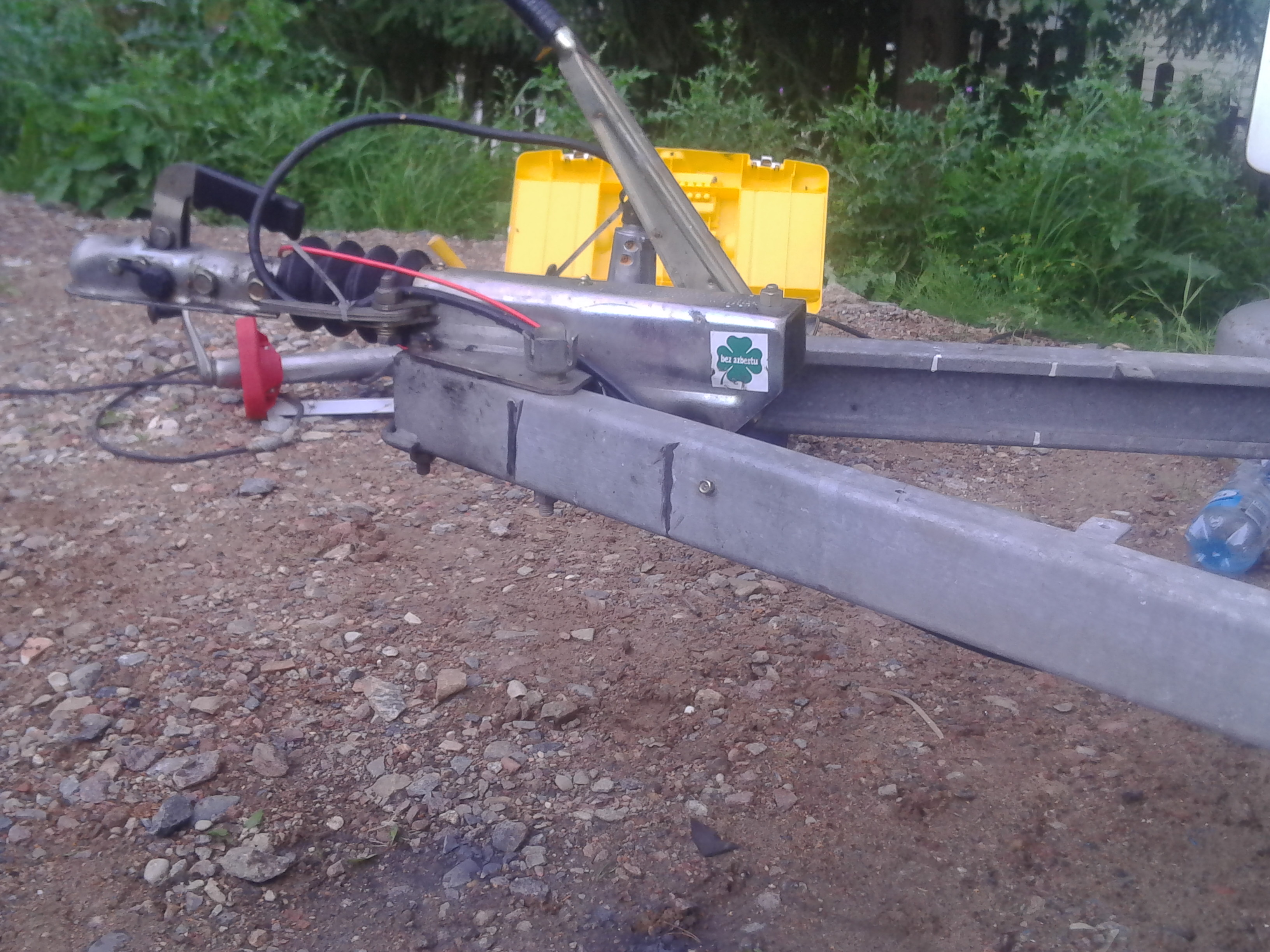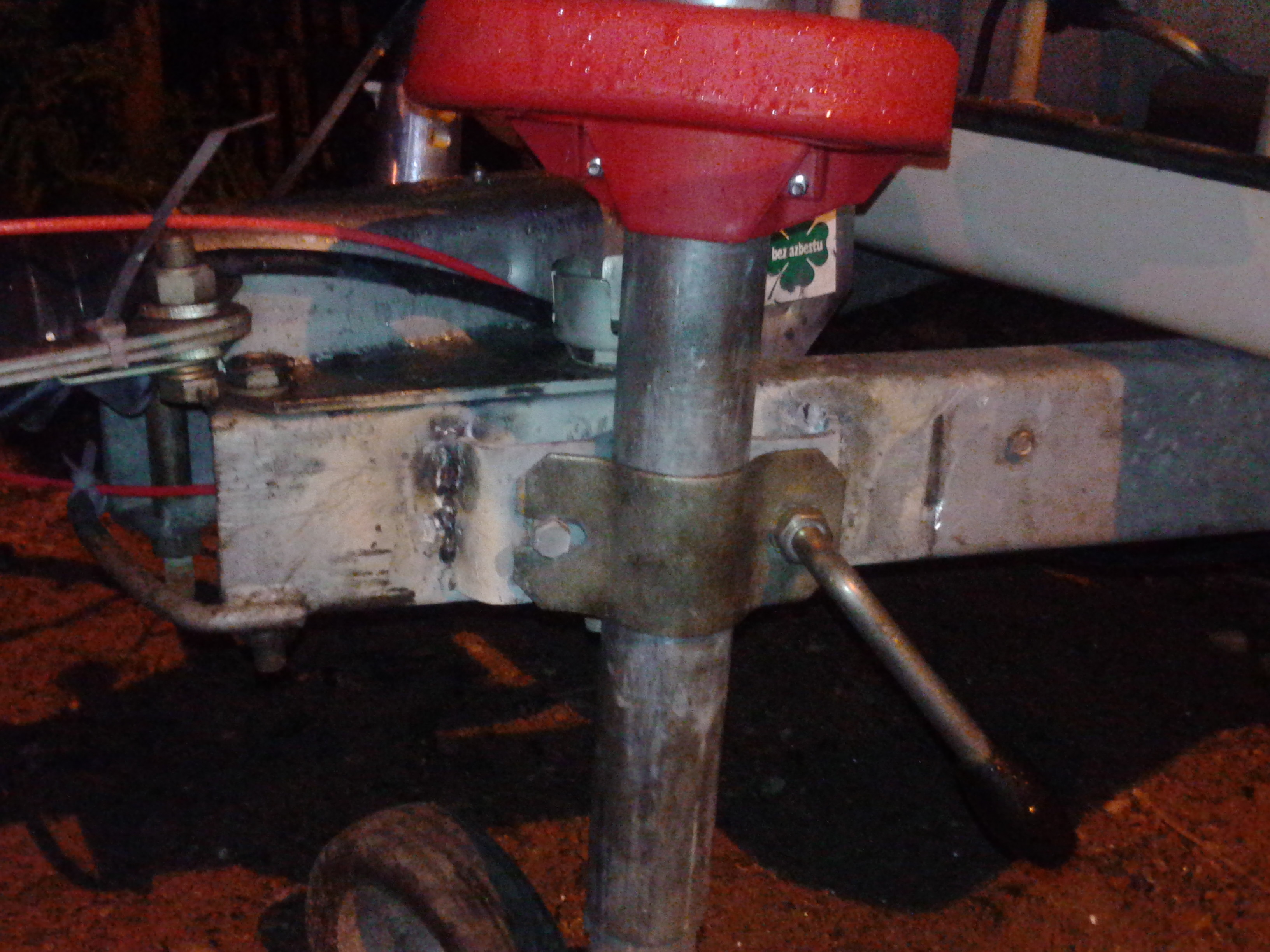 2. Klapa kufra zahacza o słupek kółka manewrowego. Tu cudów nie ma. Uchwyt koła (mocowanie obejmy przy dyszlu) trzeba przenieść do przodu dyszla, uprzednio wyciąwszy go ze starego miejsca. W nowym miejscu spawamy, ewentualnie montujemy nową zakupioną obejmę. Wycięcie i spawanie kosztowało mnie 20zł bo nie umiem spawać, trzyma zapewne lepiej niż kiepska obejma z marketu.